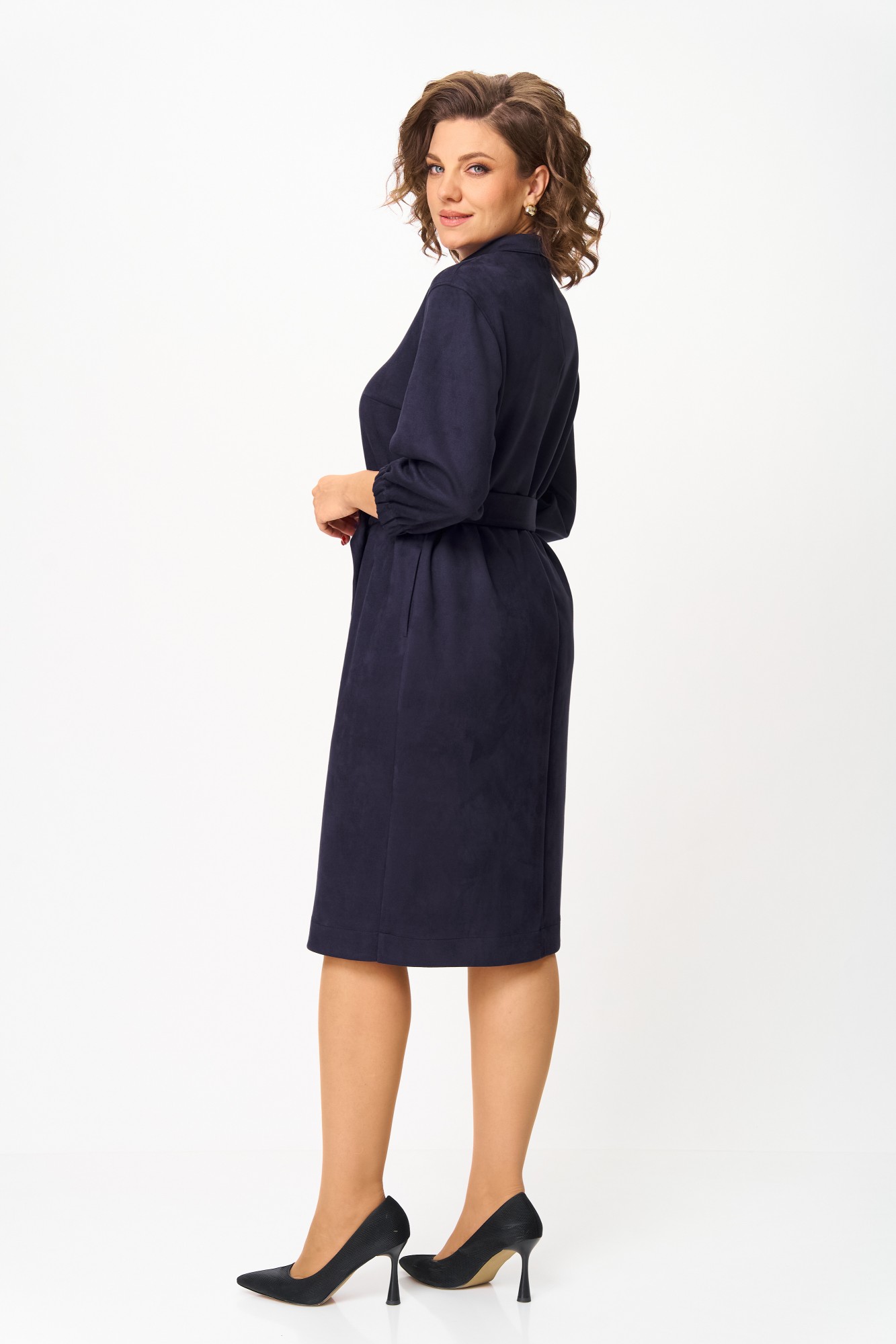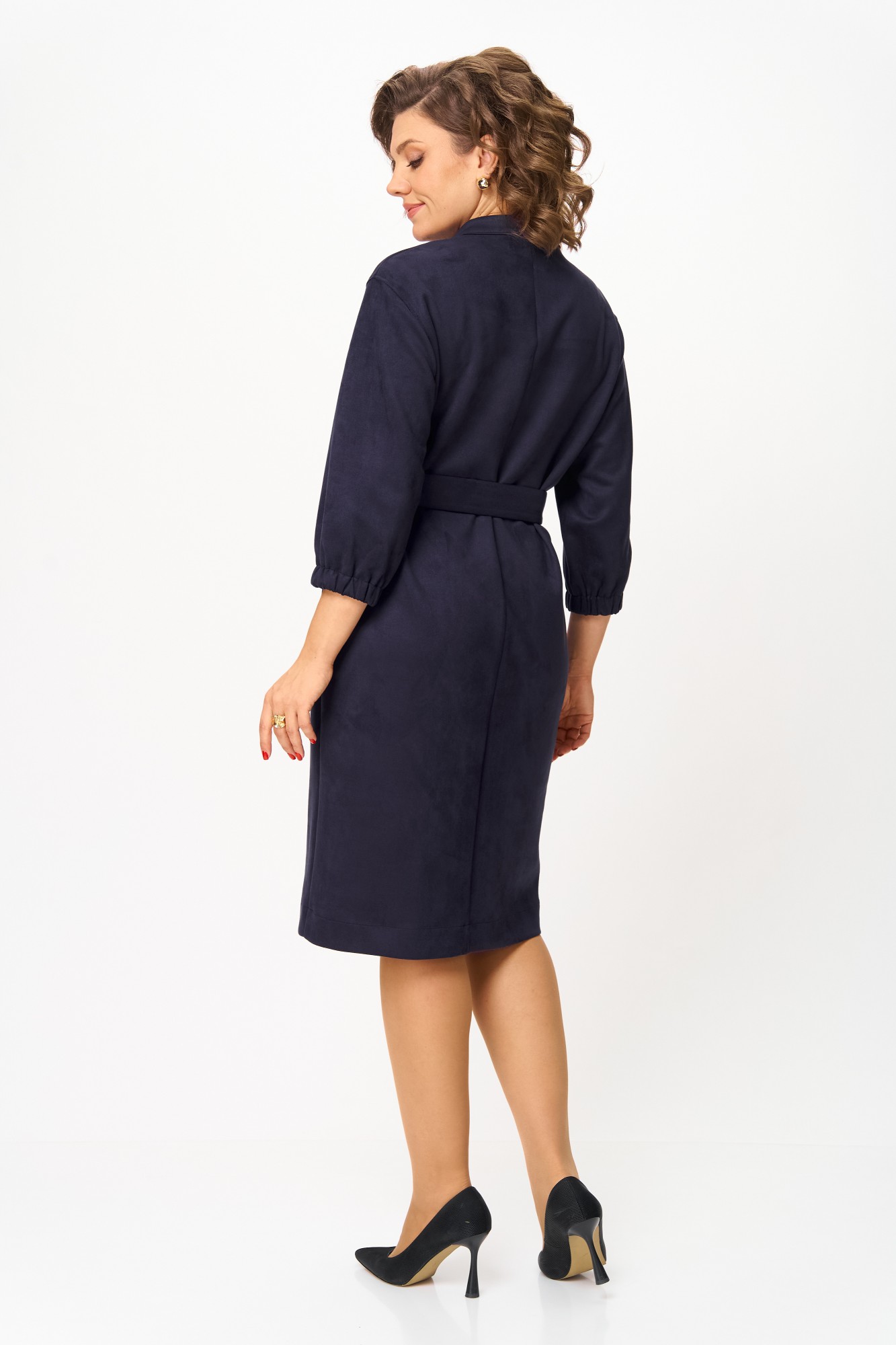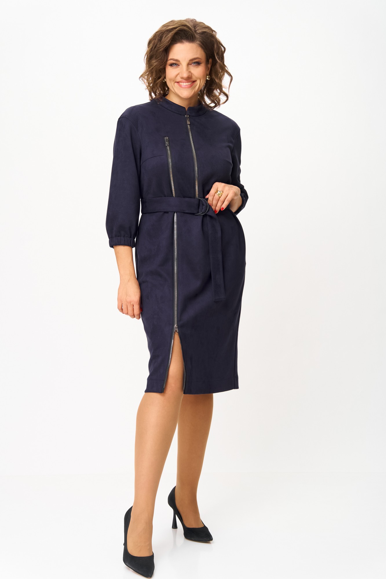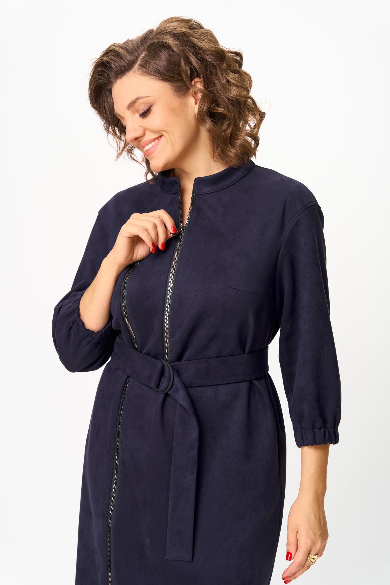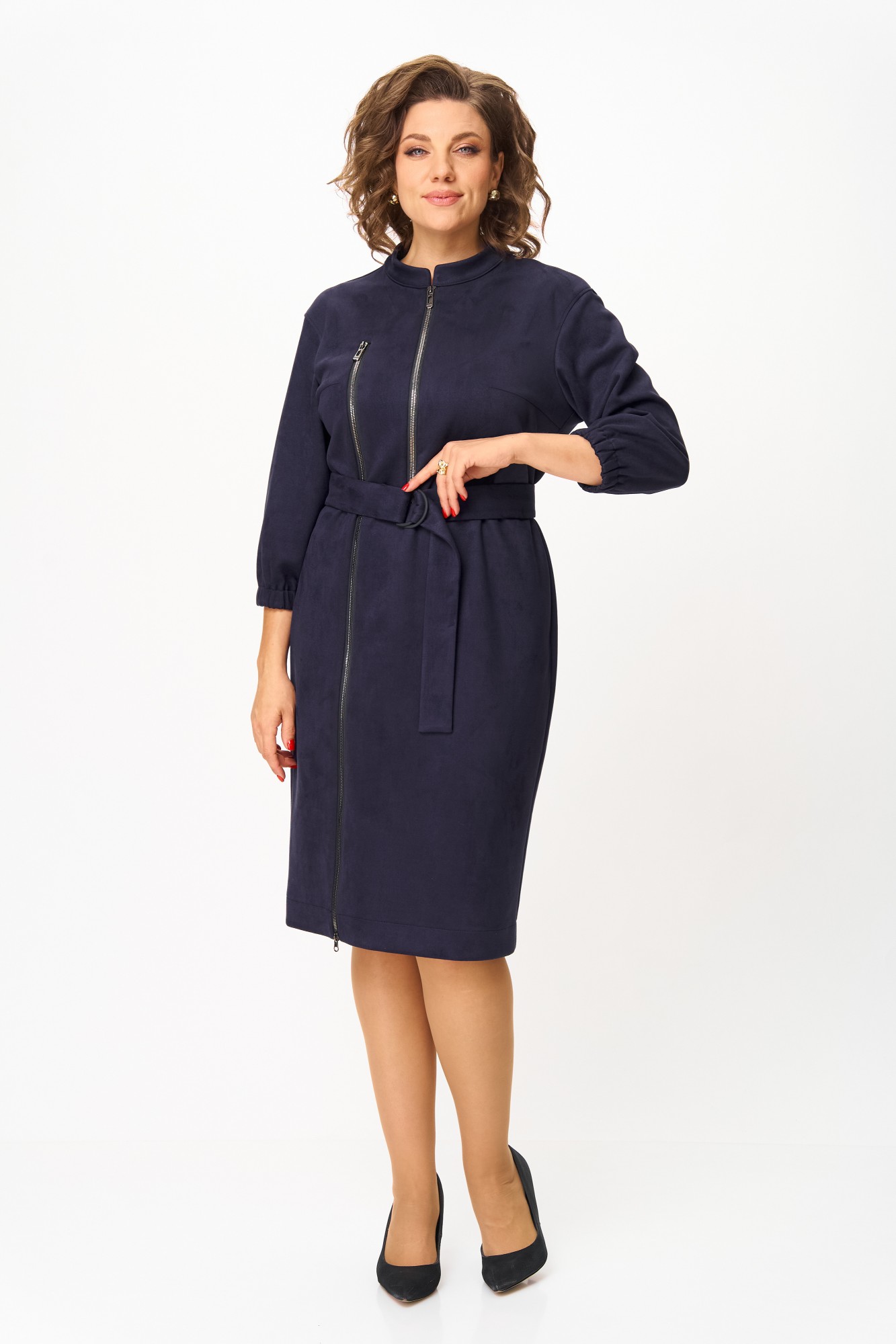Элегантное женское платье из ткани искусственная замша. Платье полуприлегающего силуэта. По переду платье декорировано двумя рядами молнии. Горловина оформлена воротником стойка, в боковых швах на уровне бедер карманы. Спинка с центральным швом. Линия плеча спущена. Рукава втачные, длина ¾, низ на резинке.