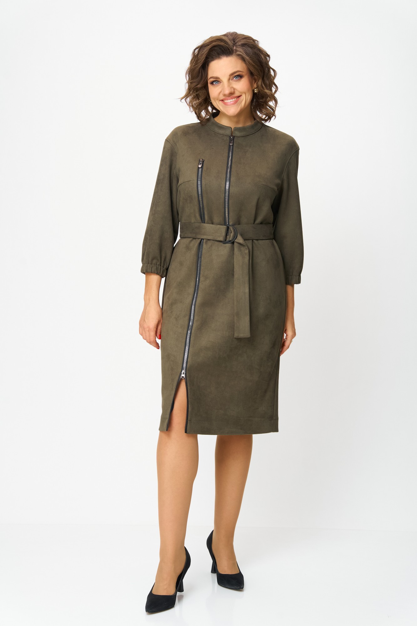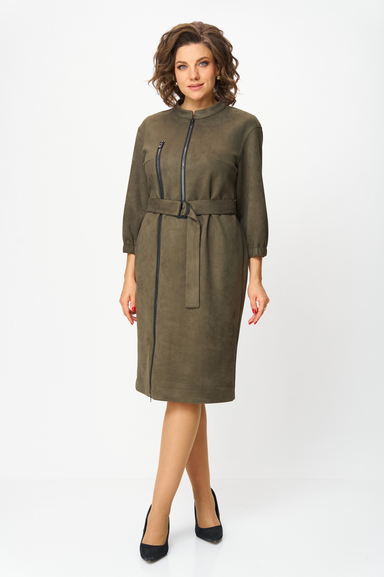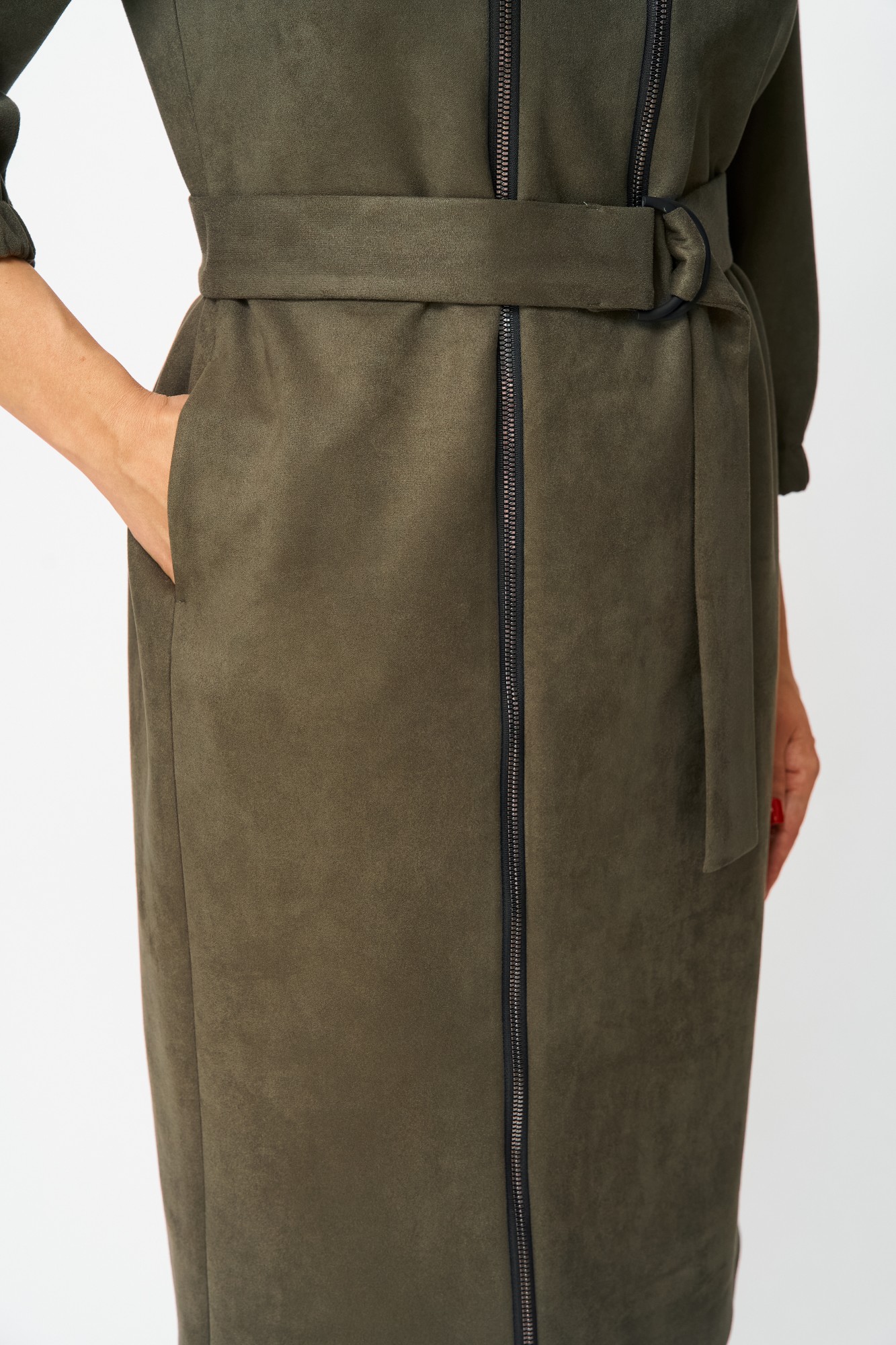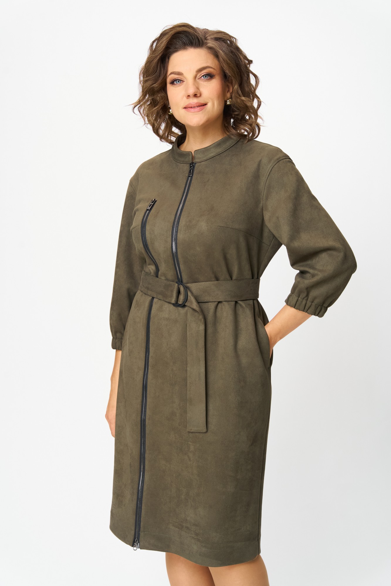 Элегантное женское платье из ткани искусственная замша. Платье полуприлегающего силуэта. По переду платье декорировано двумя рядами молнии. Горловина оформлена воротником стойка, в боковых швах на уровне бедер карманы. Спинка с центральным швом. Линия плеча спущена. Рукава втачные, длина ¾, низ на резинке.