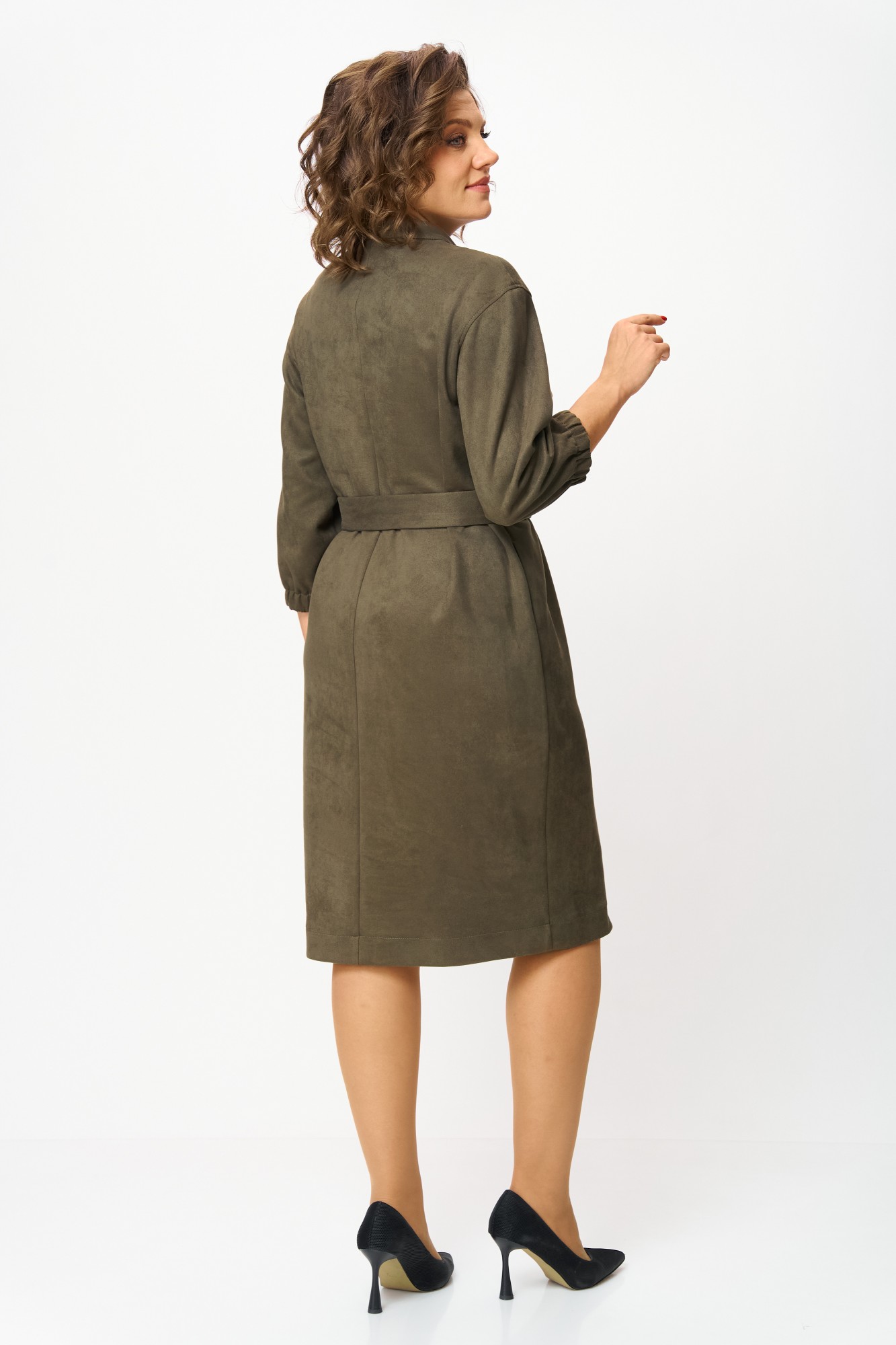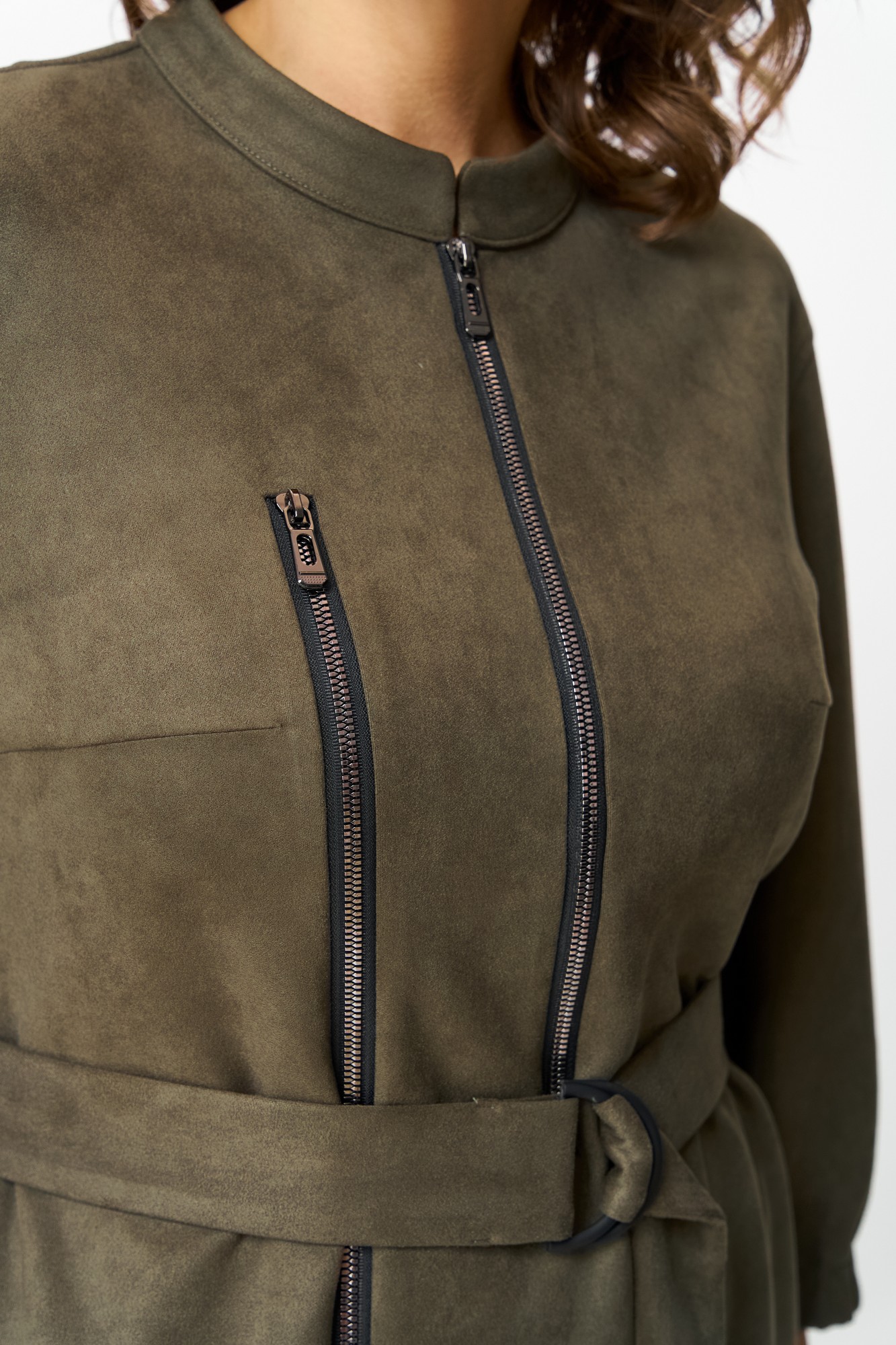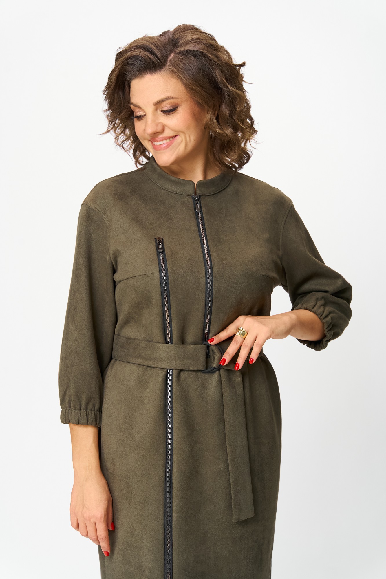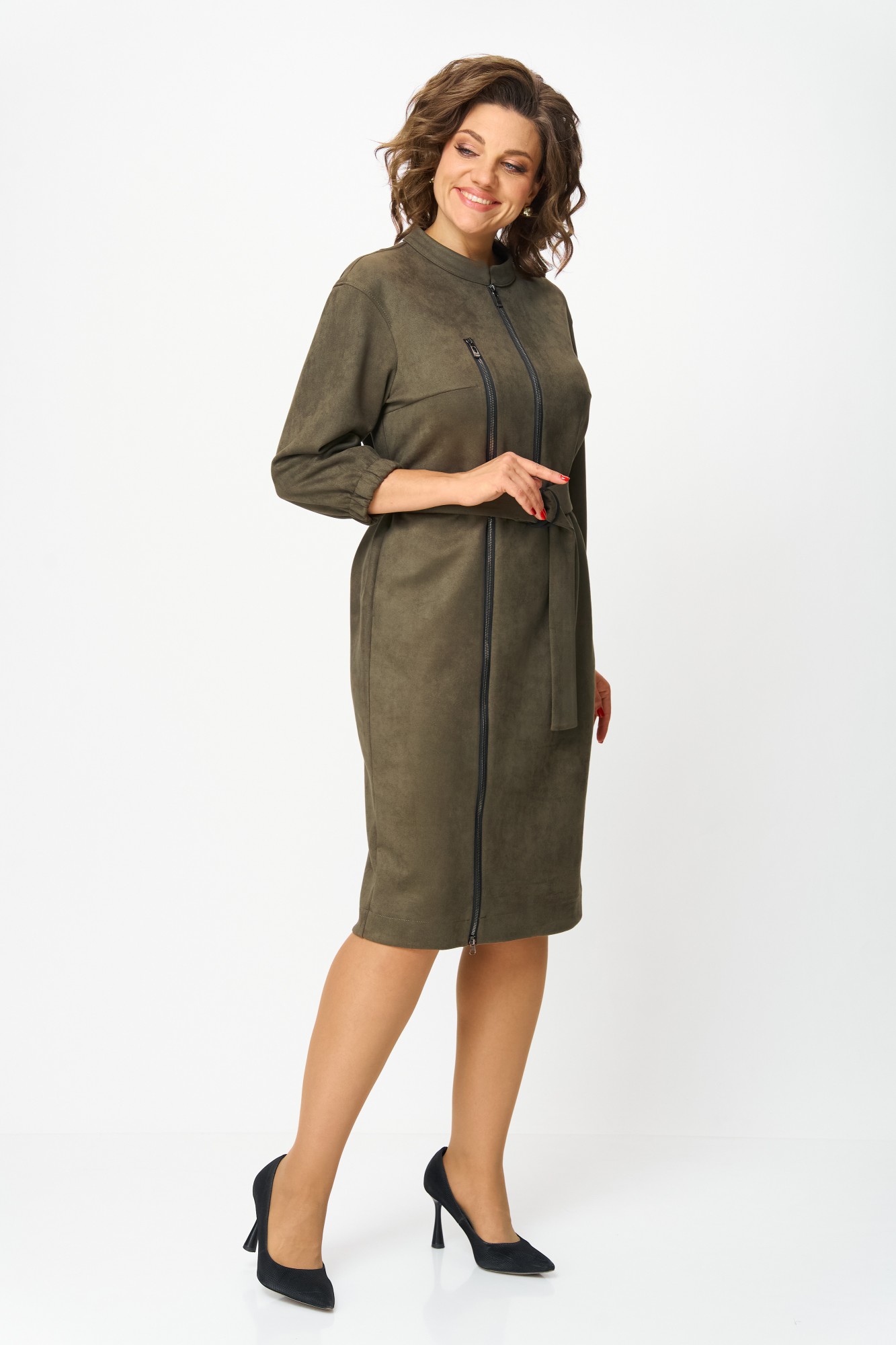Элегантное женское платье из ткани искусственная замша. Платье полуприлегающего силуэта. По переду платье декорировано двумя рядами молнии. Горловина оформлена воротником стойка, в боковых швах на уровне бедер карманы. Спинка с центральным швом. Линия плеча спущена. Рукава втачные, длина ¾, низ на резинке.