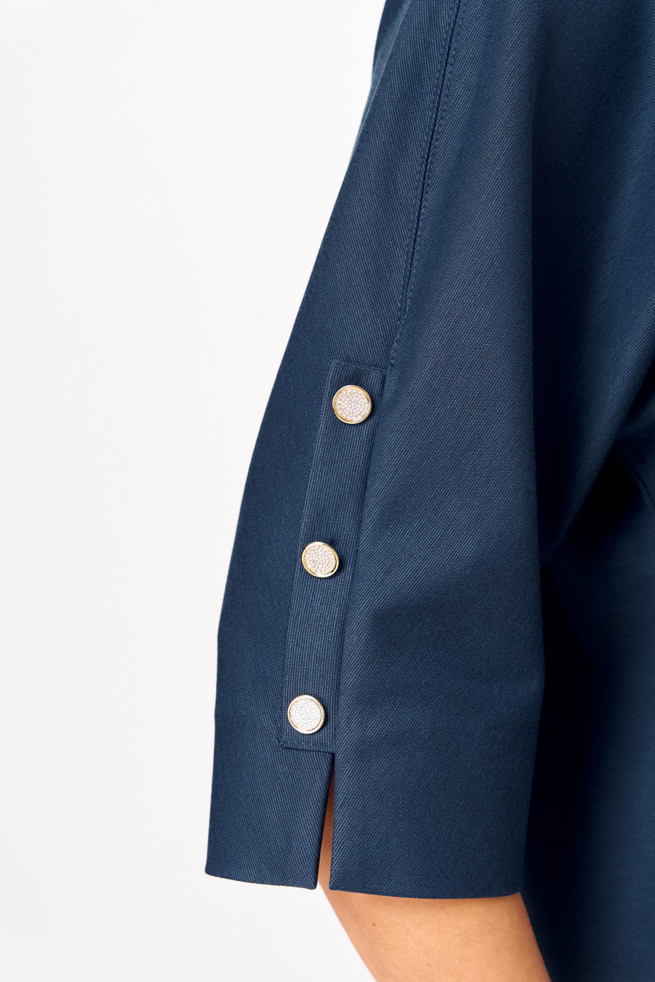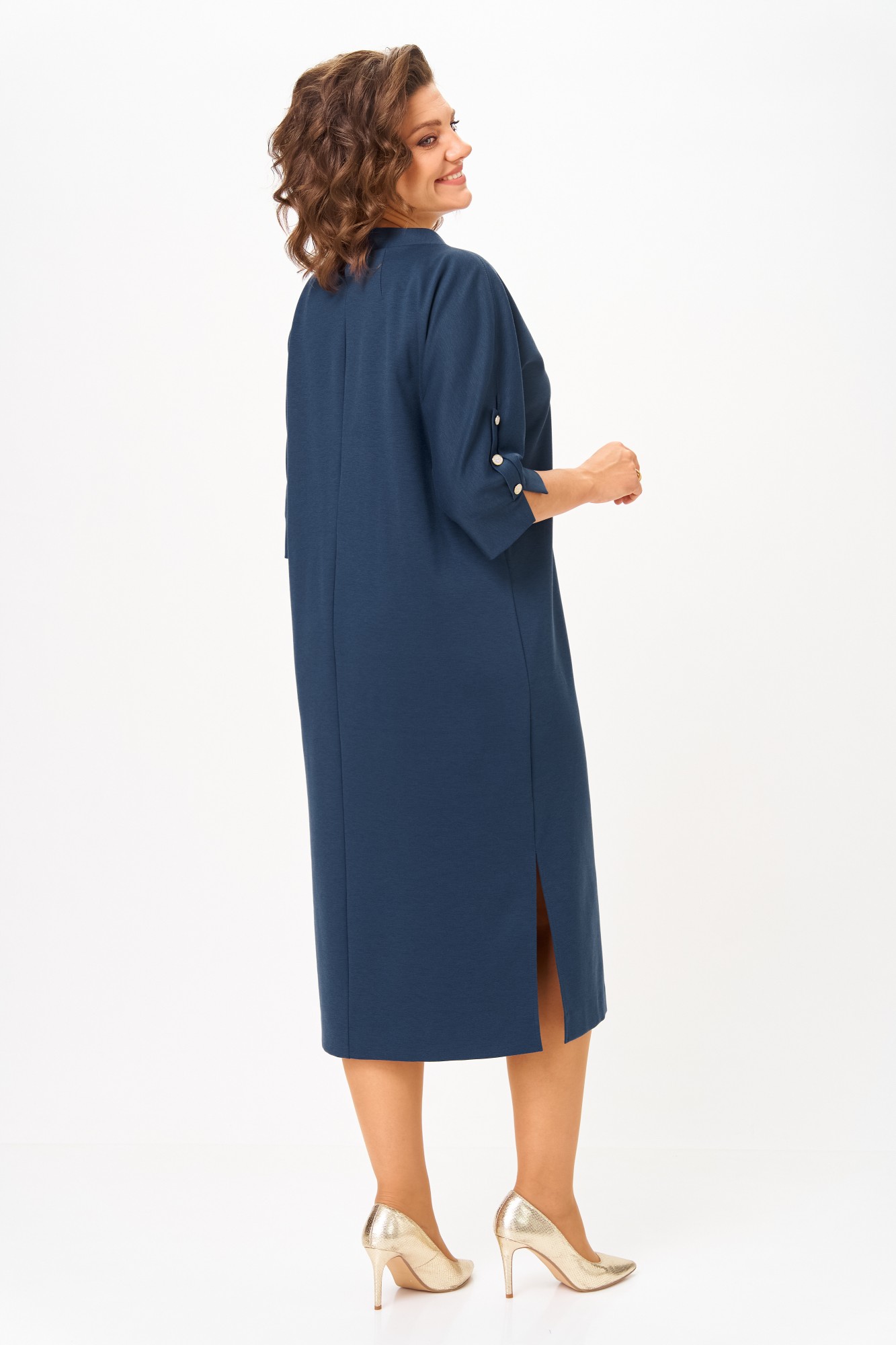 Платье полуприлегающего силуэта из трикотажного полотна с цельнокроеным рукавом длиной три четверти. В верхнем шве рукава обработана декоративная планка с пуговицами и разрез по низу. Горловина широкая с воротником-стойка. Со стороны спинки в воротнике обработана застежка с навесными петлями и пуговцами. Вдоль шва горловины расположены декоративные пуговицы. В боковых швах обработаны разрезы. Платье с декоративным поясом из основной ткани и шлевками в боковых швах. Платье без подкладки.