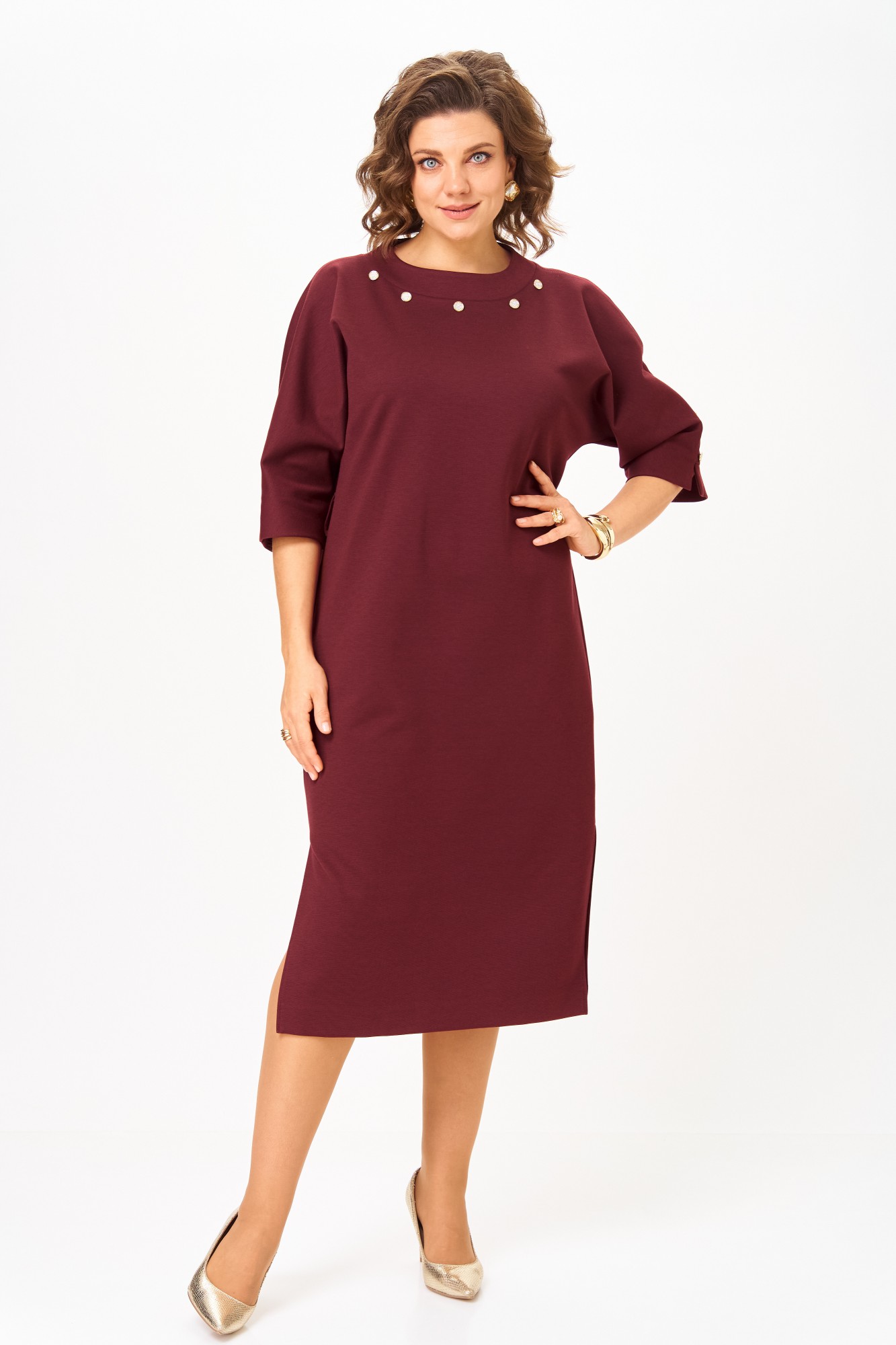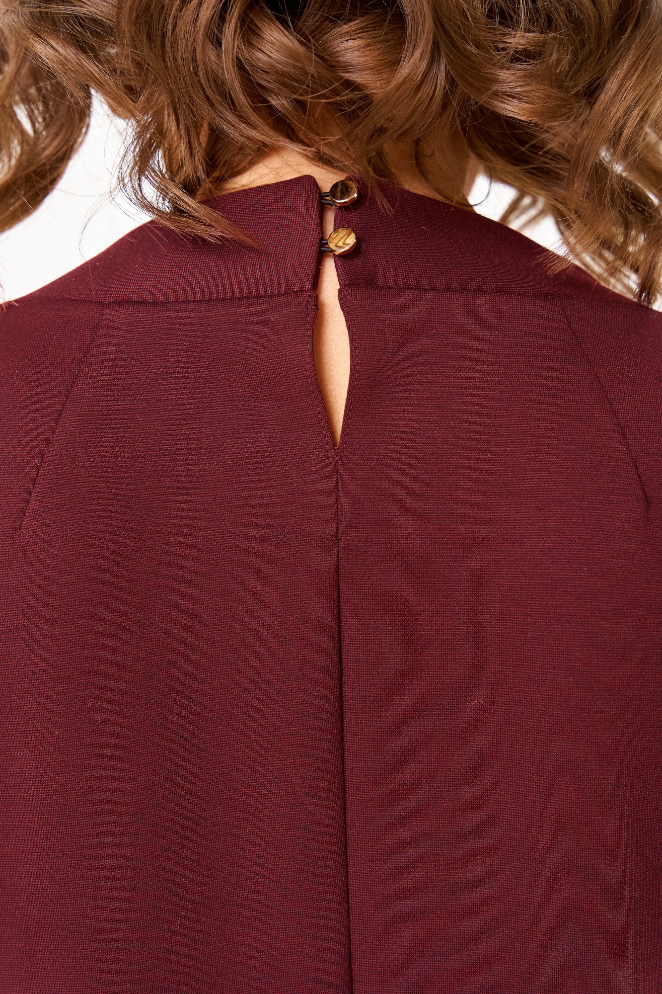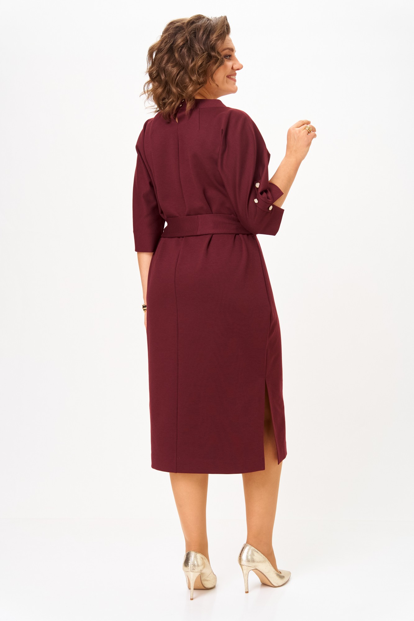 Платье полуприлегающего силуэта из трикотажного полотна с цельнокроеным рукавом длиной три четверти. В верхнем шве рукава обработана декоративная планка с пуговицами и разрез по низу. Горловина широкая с воротником-стойка. Со стороны спинки в воротнике обработана застежка с навесными петлями и пуговцами. Вдоль шва горловины расположены декоративные пуговицы. В боковых швах обработаны разрезы. Платье с декоративным поясом из основной ткани и шлевками в боковых швах. Платье без подкладки.
