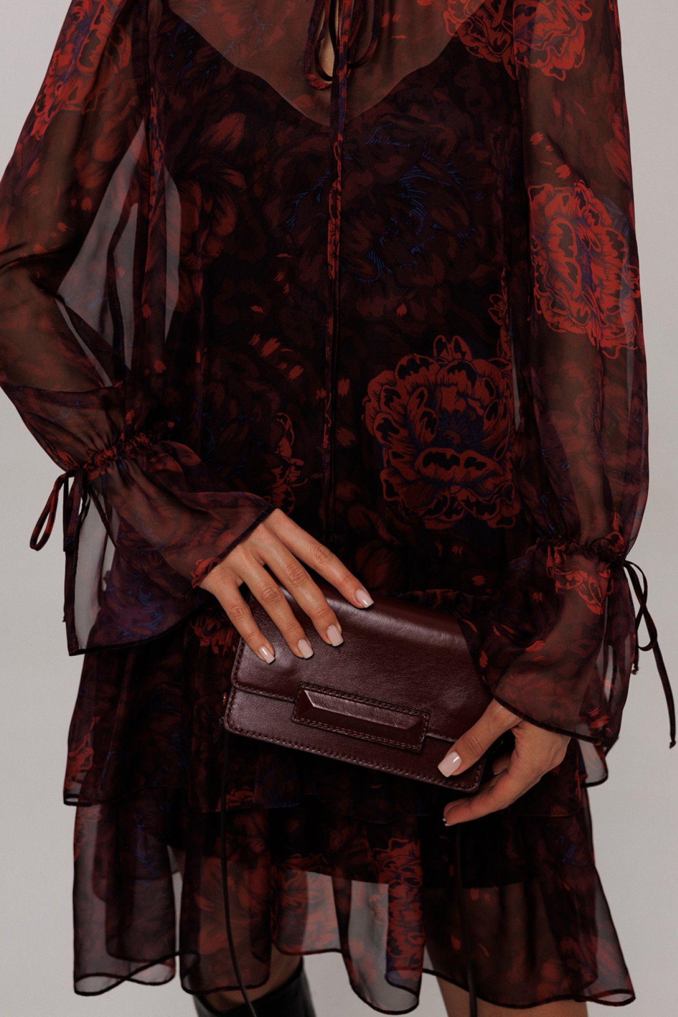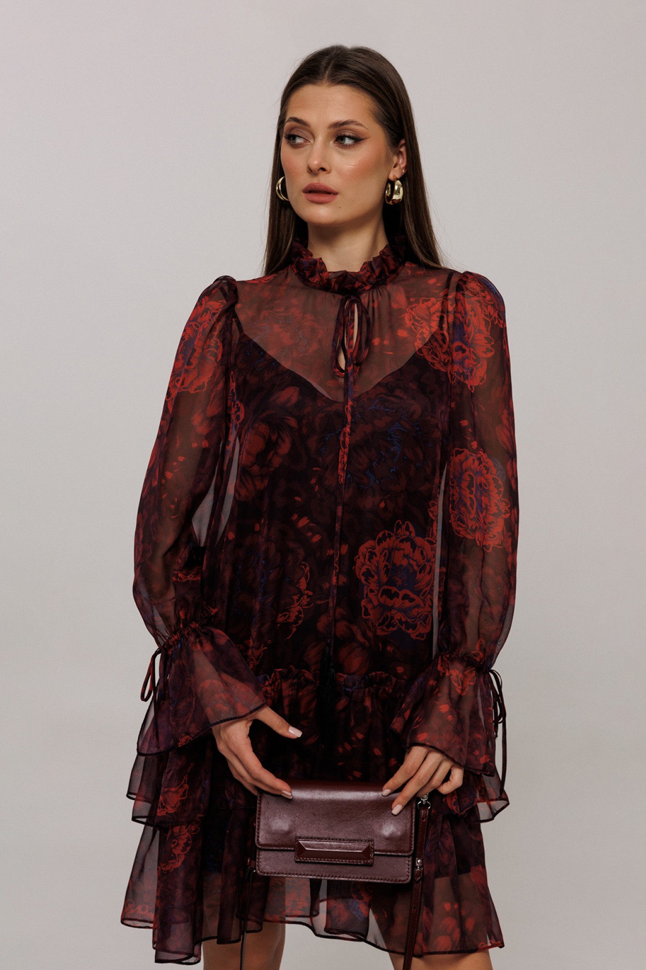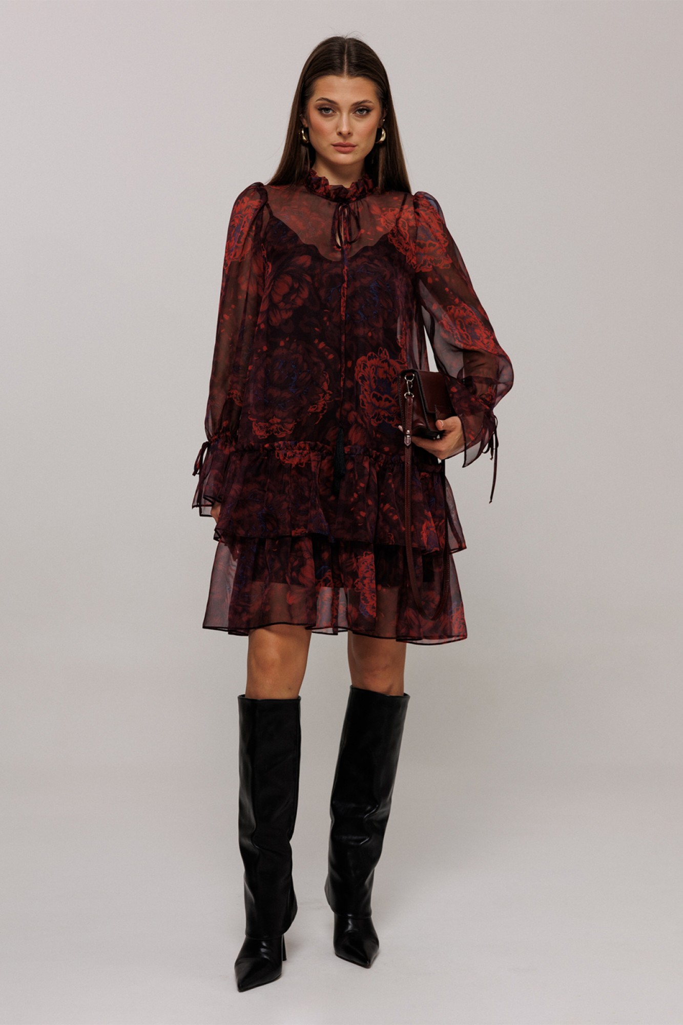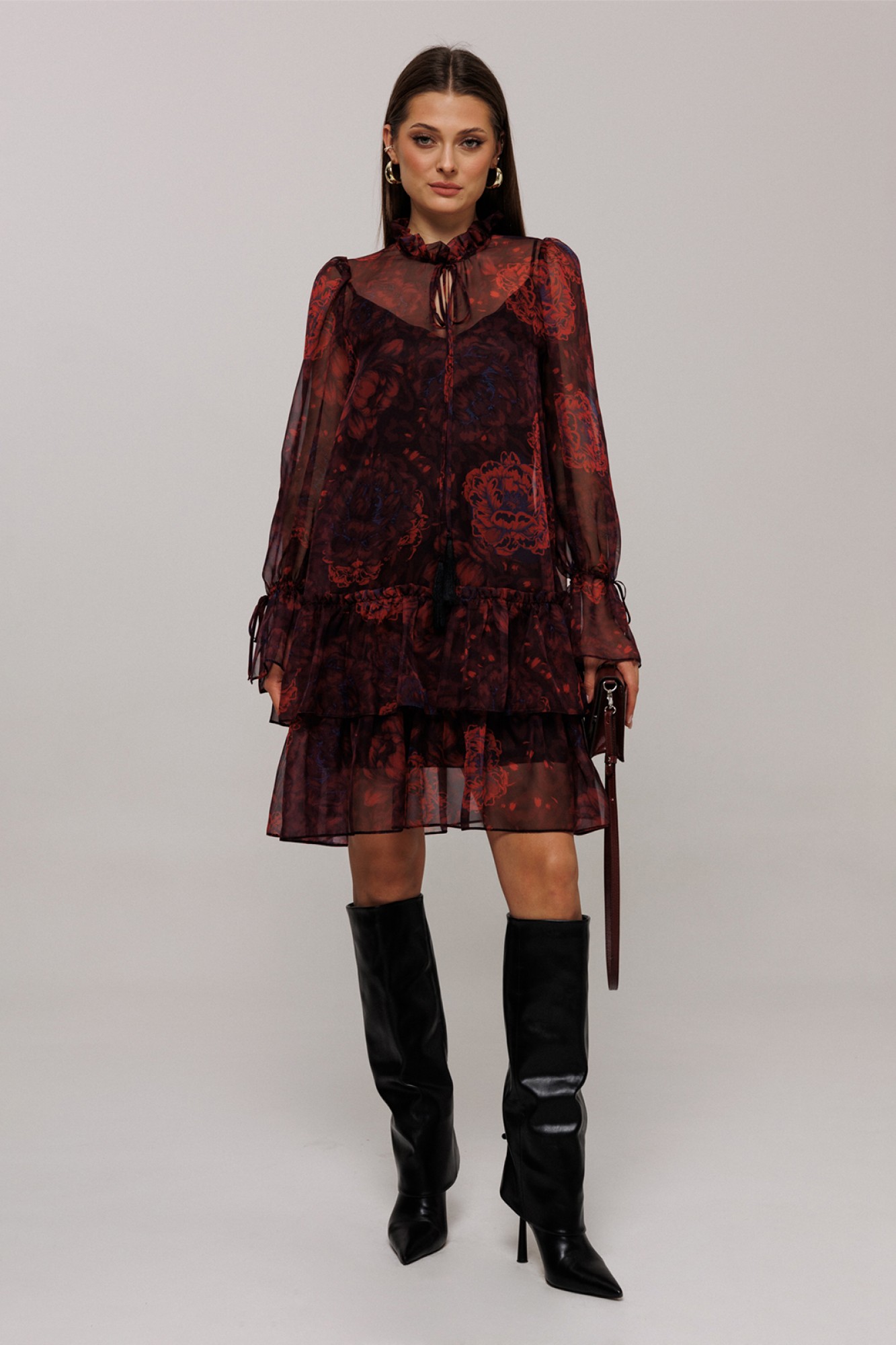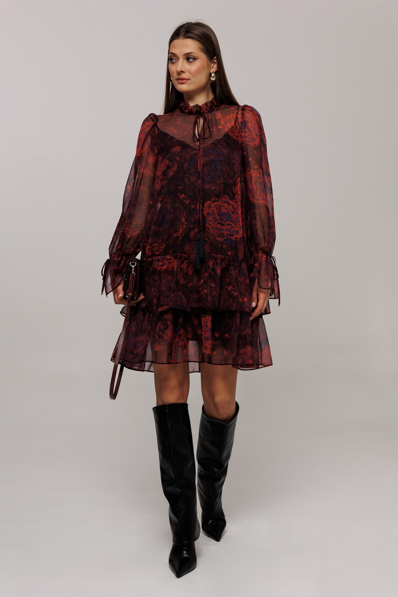 Платье шифоновое А-силуэта. Втачной длинный рукав со сборкой по окату и внизу на завязке. Полочка и спинка с притачными слегка присборенным воланом с рюшей. Воротник стойка-рюша и вырезом каплей по переду на завязке. Платье на подкладке.