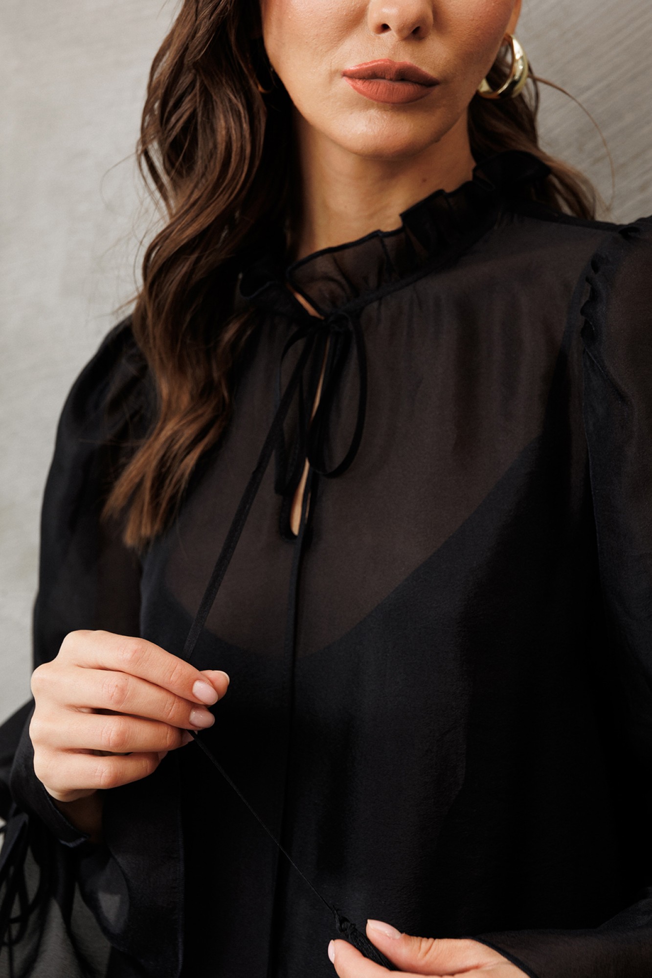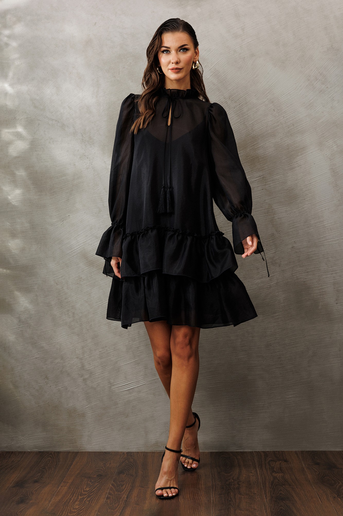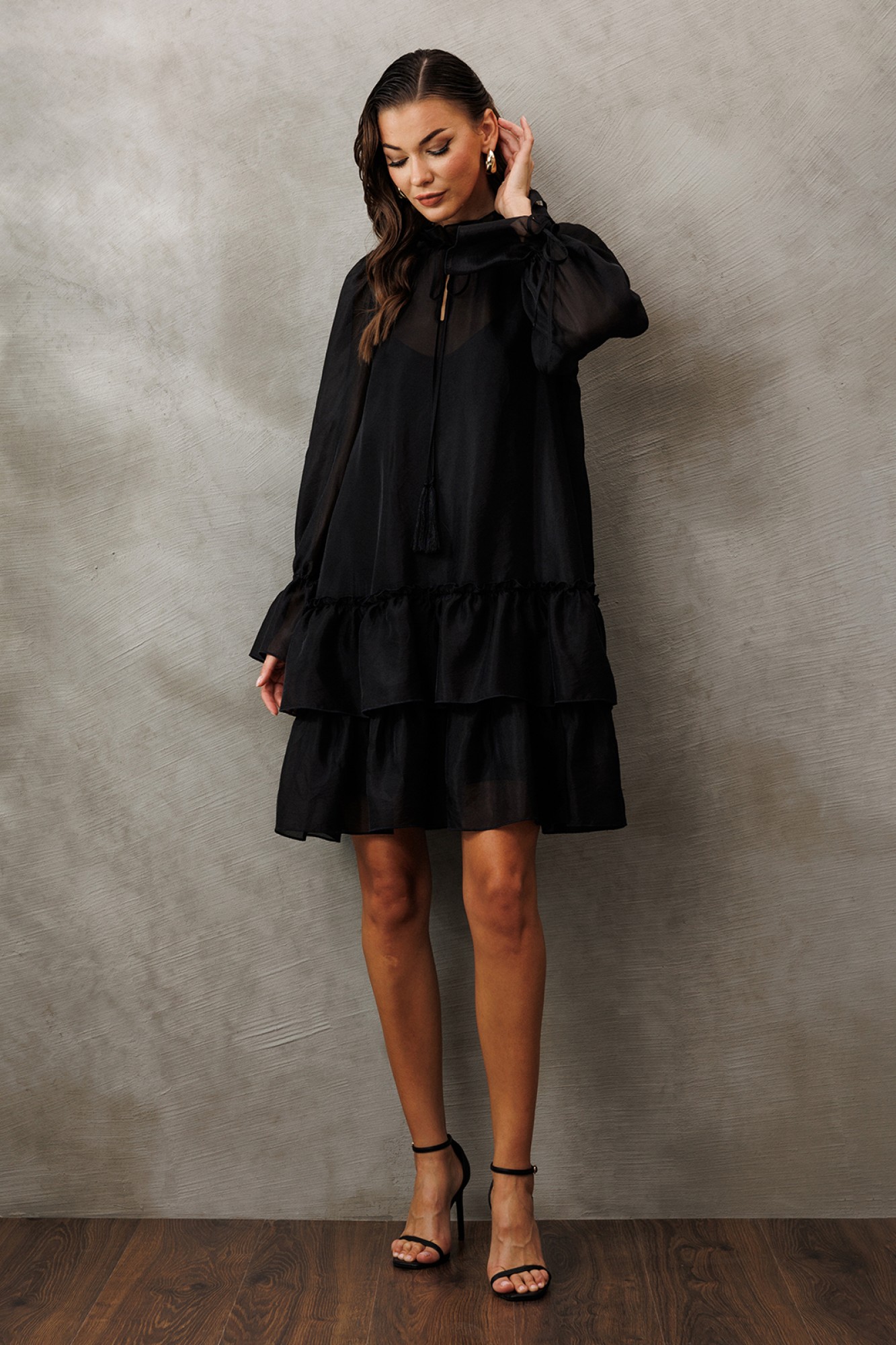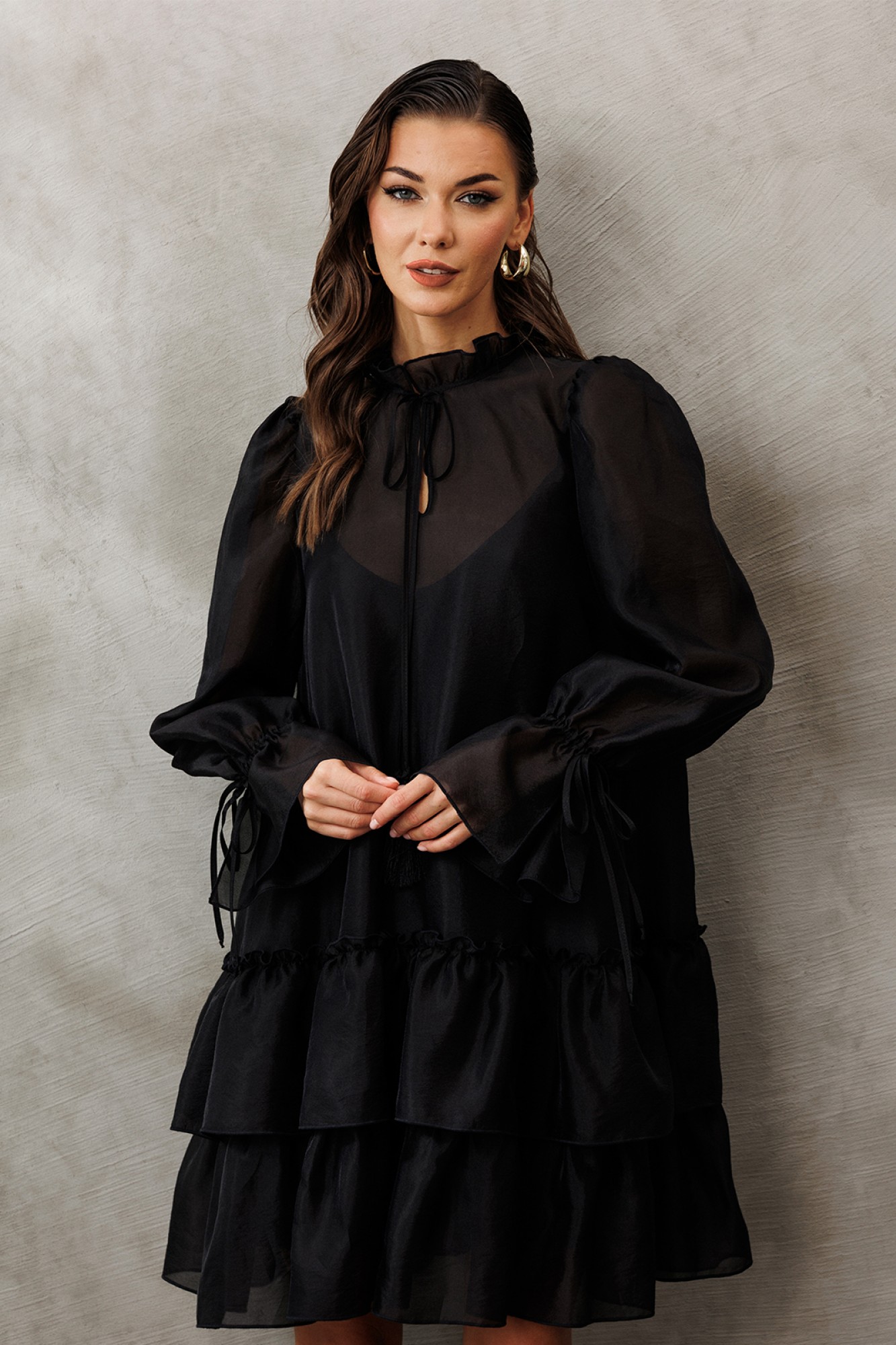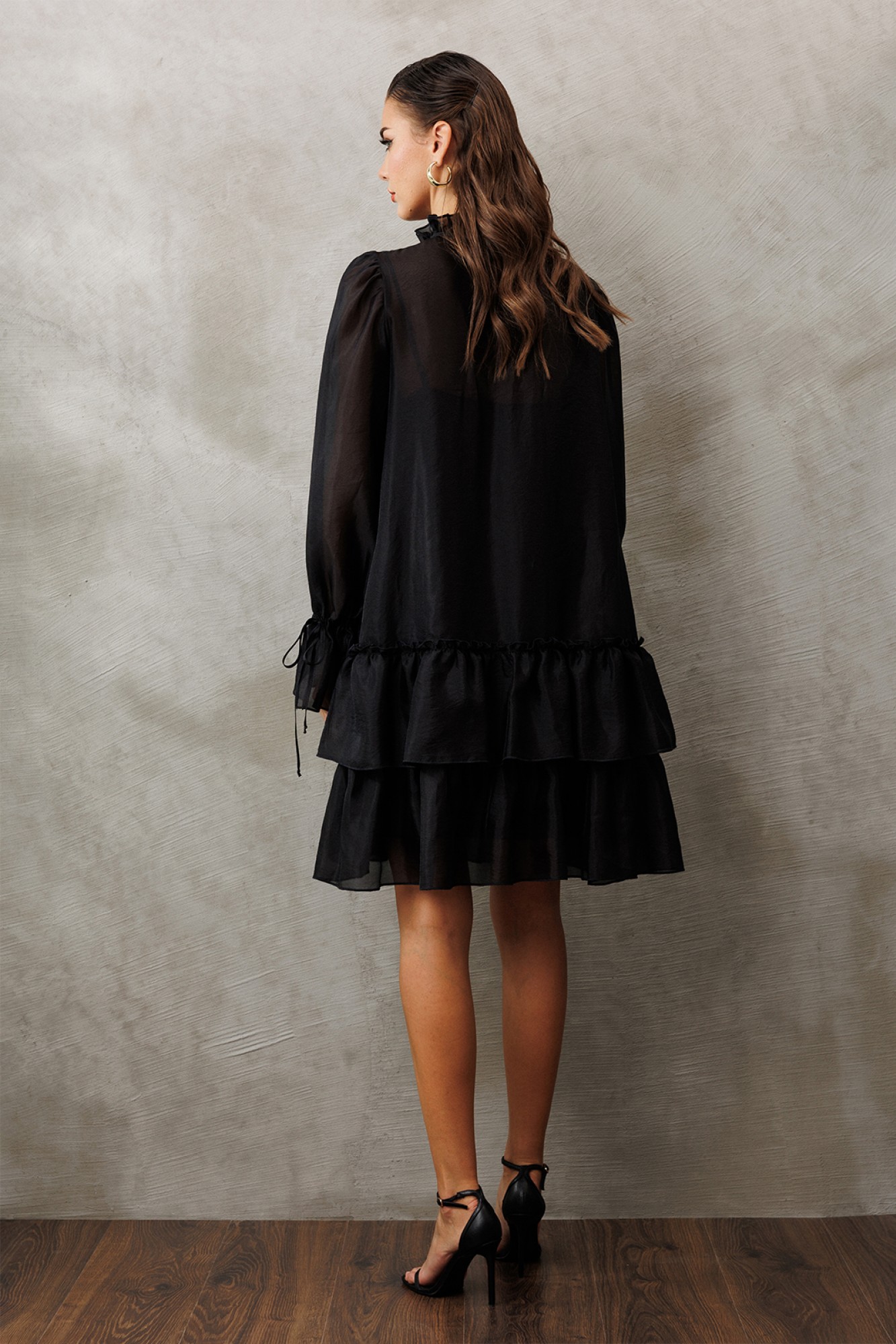 Платье из креп-шифона с напылением А-силуэта, состоящее из 2-х слоев. Верхний слой: Втачной длинный рукав со сборкой по окату и внизу на завязке, полочка и спинка с притачными слегка присборенным воланом с рюшей, воротник стойка-рюша и вырезом каплей по переду на завязке. Нижний слой: платье на бретелях.