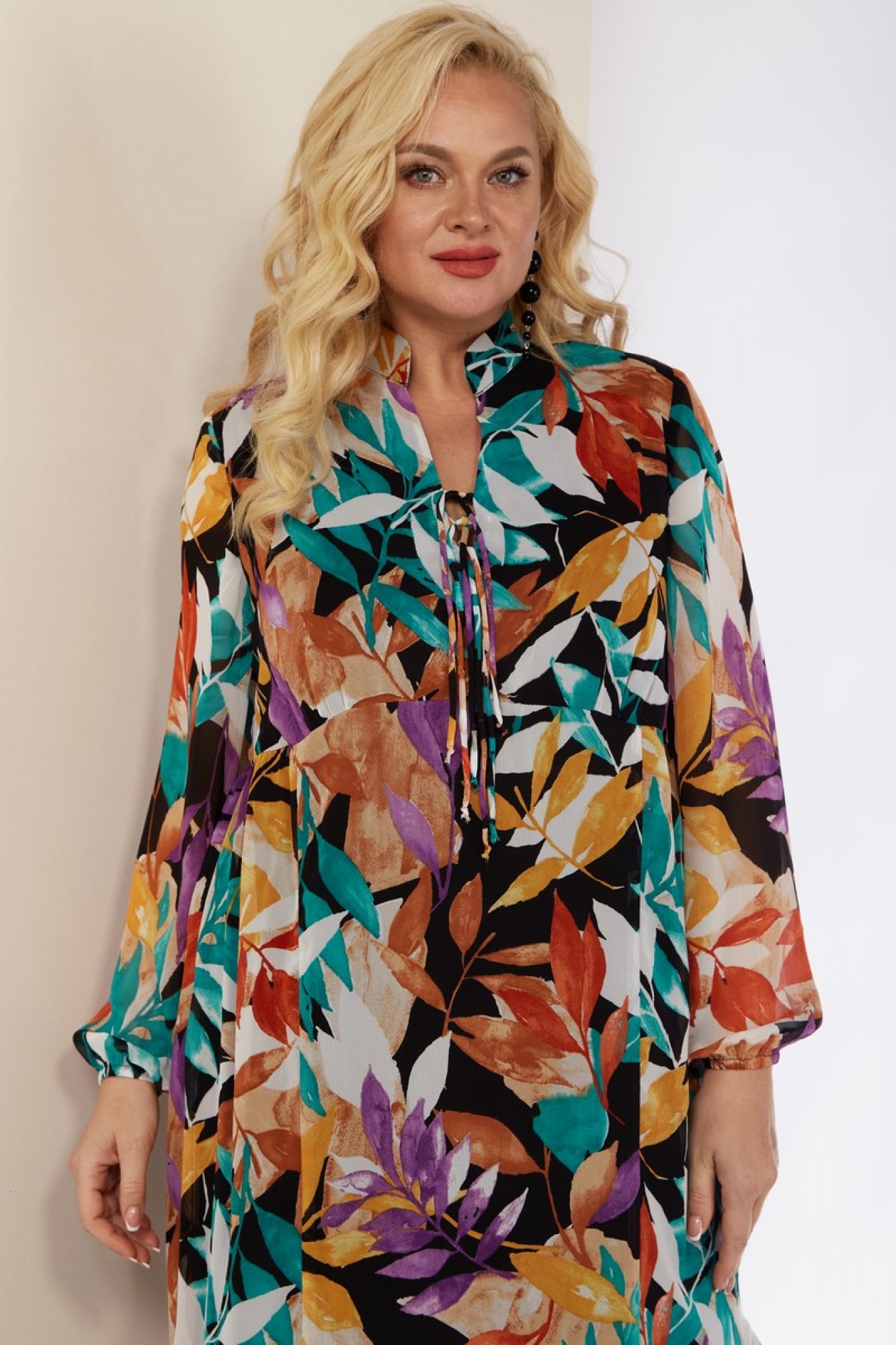 По полочке подрез ниже линии груди на сборке. Горловина с воротником-стойкой, вырез фигурный с завязками. Спинка цельнокроеная. Рукав втачной одношовный длинный, снизу собран на резинку. По низу изделия вставлены клинья.