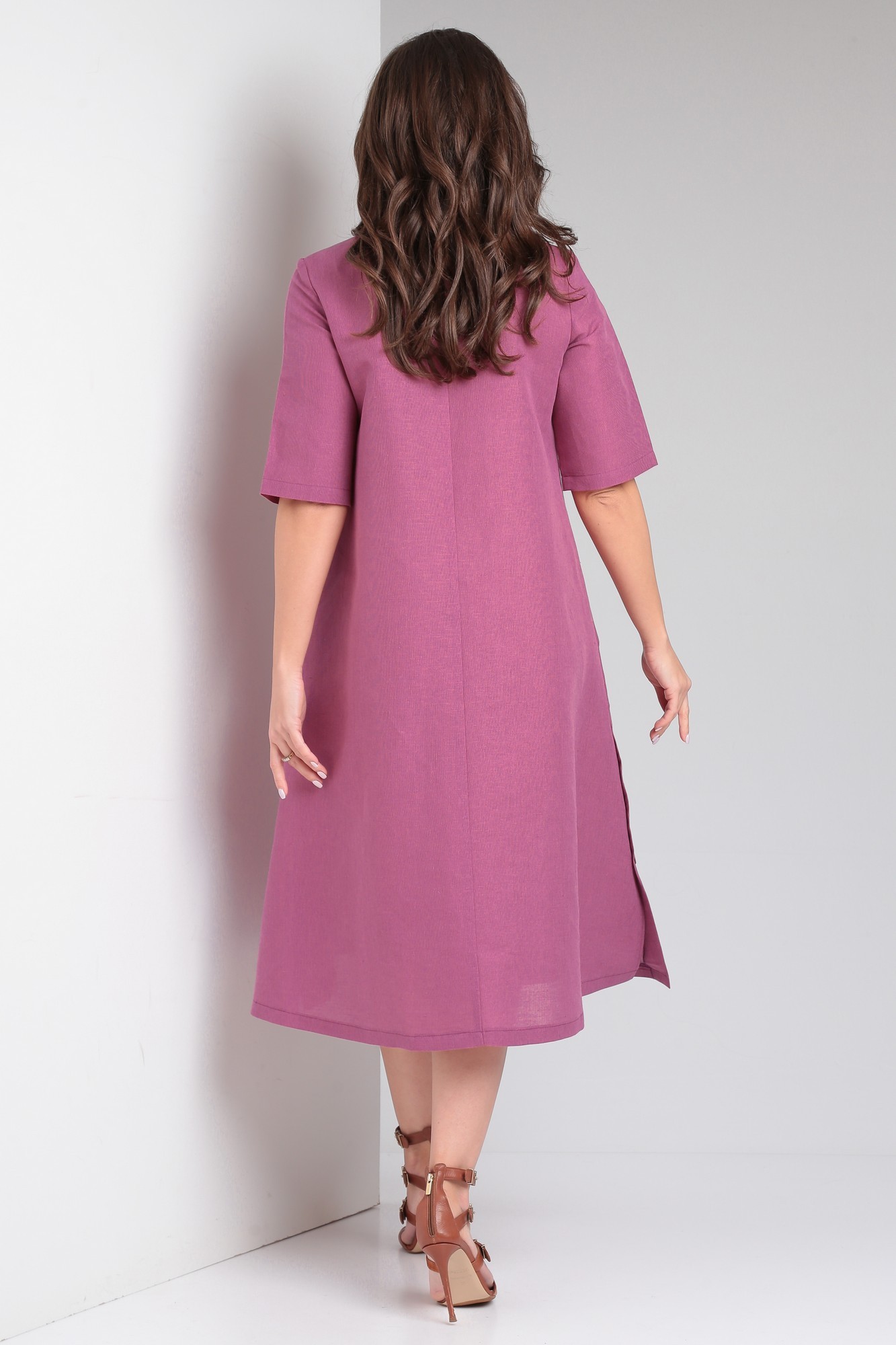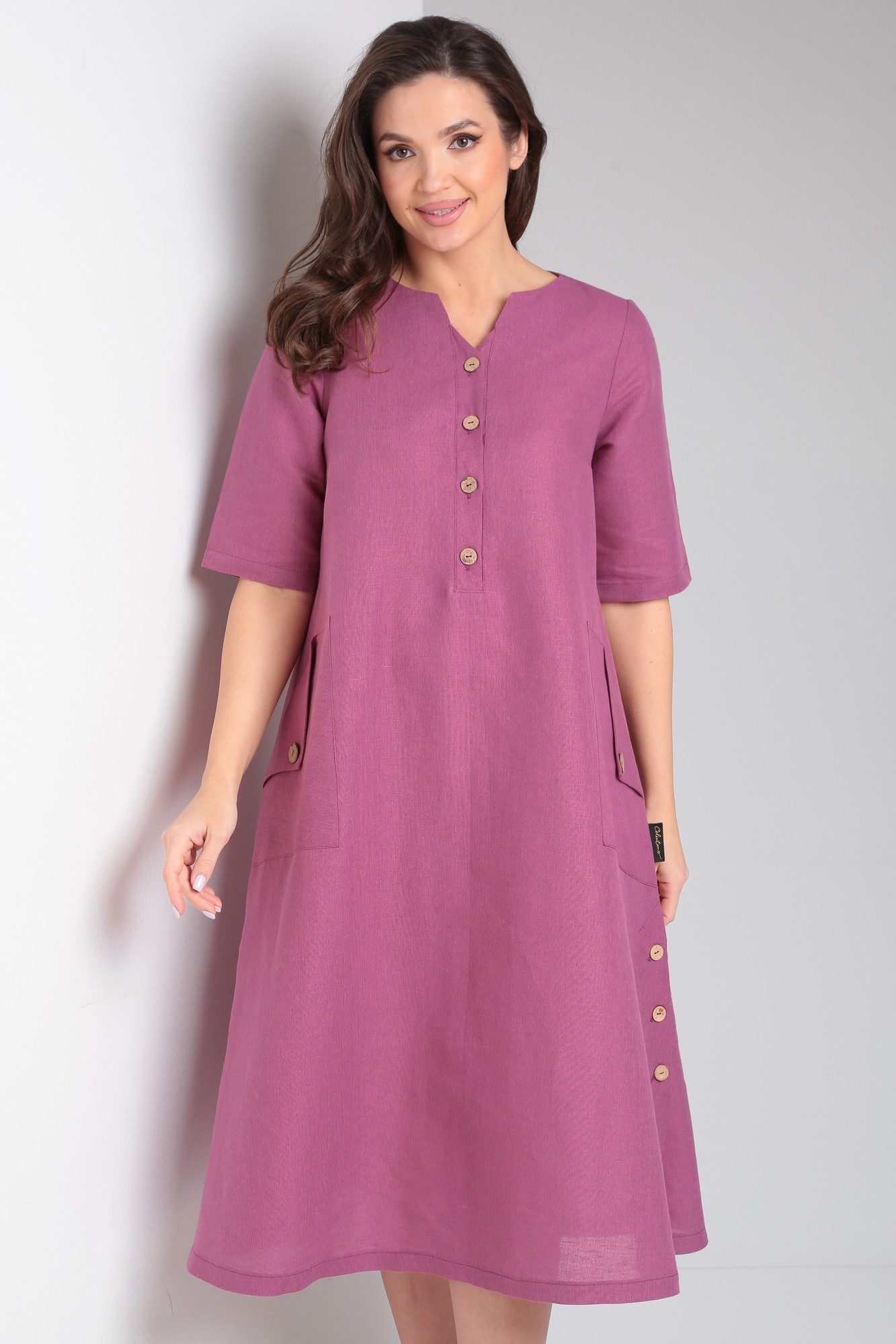 Льняное платье А-образного силуэта от Celentano длиной миди. Застежка центральная на петли и пуговицы, вырез горловины фигурный. Перед с нагрудными вытачками и накладными карманами. В боковых швах выполнены шлицы с застежкой на петли и пуговицы. Спинка разрезная с центральным швом. Рукав по локоть одношовный втачной. Платье выполнено из качественного белорусского льняного полотна (пр-во Орша). Ткань не тянется. Все пуговицы на платье натуральные кокосовые. Наше свободное платье из натурального льна будет комфортно для повседневного использования весной и летом.