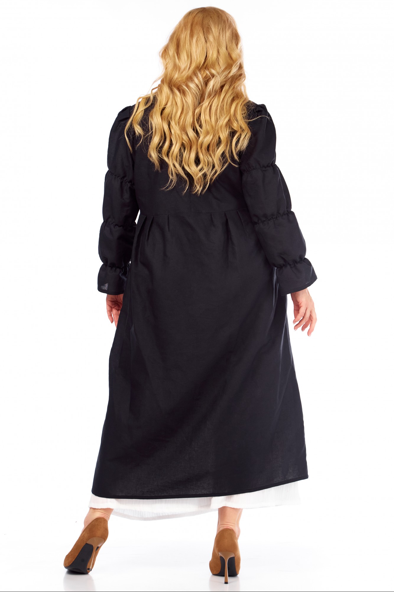 Платье выполнено из качественного белорусского льняного полотна (пр-во Орша). Ткань не тянется. Все пуговицы на платье натуральные кокосовые.