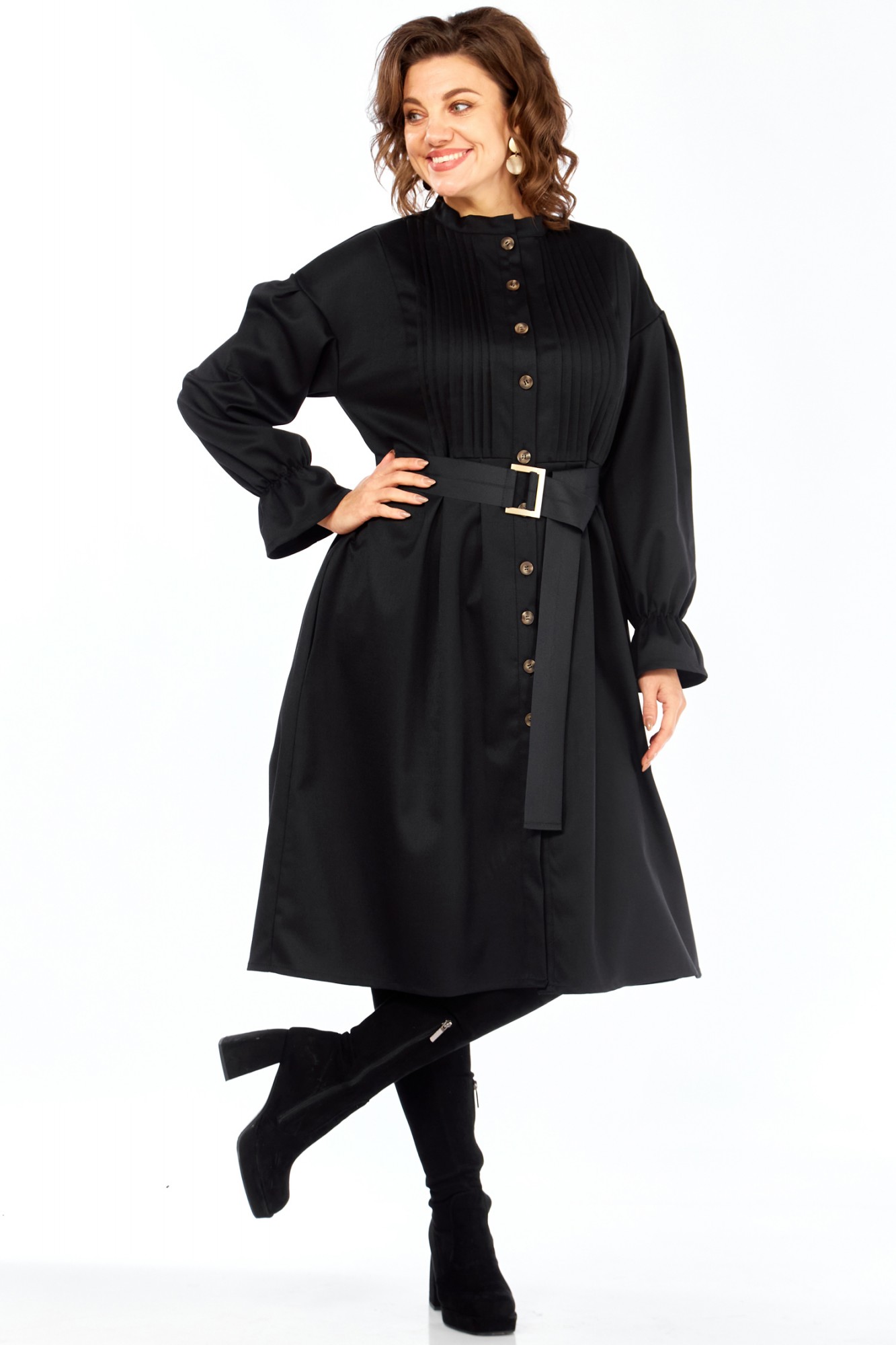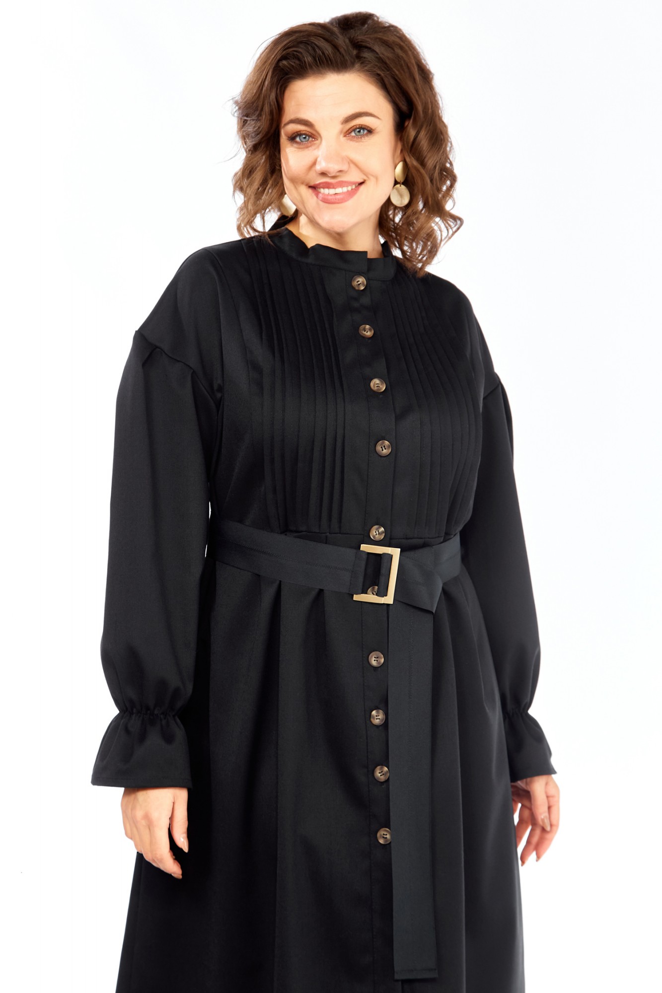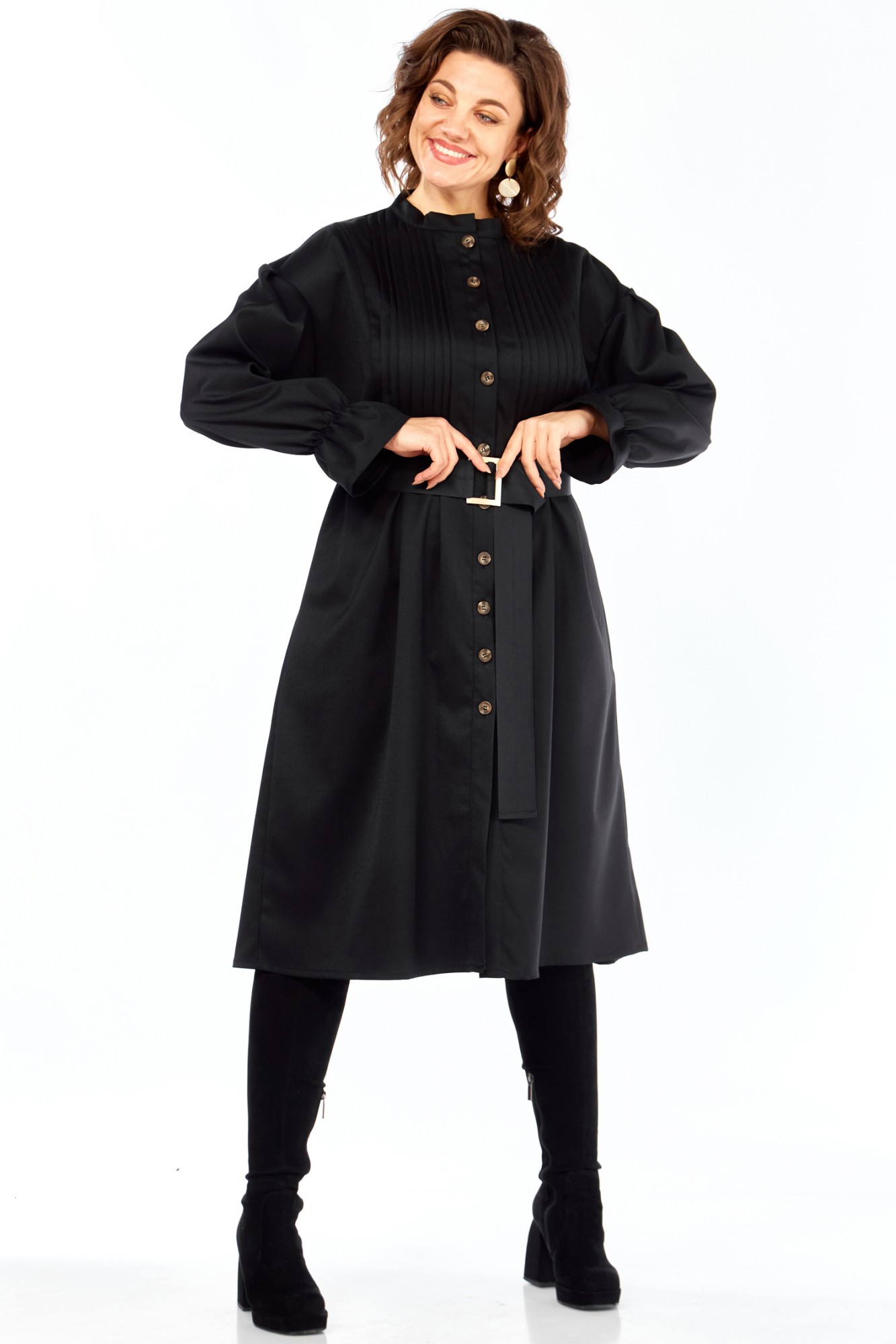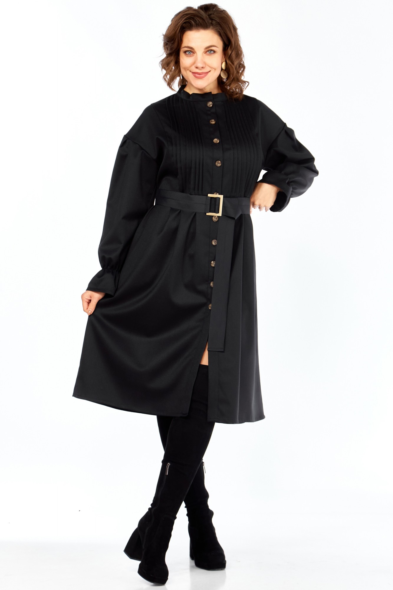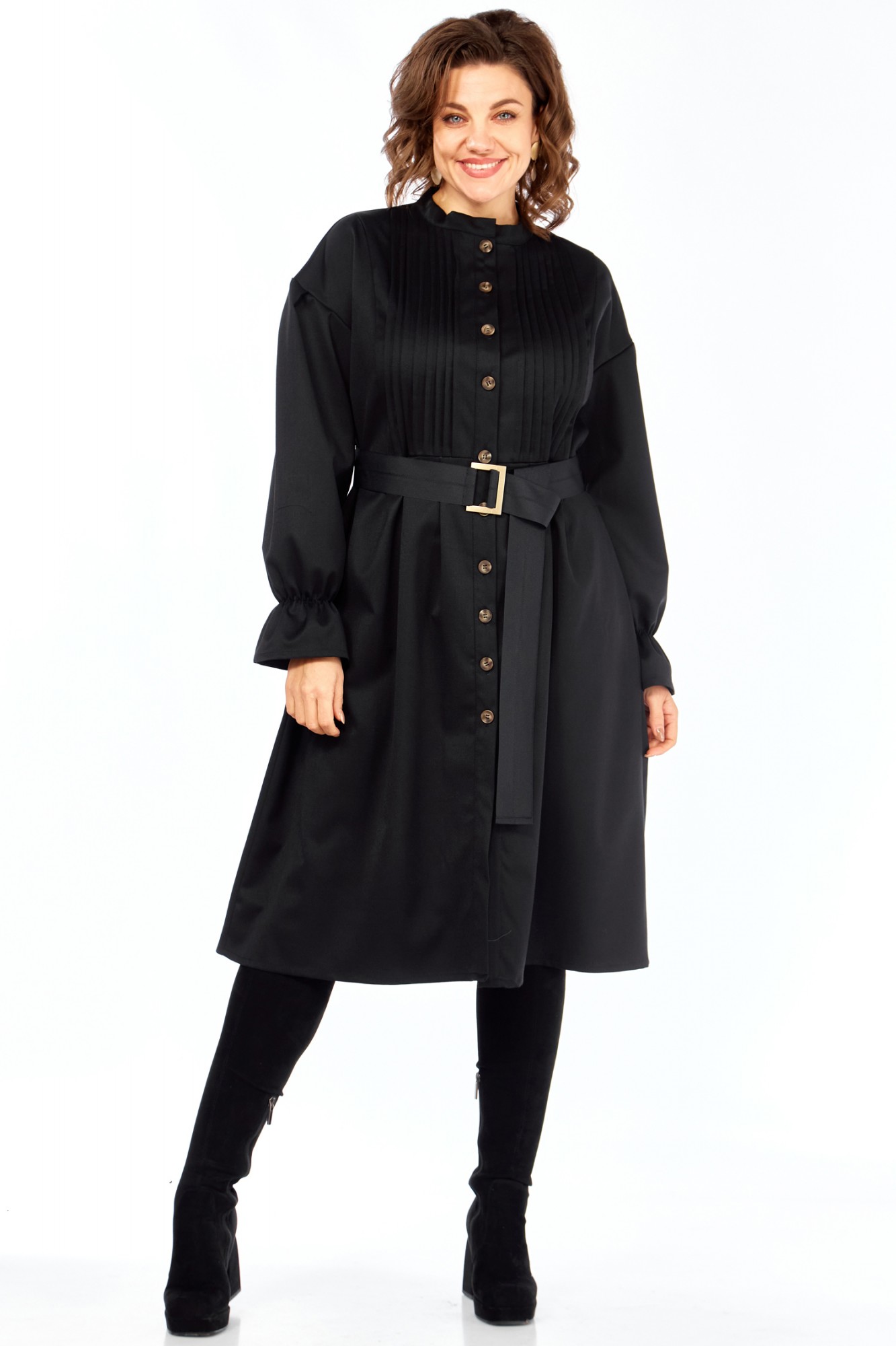 Идеальное платье для современной женщины! Натуральный состав ткани позволяет коже дышать, обеспечивая максимальный комфорт на протяжении всего дня. Платье свободного кроя, с округлой горловиной обработанной воротником стойкой. Застежка центральная на петли и пуговицы позволяет регулировать глубину выреза. Рукав платья со спущенным плечом и манжетой на резинке создают непринужденный и элегантный силуэт. Центральная часть полочки обработана односторонними складками, линия талии подчеркнута легкой сборкой (защипы). В комплекте идет пояс, который подчеркивает женственные формы, и при этом не сковывает движений. В платье есть внутренние карманы в боковых швах, что придает удобства платью. Ткань не тянется. Длина платья 106 см, длина рукава 69см с учетом приспущенного плеча.