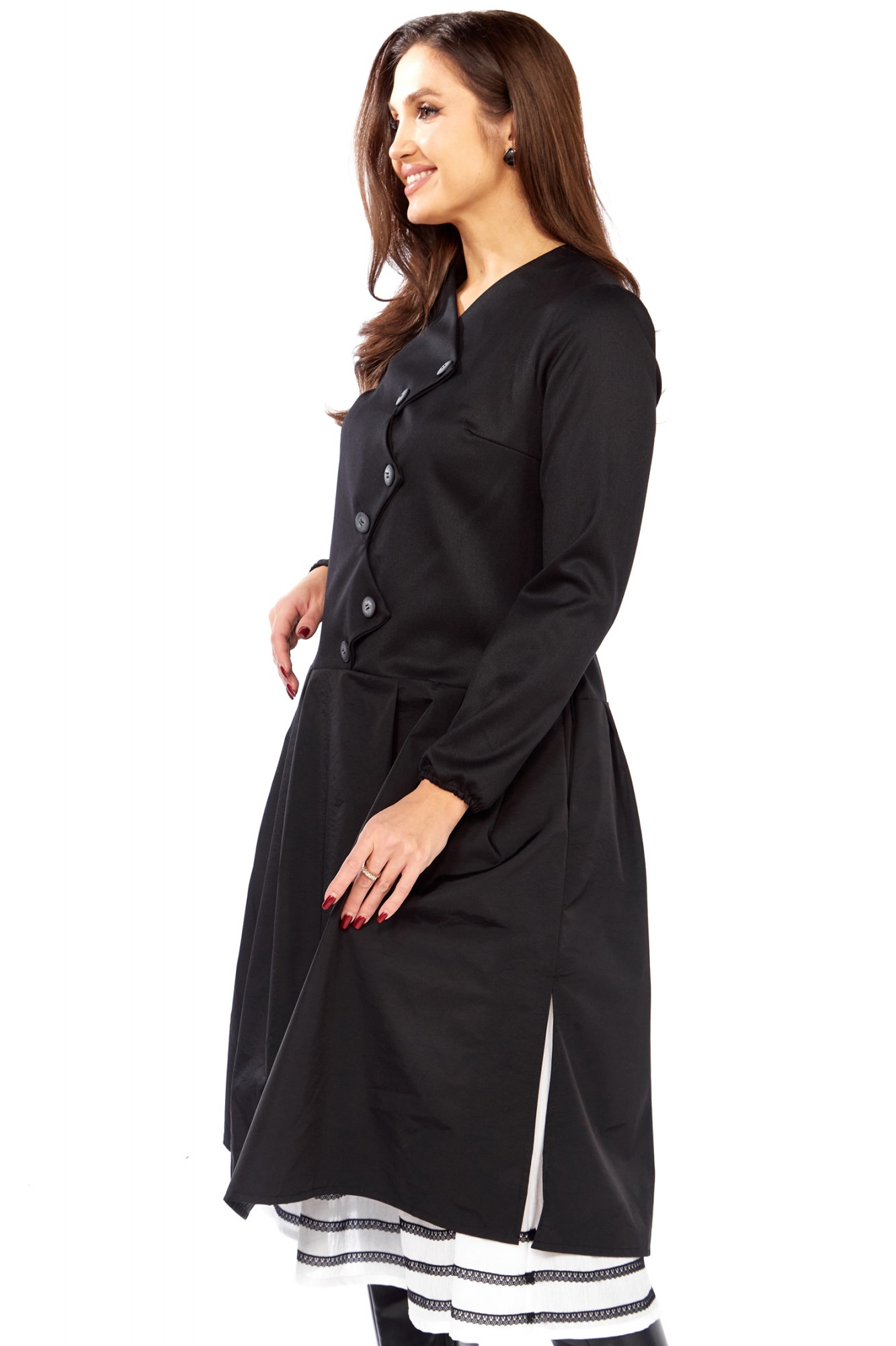 Платье с эффектом двухслойности от Celentano. Представьте образ, который сочетает в себе элегантность и дерзость, классику и авангард. Перед вами — уникальное платье, созданное для тех, кто ценит индивидуальность и безупречный стиль! Это не просто платье, это  стильный дуэт в одном флаконе, искусно имитирующий многослойный комплект. Глубокий черный цвет верхнего платья с приталенным лифом и изящными складками на юбке создает утонченный силуэт. А высокие боковые разрезы игриво открывают взгляду контрастную белую юбку-компаньон, украшенную графичными черным кружевом по низу. Этот эффект — настоящий магнит для взглядов! Особый шарм платью придает асимметричная застежка на крупные пуговицы, которая выгодно подчеркивает линию шеи и создает необычный акцент. Удобный крой и качественная ткань гарантируют, что вы будете чувствовать себя комфортно и уверенно в любой ситуации.