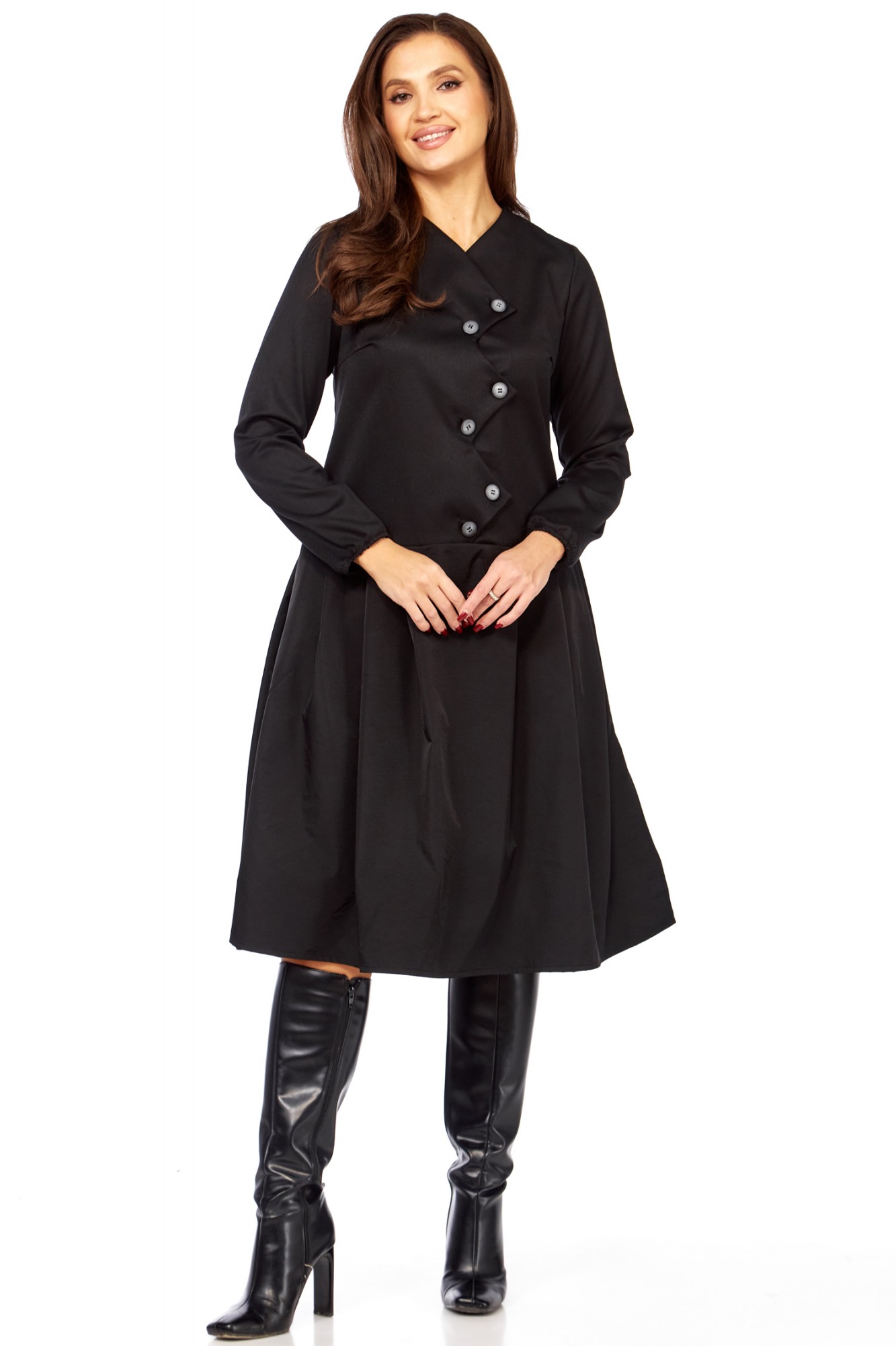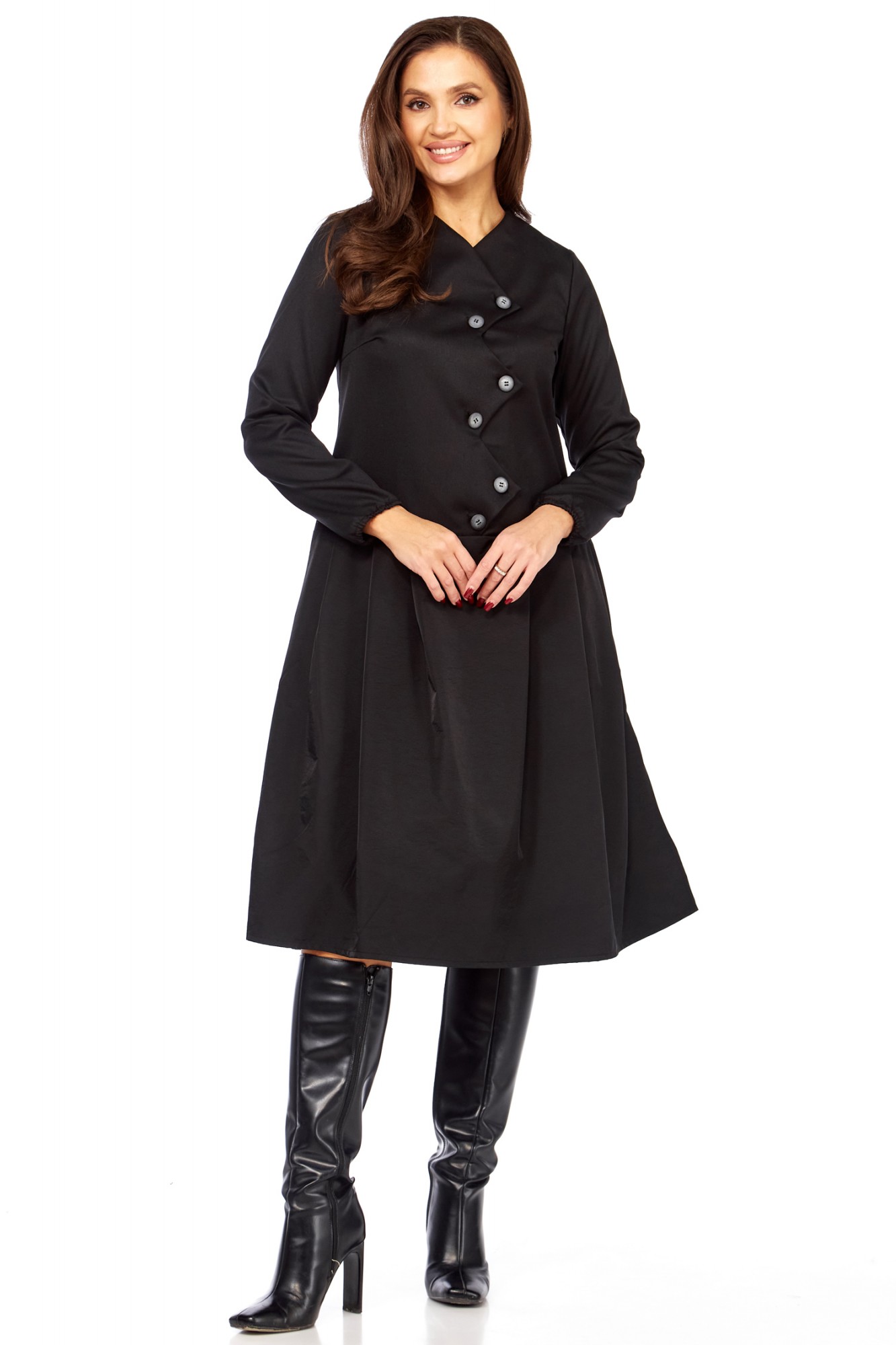 Платье с характером: Ваша новая визитная карточка стиля! Устали от обыденности? Ищете платье, которое расскажет о вас без слов? Встречайте модель, сочетающую в себе изысканность и смелый дизайн! Это миди-платье притягивает взгляд своей нестандартной асимметричной застежкой. Ряд контрастных светлых пуговиц, словно жемчужная дорожка, подчеркивает изящный крой и придает образу особую динамику и утонченность. Она не только придает платью неповторимый шарм, но и визуально вытягивает силуэт, делая его еще более стройным и грациозным. Идеальный крой – приталенный лиф, подчеркивающий талию, и расклешенная юбка со складками, создающая воздушный и женственный силуэт. Длинные рукава добавляют завершенности и элегантности. Это платье в глубоком черном цвете — настоящая находка для тех, кто ценит универсальность без компромиссов в стиле. Оно одинаково великолепно смотрится с лодочками для делового мероприятия, с ботильонами для похода в театр или с высокими сапогами для осенней прогулки. Почувствуйте себя неотразимой! Комфортное, стильное и абсолютно уникальное – оно создано, чтобы вы чувствовали себя на высоте. Откройте для себя совершенство в деталях!