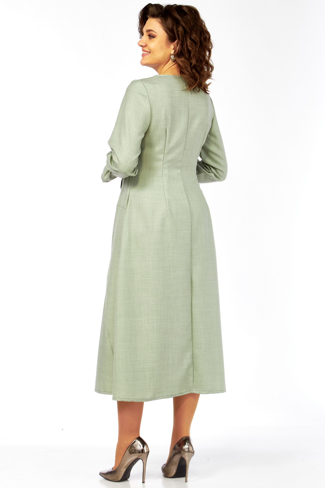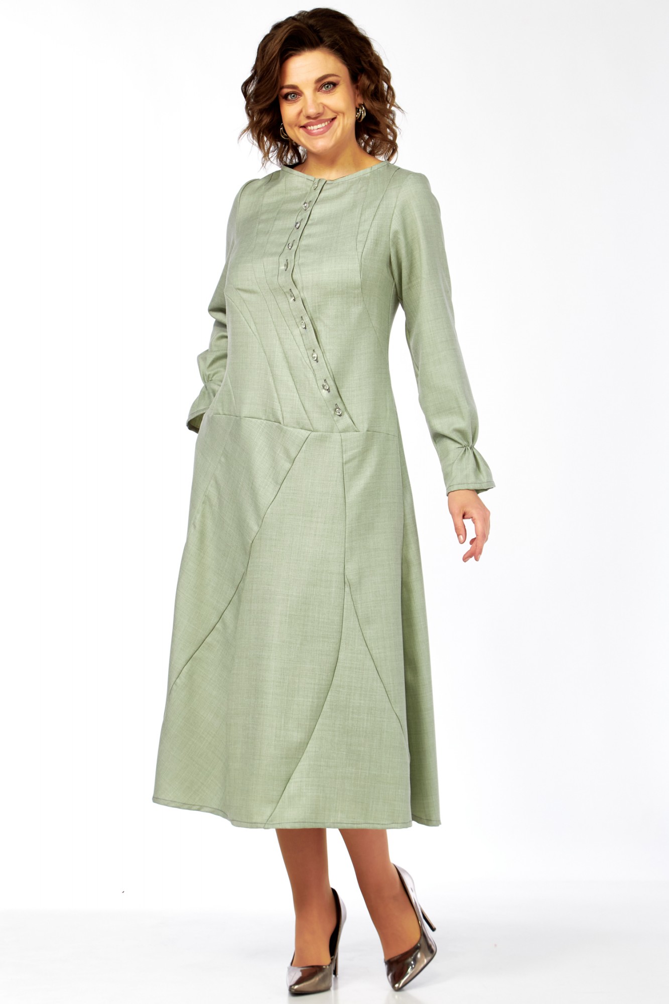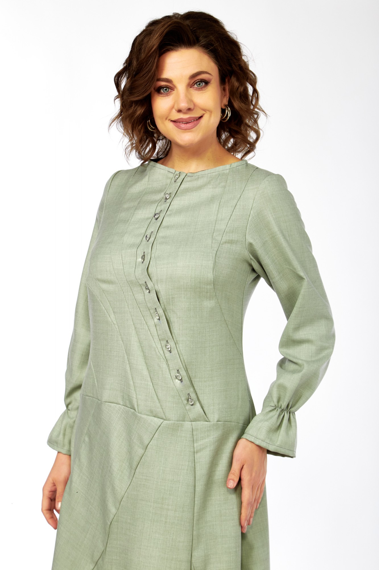 Это платье – воплощение сдержанной элегантности и утонченного стиля. Оттенок платья напоминает пыльную мяту, нежную фисташку или приглушенный шалфей. Это спокойный, благородный тон, который прекрасно вписывается в офисный гардероб, но при этом достаточно свеж. Изящный округлый вырез под горло выглядит скромно, но стильно, акцентируя внимание на шее. Главная изюминка лифа – это асимметричная декоративная планка с рядом блестящих пуговиц, придающих динамику и визуально вытягивающих силуэт. От планки расходятся диагональные рельефные швы, которые не только формируют фигуру, но и создают интересный архитектурный узор, добавляя сложности и шарма. Длинные, классические рукава завершаются изящными манжетами с деликатной сборкой. Этот ненавязчивый элемент придает платью нотку романтичности и женственности. Юбка длины миди, выполнена из нескольких клиньев, соединенных фигурными, диагональными швами, которые повторяют линии лифа. Эти швы не просто соединяют детали, они создают уникальный рисунок, а также визуально стройнят фигуру. Практичные и незаметные боковые карманы, органично вписаны в линию кроя, добавляют функциональности без ущерба для стиля.