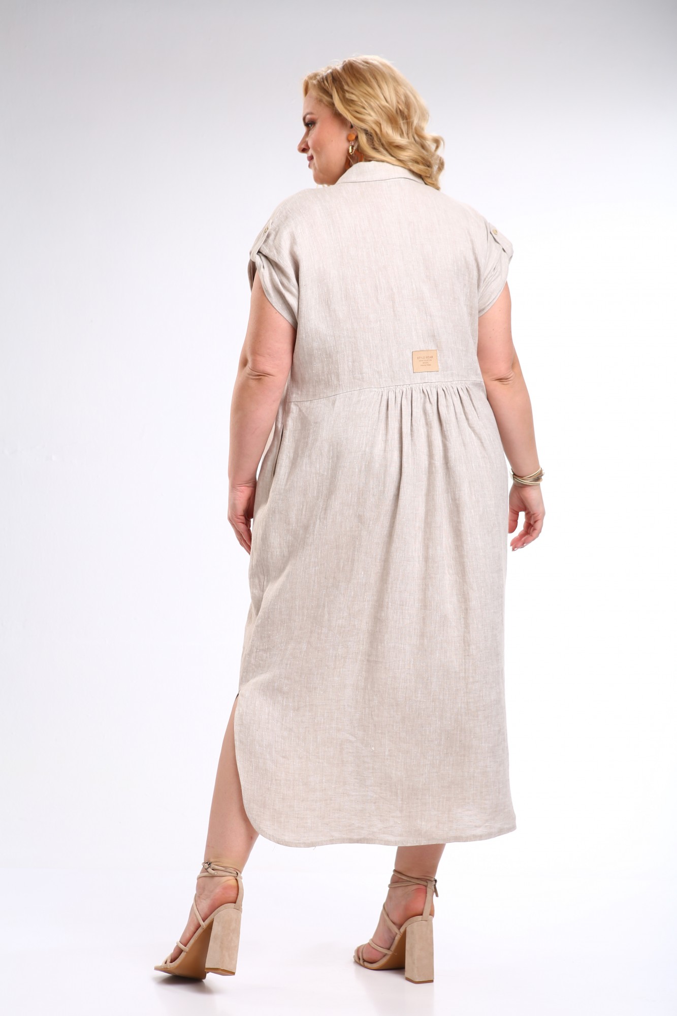 Платье женское, прямого силуэта с центральной застежкой на петли и пуговицы. Линия плеча спущена, цельнокроенный рукав с отделочным хлястиком. Отрезное по линии талии, по линии притачивания нижней части к верхней заложена сборка. В боковых швах обработаны карманы, по низу разрезы. Воротник стояче-отложной с отрезной стойкой. В качестве отделки используется отделочная строчка и фурнитура.
