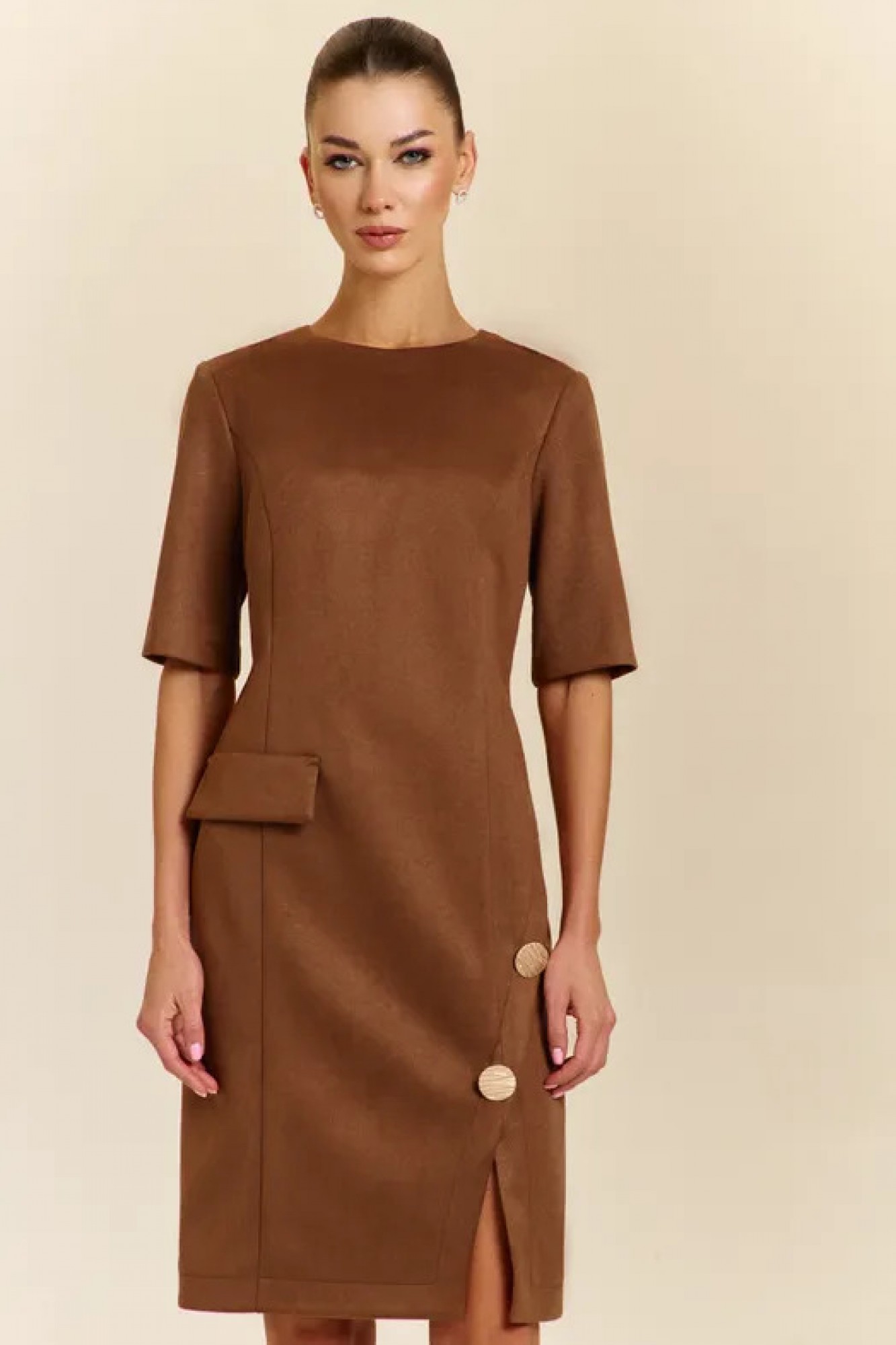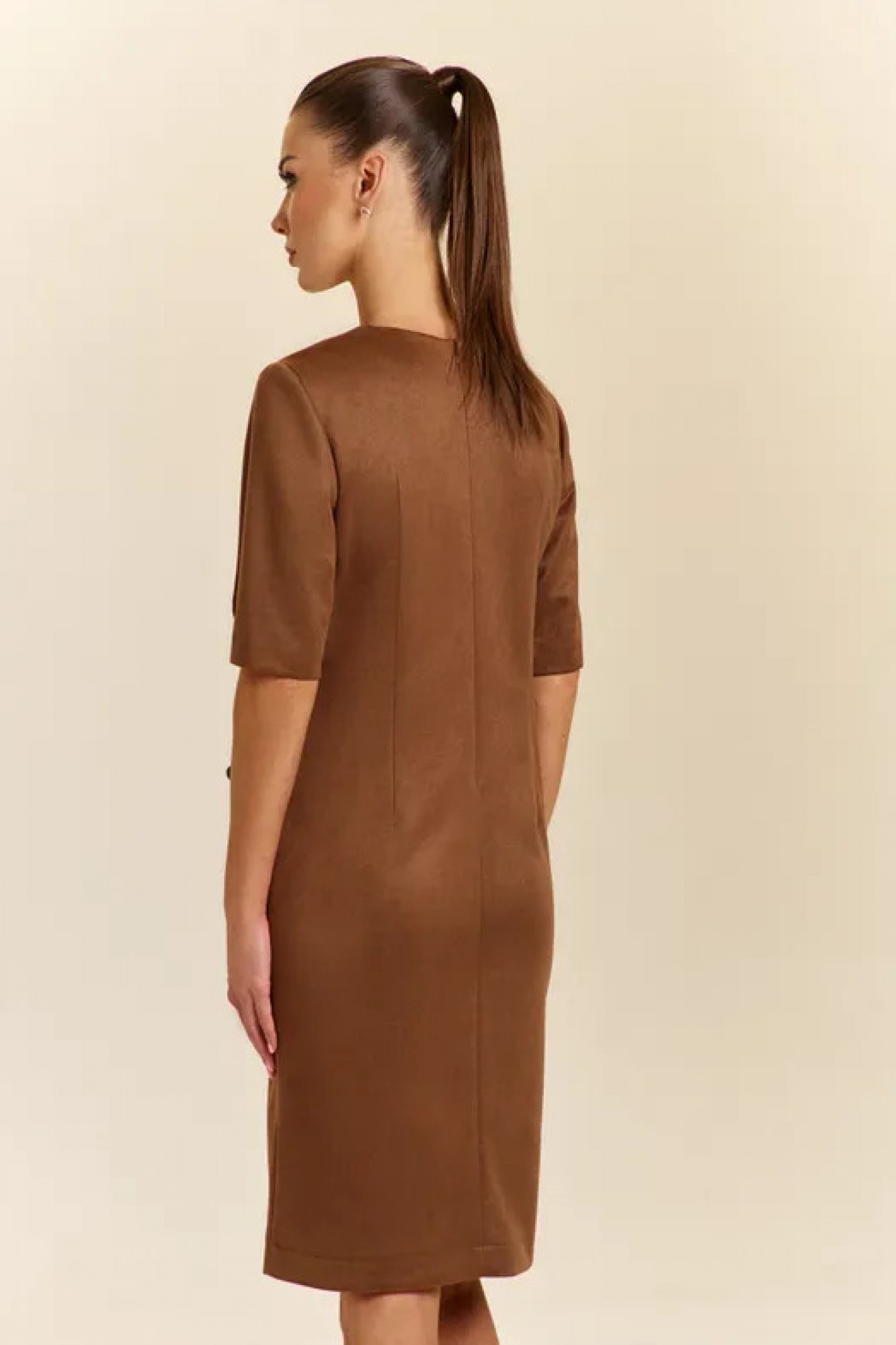 Платье женское полуприлегающего силуэта. Рукав длиной до локтя. По переду выполнена имитация кармана с клапаном. По спинке расположена потайная молния