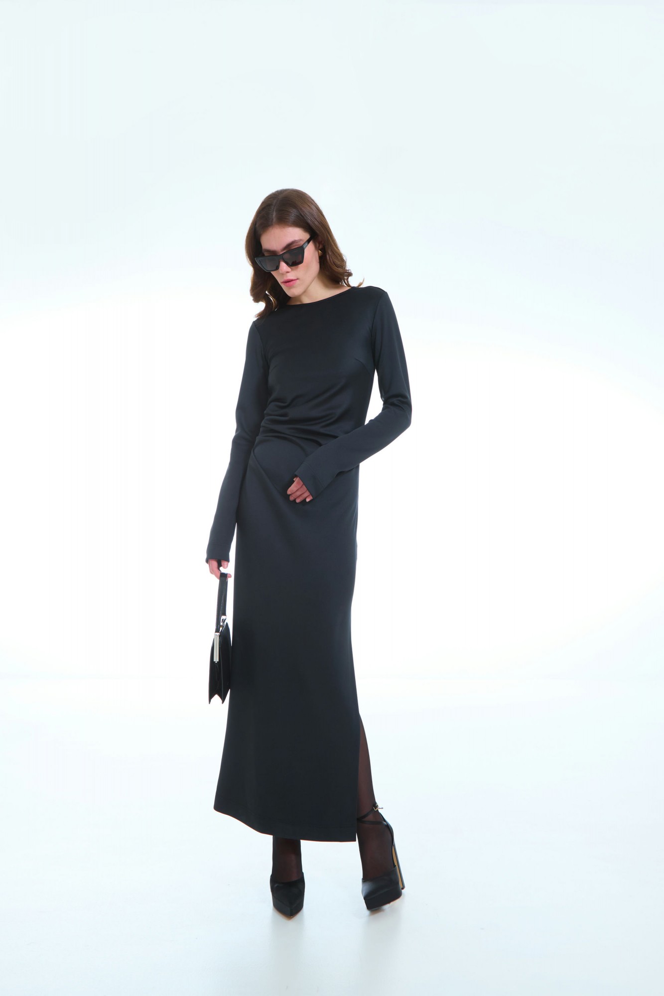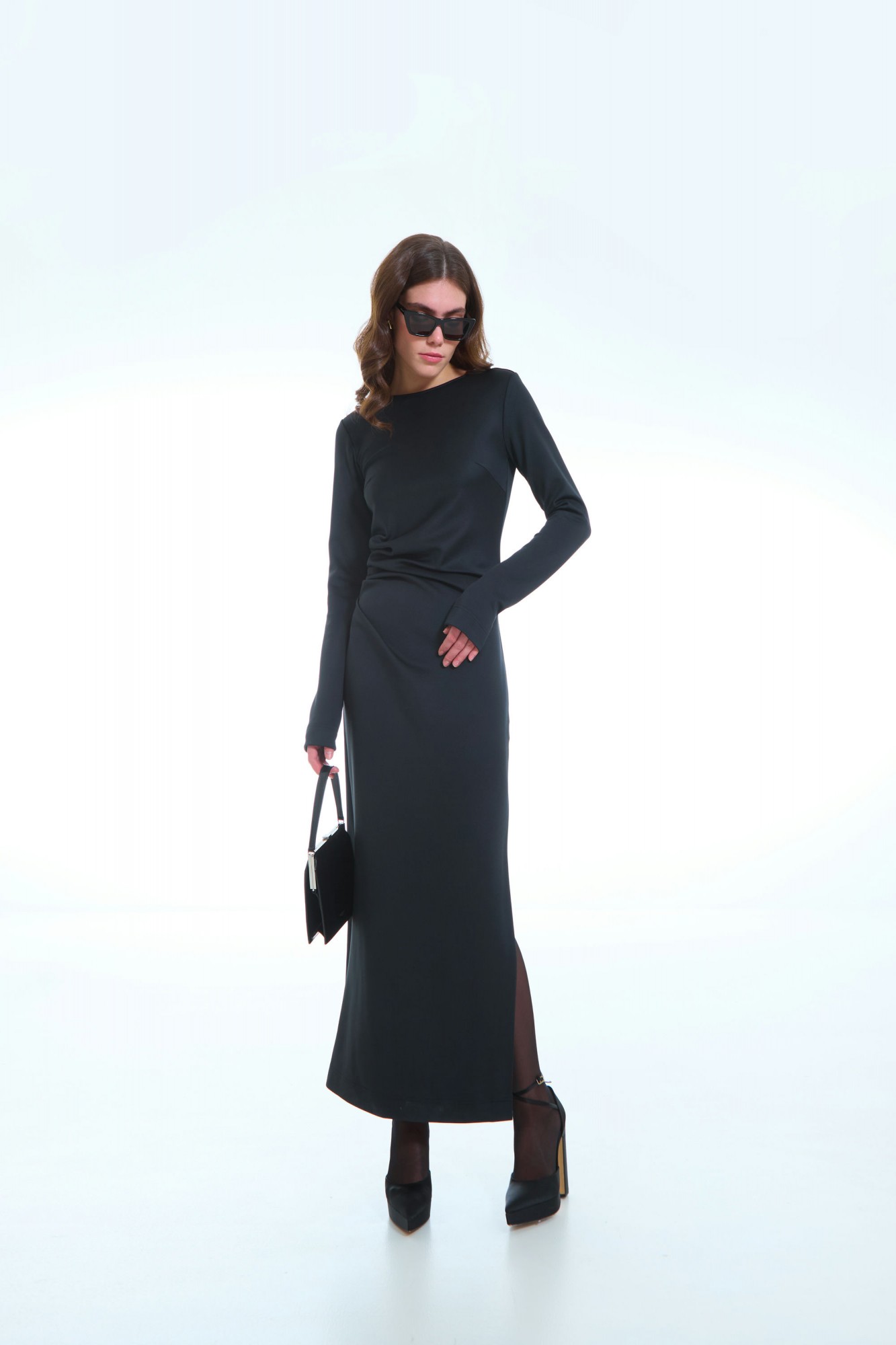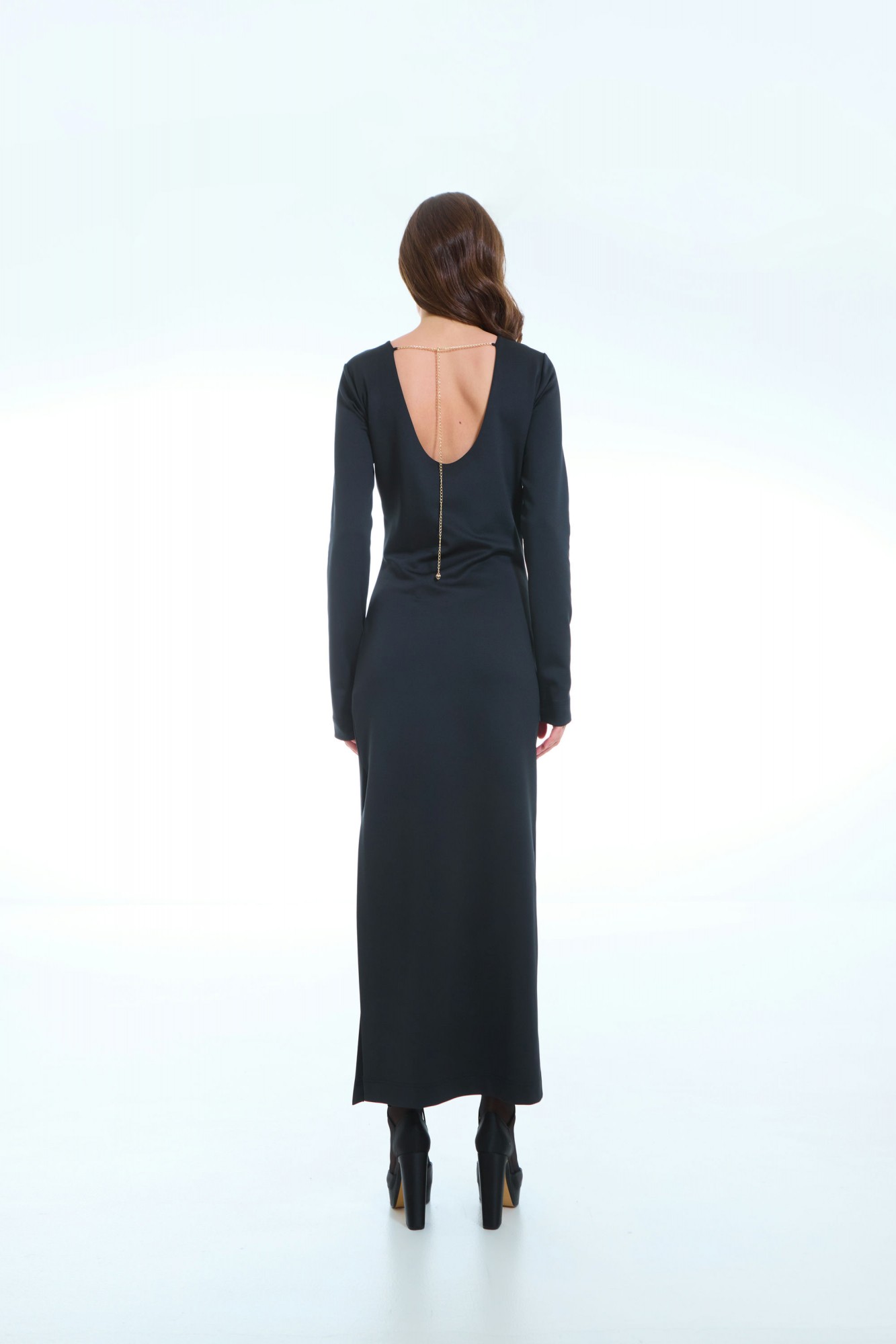 Это изысканное женское трикотажное платье, выполненное в полуприлегающем силуэте, подчеркивающем женственные формы и создающем элегантный образ. Стильный боковой разрез добавляет наряду легкости и динамики, а передняя часть украшена аккуратными вытачками и мягкими складками, исходящими из правого бокового шва, что придает модели особую изысканность и выразительность. Глубокий вырез на спинке фиксируется декоративной цепочкой, создавая изящный акцент и добавляя изюминку к дизайну. Рукава втачные, одношовные, обеспечивающие комфорт и аккуратность линий. Это платье идеально подойдет для тех, кто ценит стиль, комфорт и уникальный дизайн в повседневном или особом образе.
