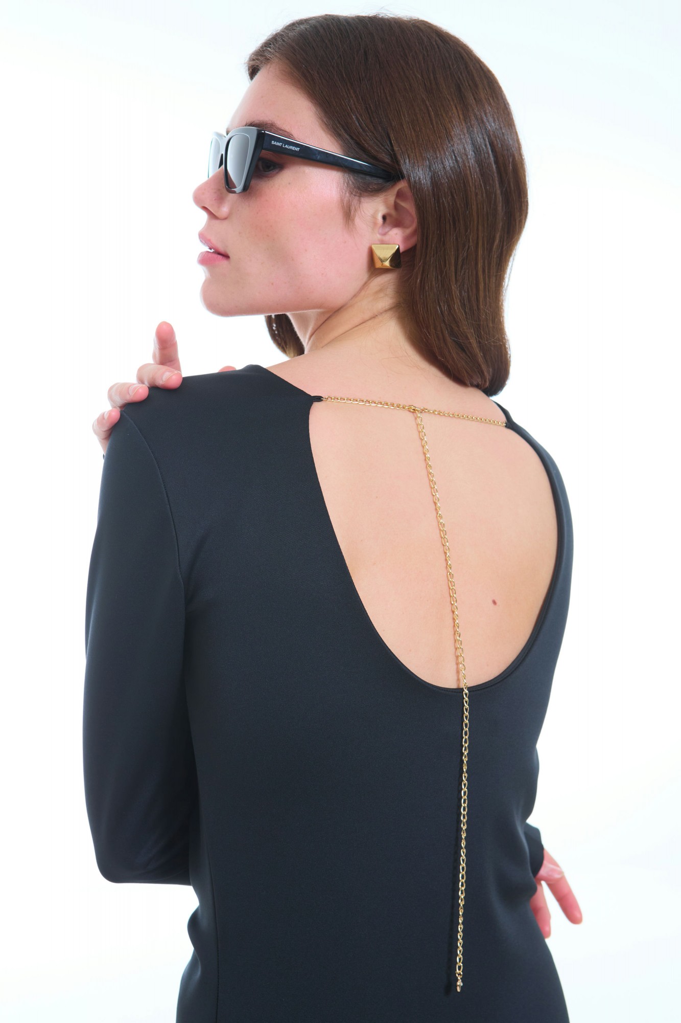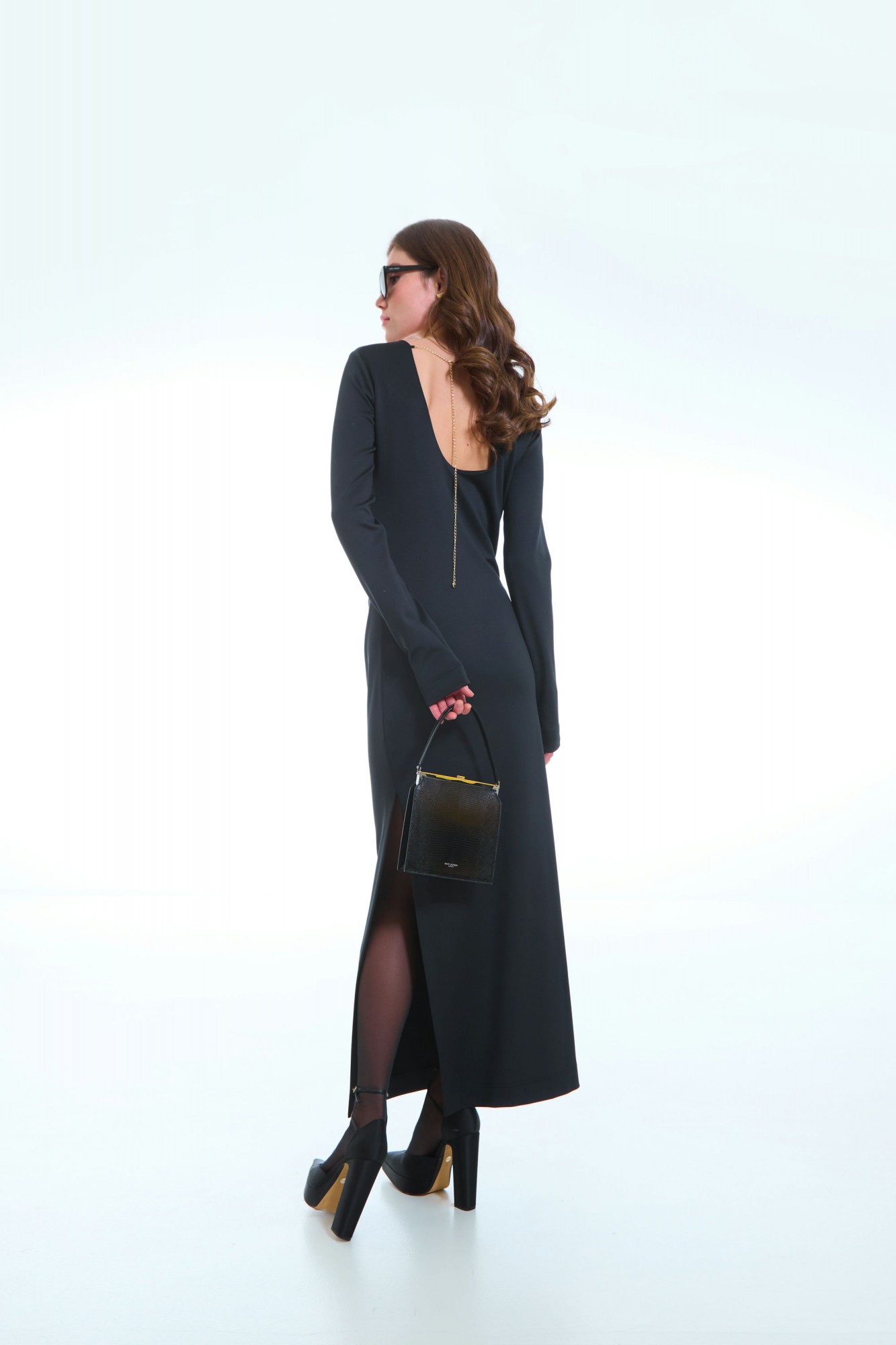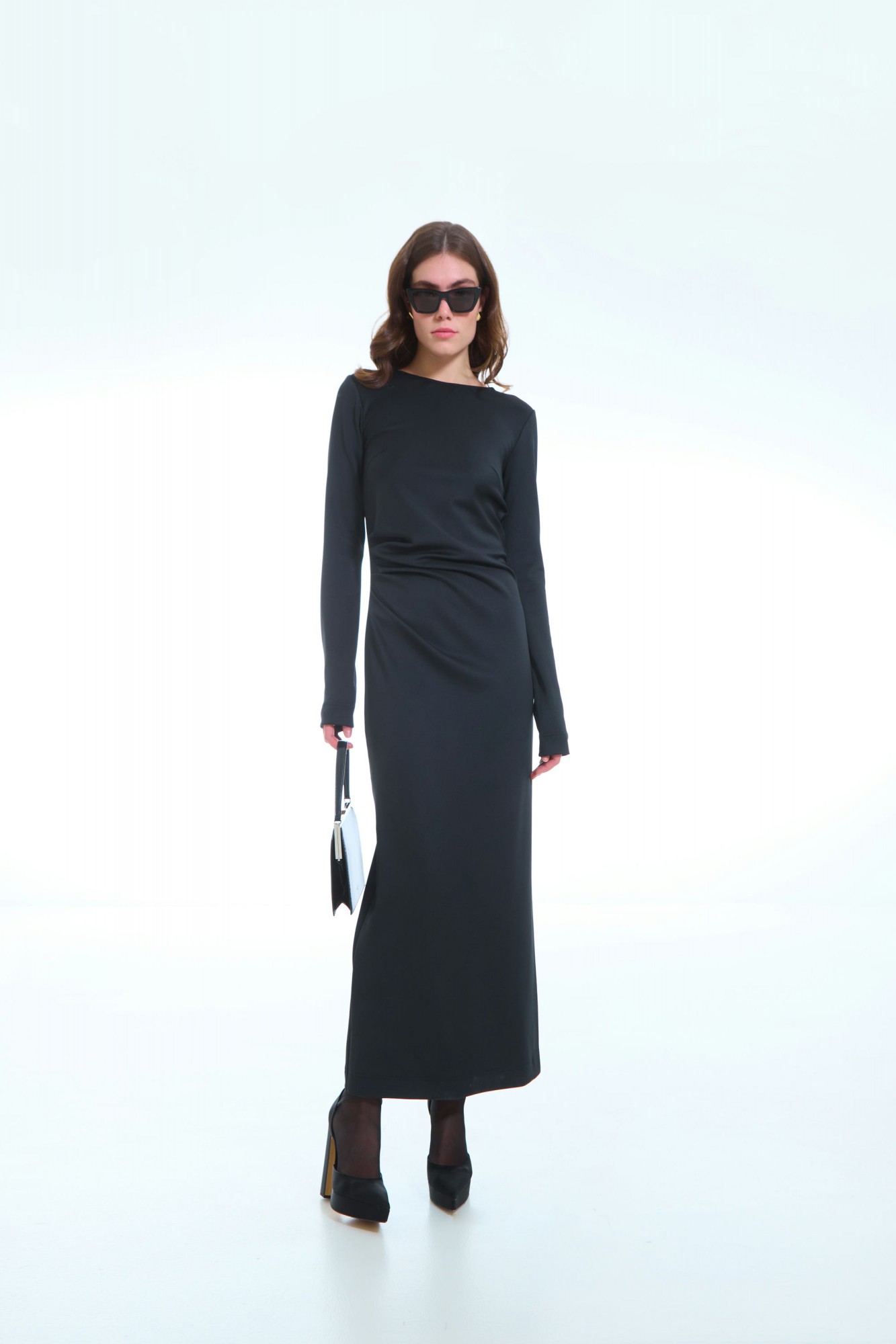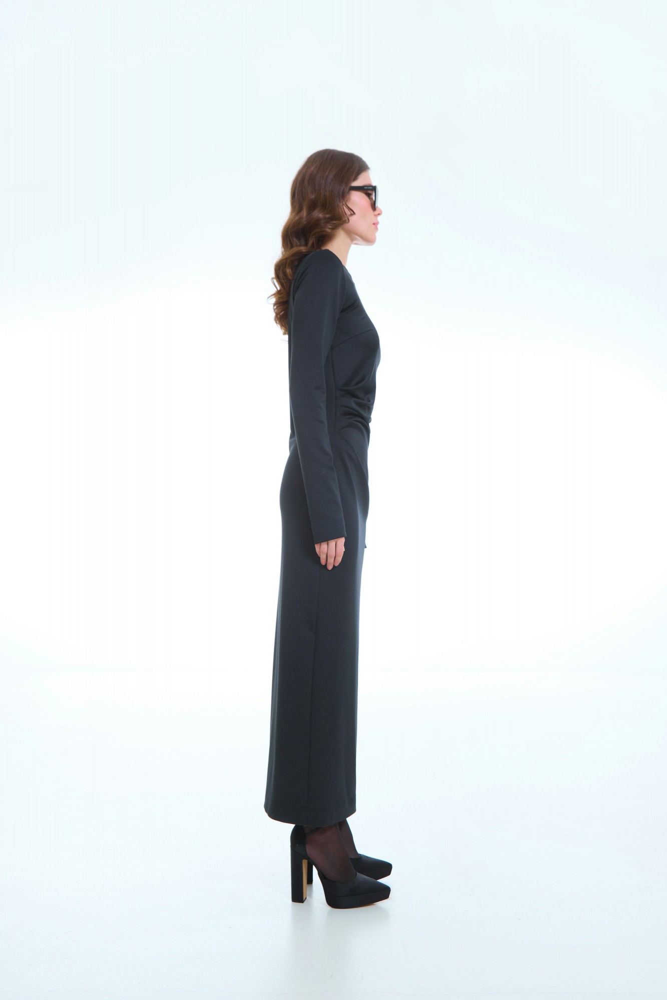 Это изысканное женское трикотажное платье, выполненное в полуприлегающем силуэте, подчеркивающем женственные формы и создающем элегантный образ. Стильный боковой разрез добавляет наряду легкости и динамики, а передняя часть украшена аккуратными вытачками и мягкими складками, исходящими из правого бокового шва, что придает модели особую изысканность и выразительность. Глубокий вырез на спинке фиксируется декоративной цепочкой, создавая изящный акцент и добавляя изюминку к дизайну. Рукава втачные, одношовные, обеспечивающие комфорт и аккуратность линий. Это платье идеально подойдет для тех, кто ценит стиль, комфорт и уникальный дизайн в повседневном или особом образе.