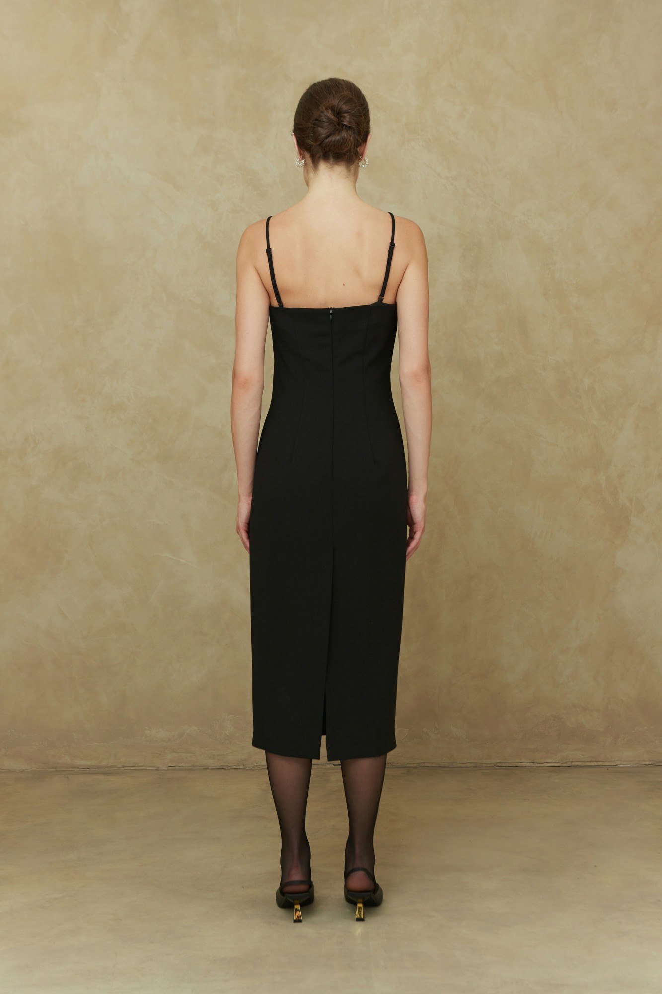 Платье женское на бретелях, из текстильного полотна, облегающего силуэта, покроя-футляр, на подкладке. Длина ниже колена. На переде средний шов, талевые и нагрудные вытачки, по верху лифа внутри эластичная с силиконом тесьма. Спинка со средним швом и таллиевыми вытачками, в верхней части среднего шва застежка на потайную молнию, в нижней части среднего шва шлица.