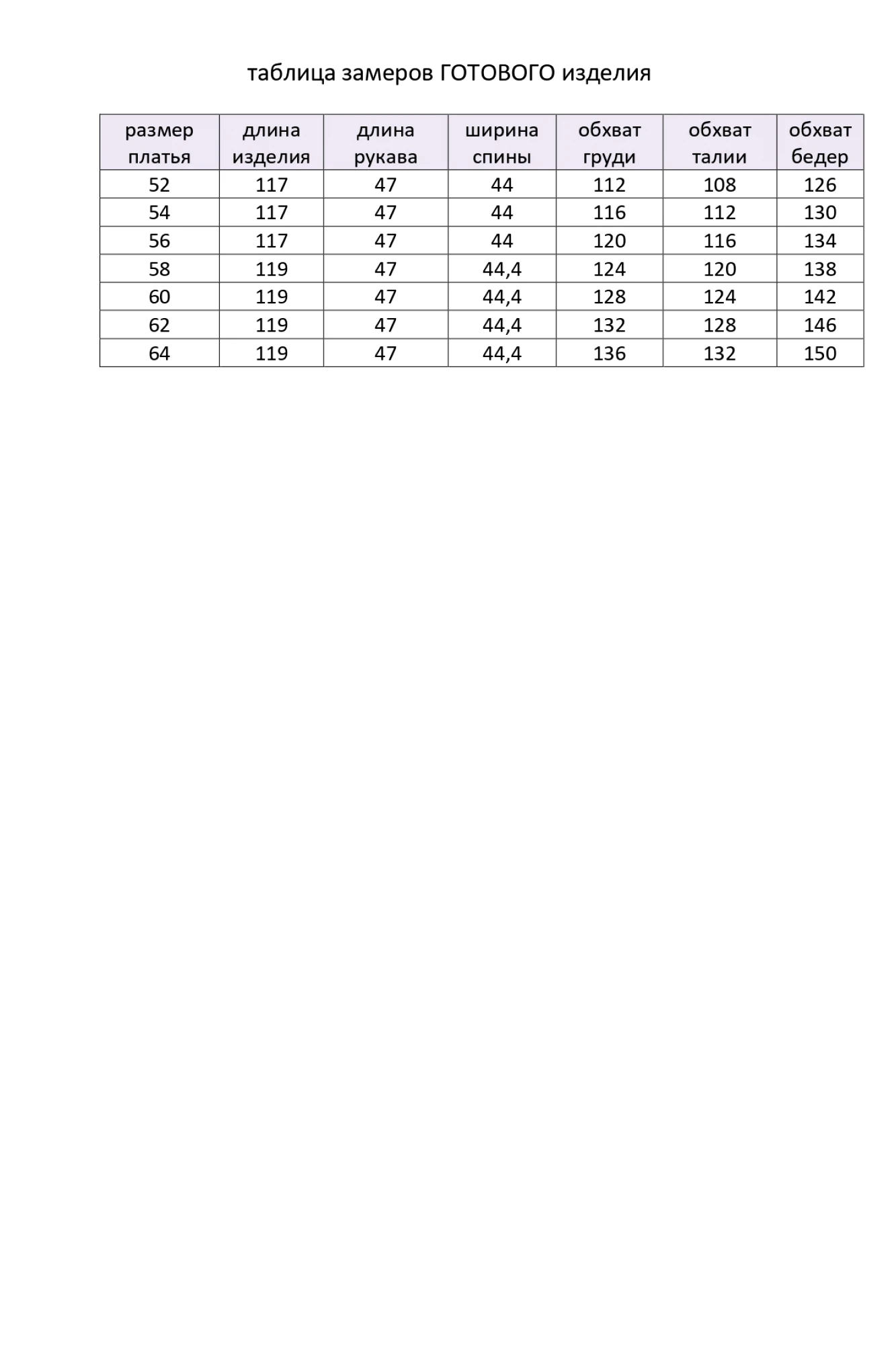 Таблица размеров