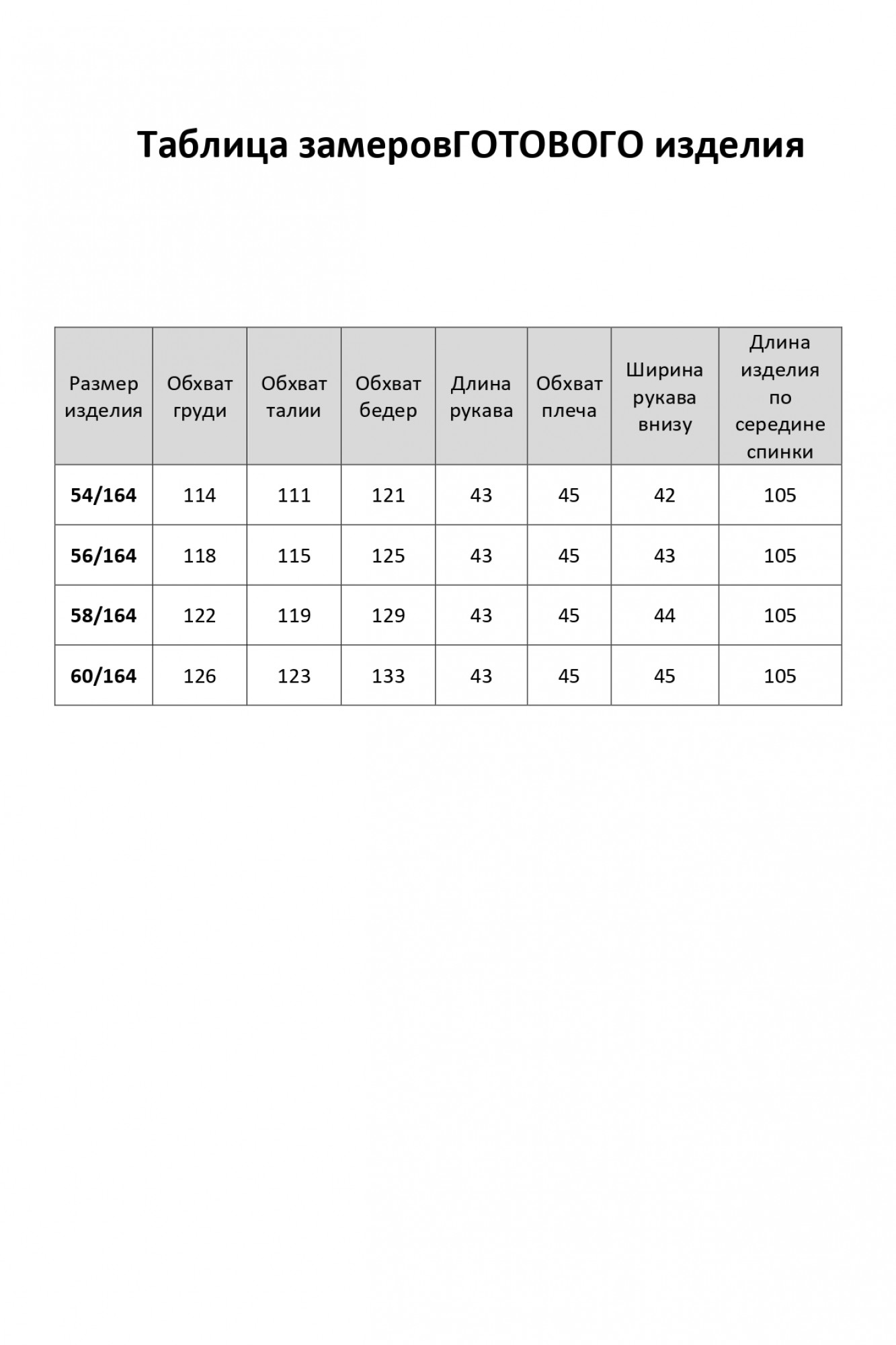 Таблица размеров