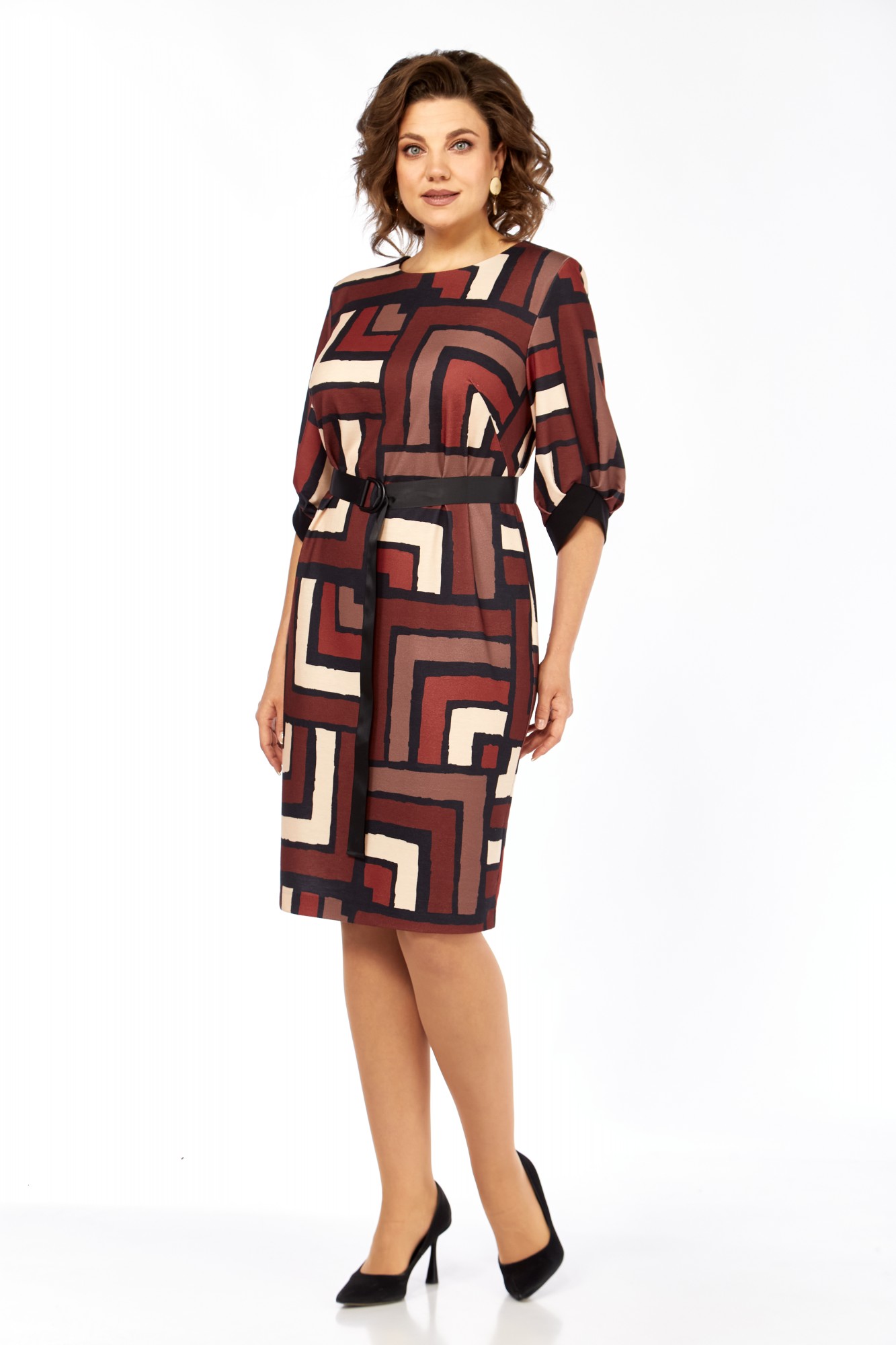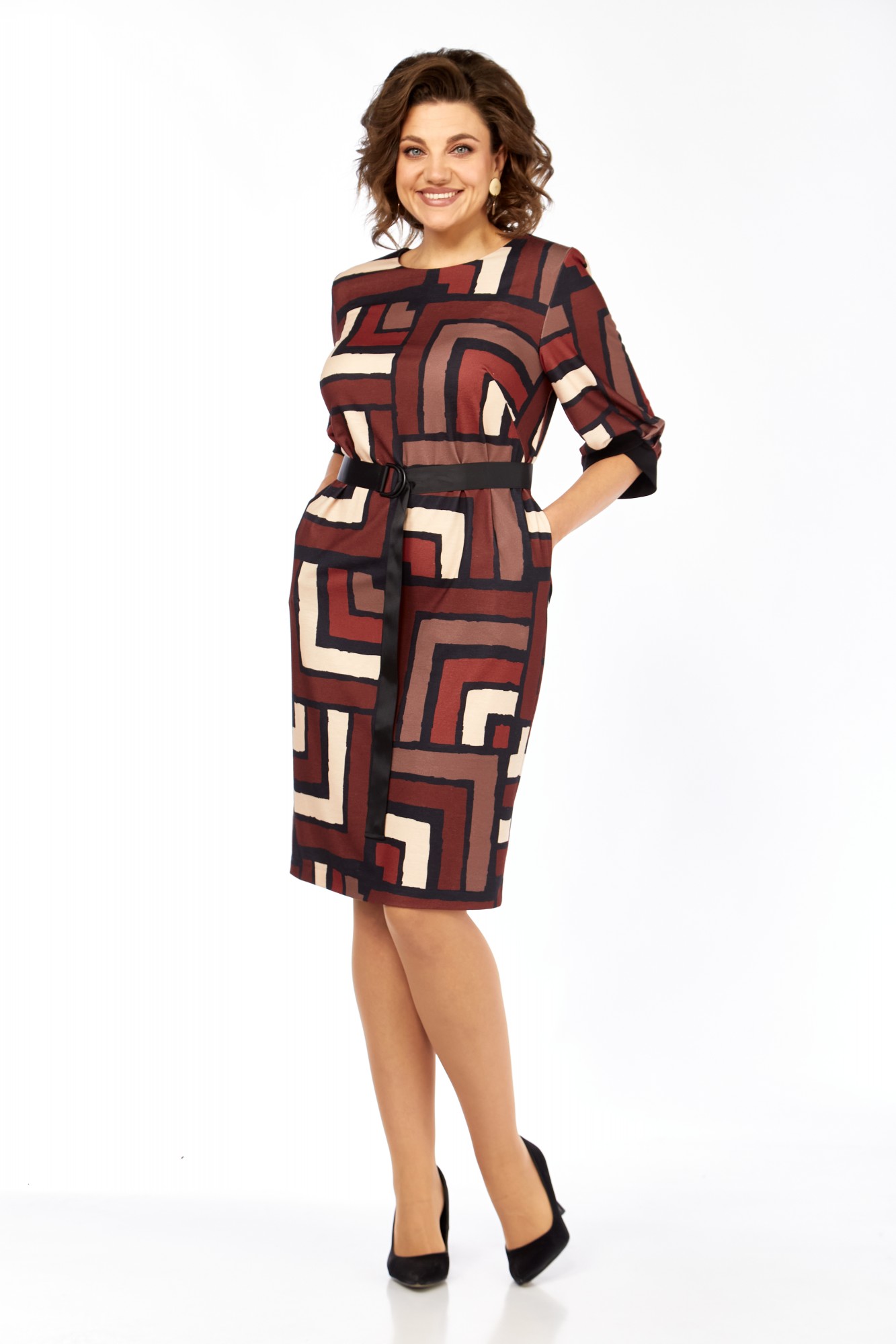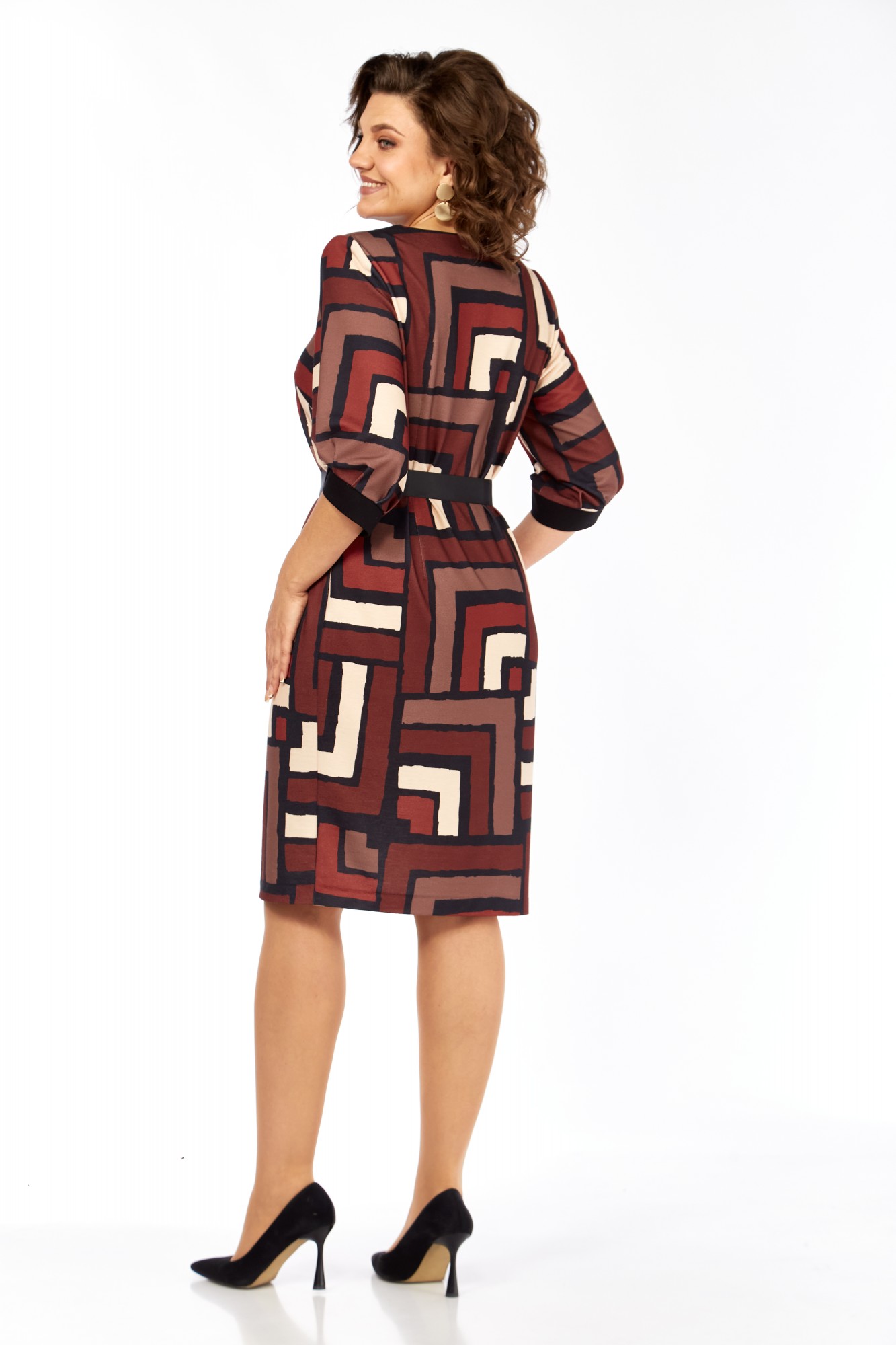 Платье из трикотажного полотна, геометрического рисунка, полуприлегающего силуэта. По переду нагрудные вытачки выходящие из бокового шва. Горловина округлой формы, на обтачке. Спинка с таллиевыми вытачками. Рукав втачной, 3/4 длина, одношовный. Рукав формы "фонарик" по низу имеет мягкие складки, обработан притачной фигурной манжетой. К платью прилагается съемный пояс.