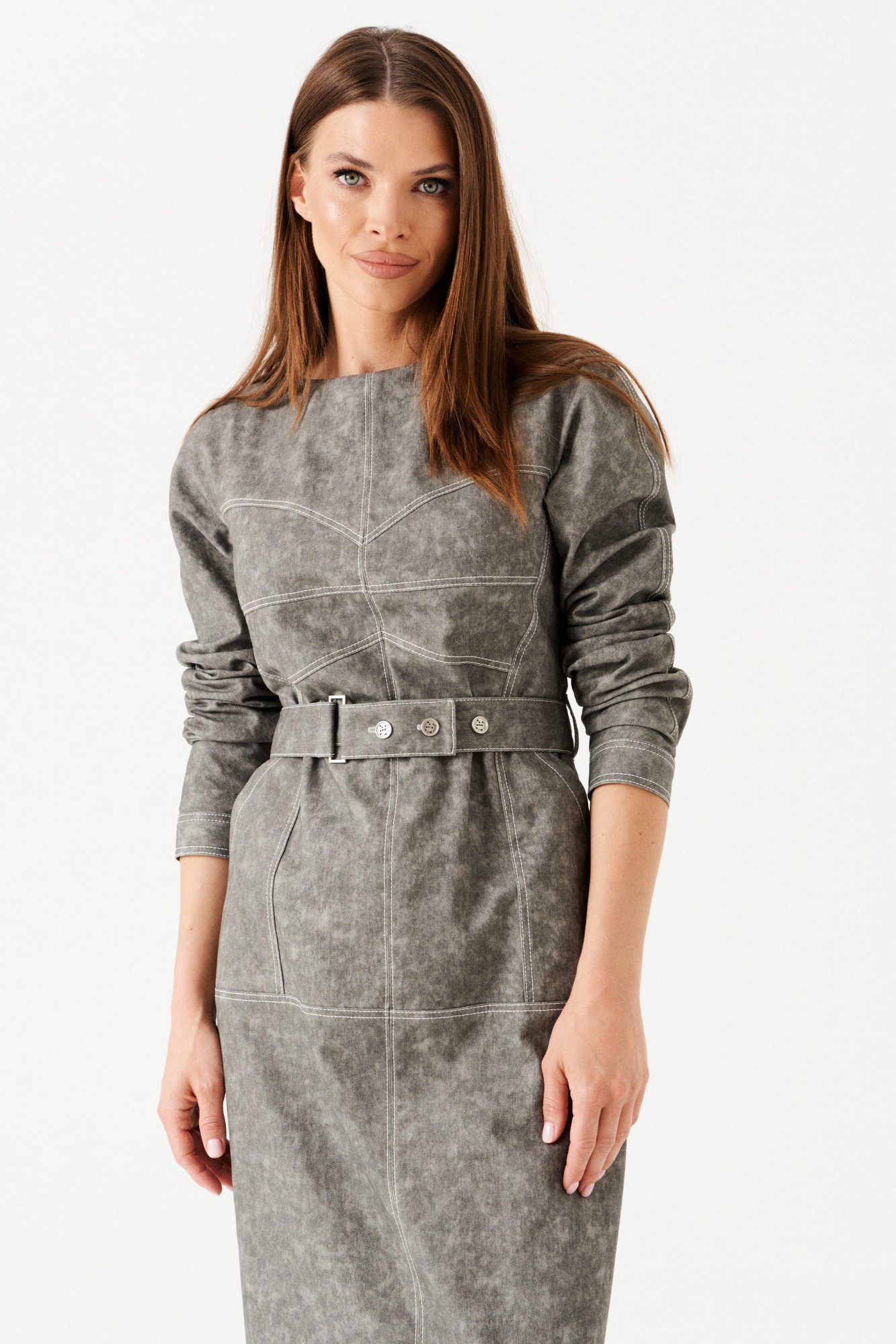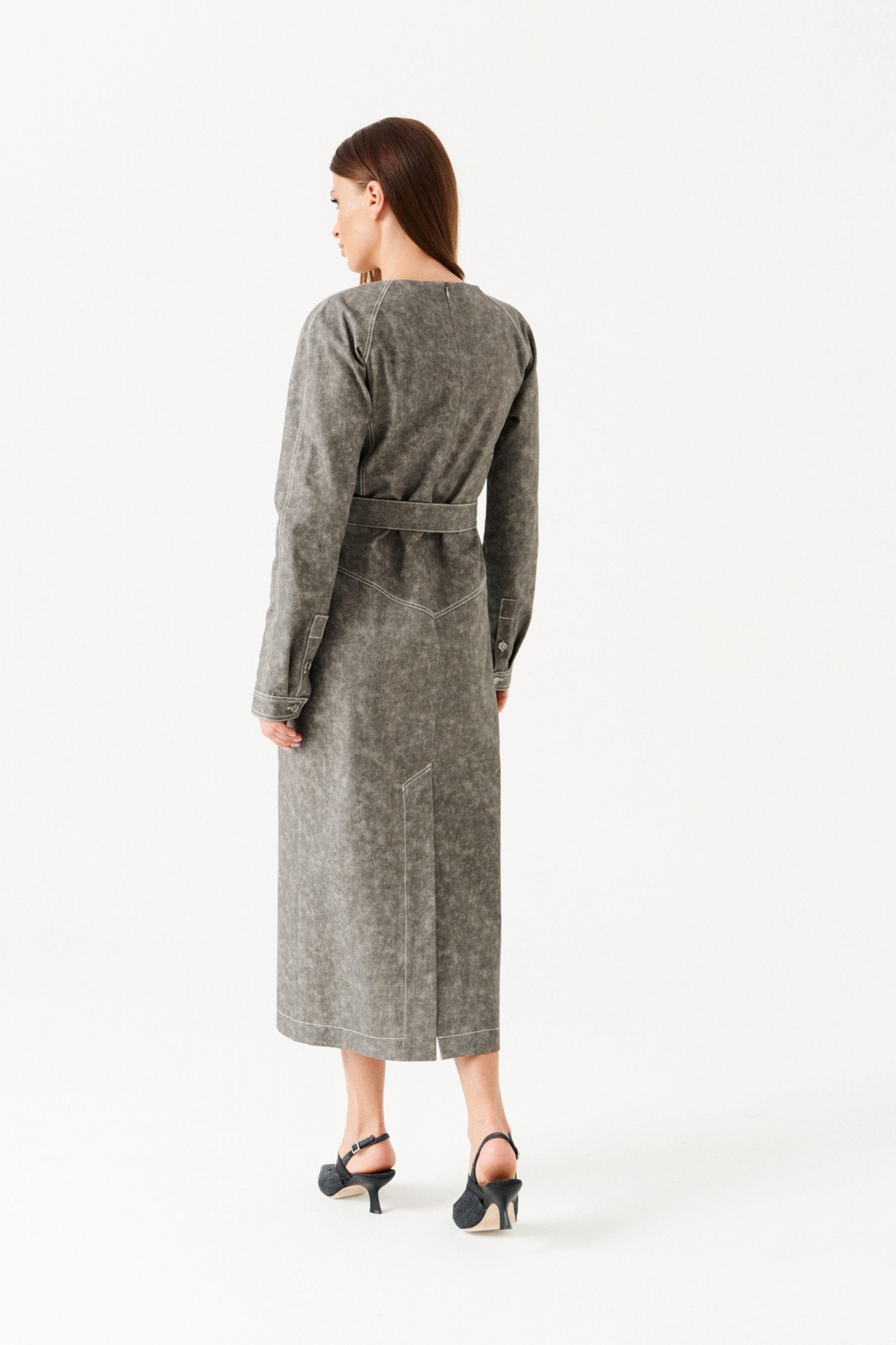 Платье женское из джинсовой хлопковой ткани, отрезное, длинное, полуприлегающего силуэта, с застежкой на потайную молнию в среднем шве спинки. Перед с круглым вырезом горловины, средним швом, горизонтальным подрезом на уровне линии бедер, накладными карманами с отрезным бочком, декоративно-конструктивными корсетными линиями с контрастной отстрочкой. Верхняя часть спинки с рельефами. Нижняя часть спинки с кокеткой и шпицей. Рукав — реглан, по низу манжета с застежкой на петли и пуговицы. В комплекте съемный пояс из основной ткани, на резинке, с застежкой на петли и пуговицы.