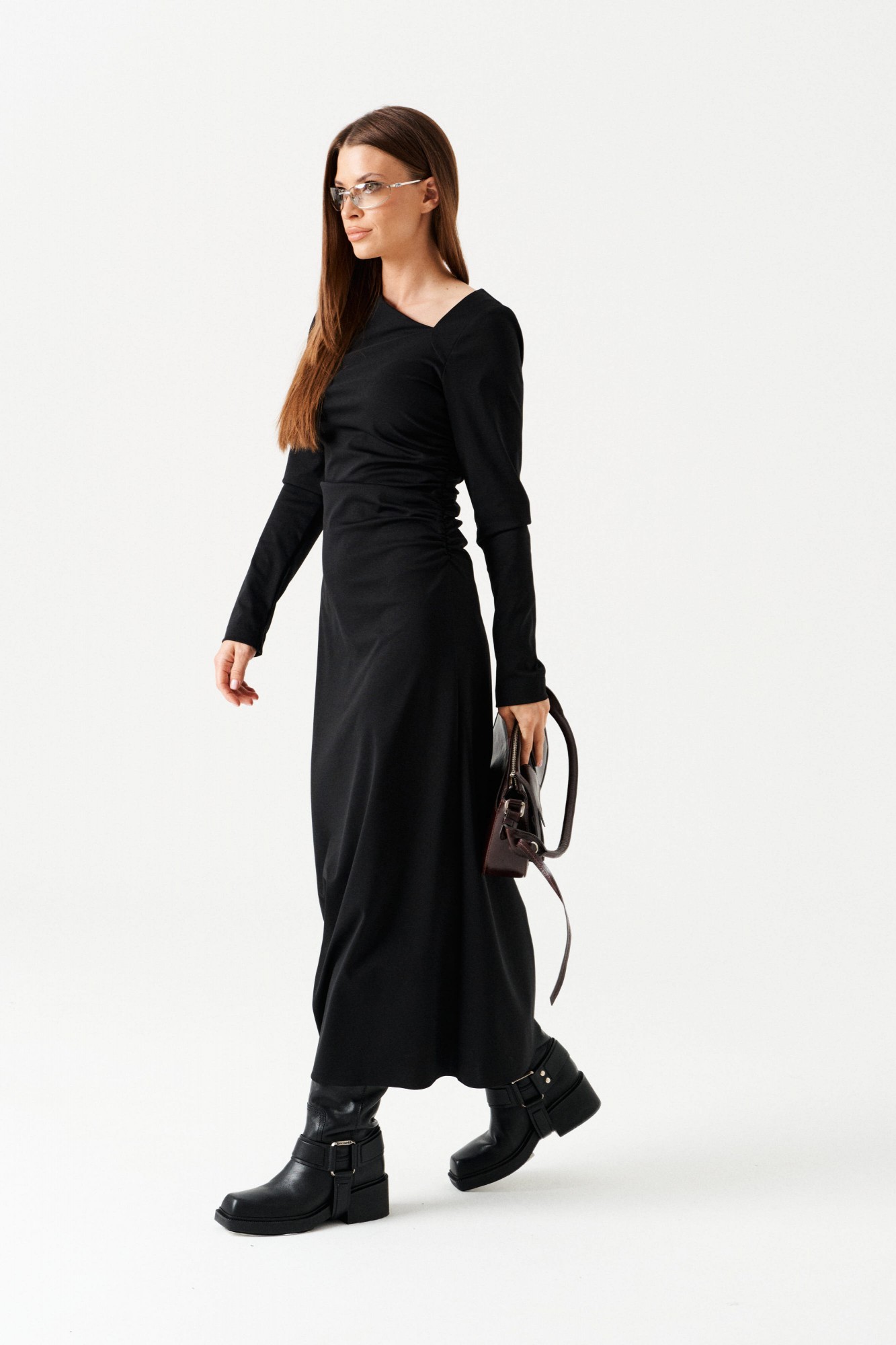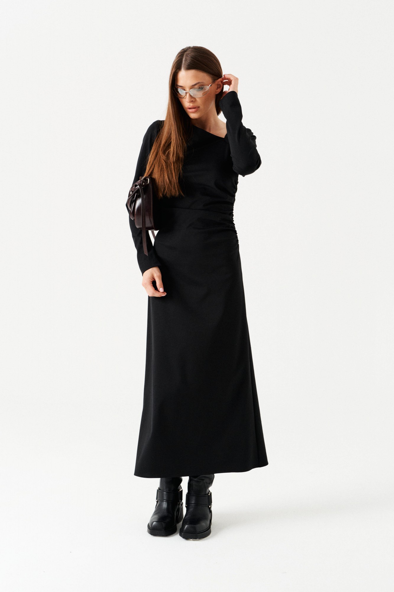 Платье женское из трикотажного полотна, прилегающего силуэта, длинное, с асимметричным вырезом горловины. Перед с нагрудными вытачками. Спинка цельная. В левом боковом шве сборка на резинку. Рукав втачной, длинный.