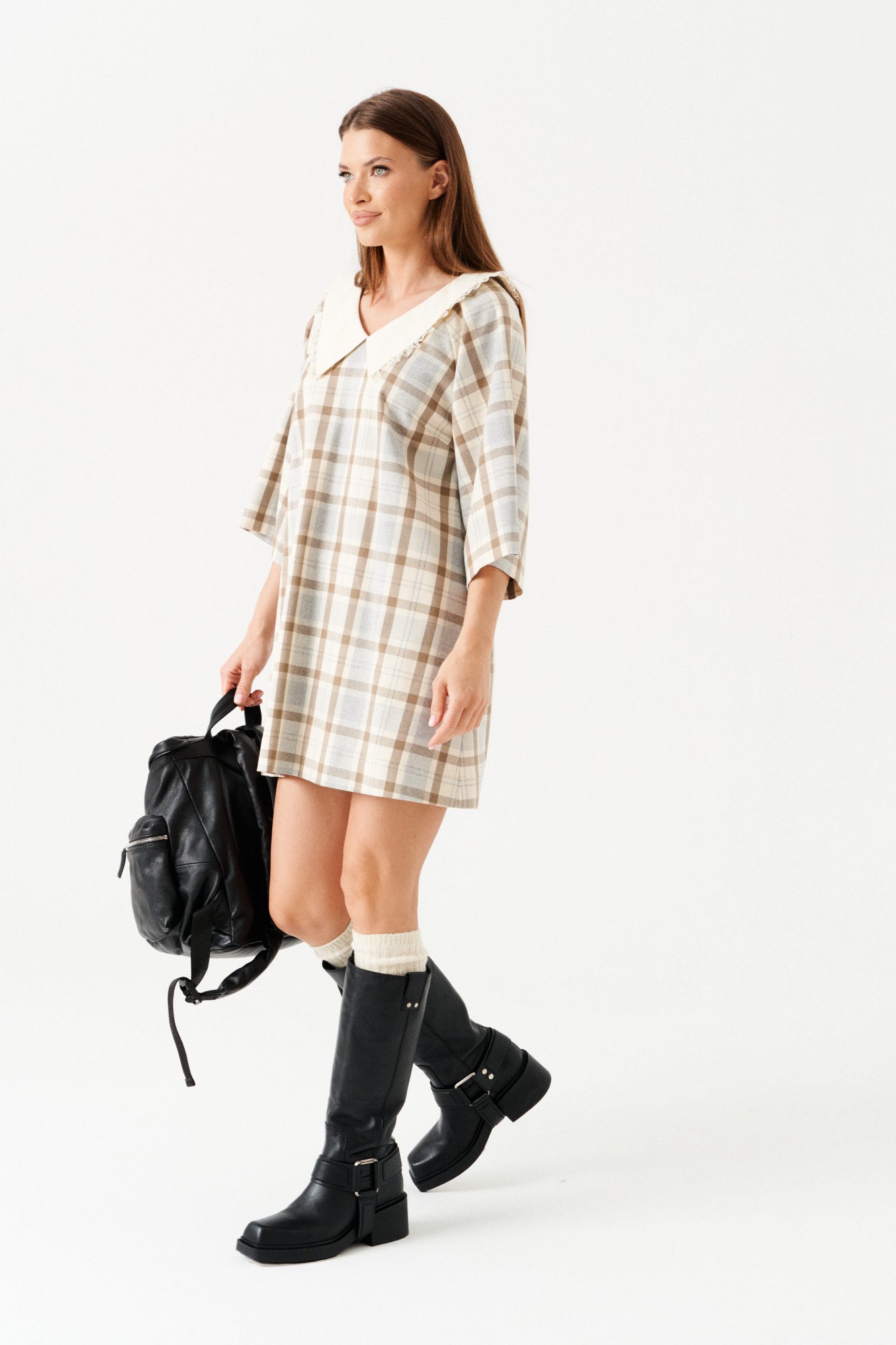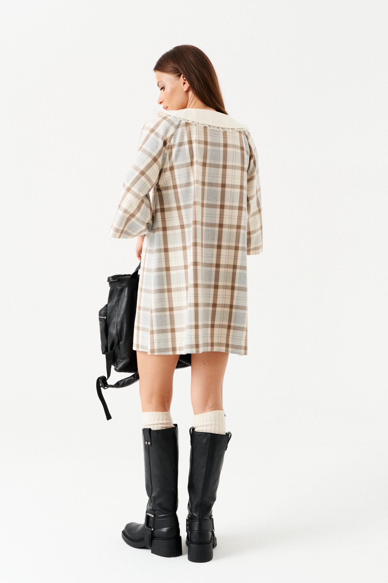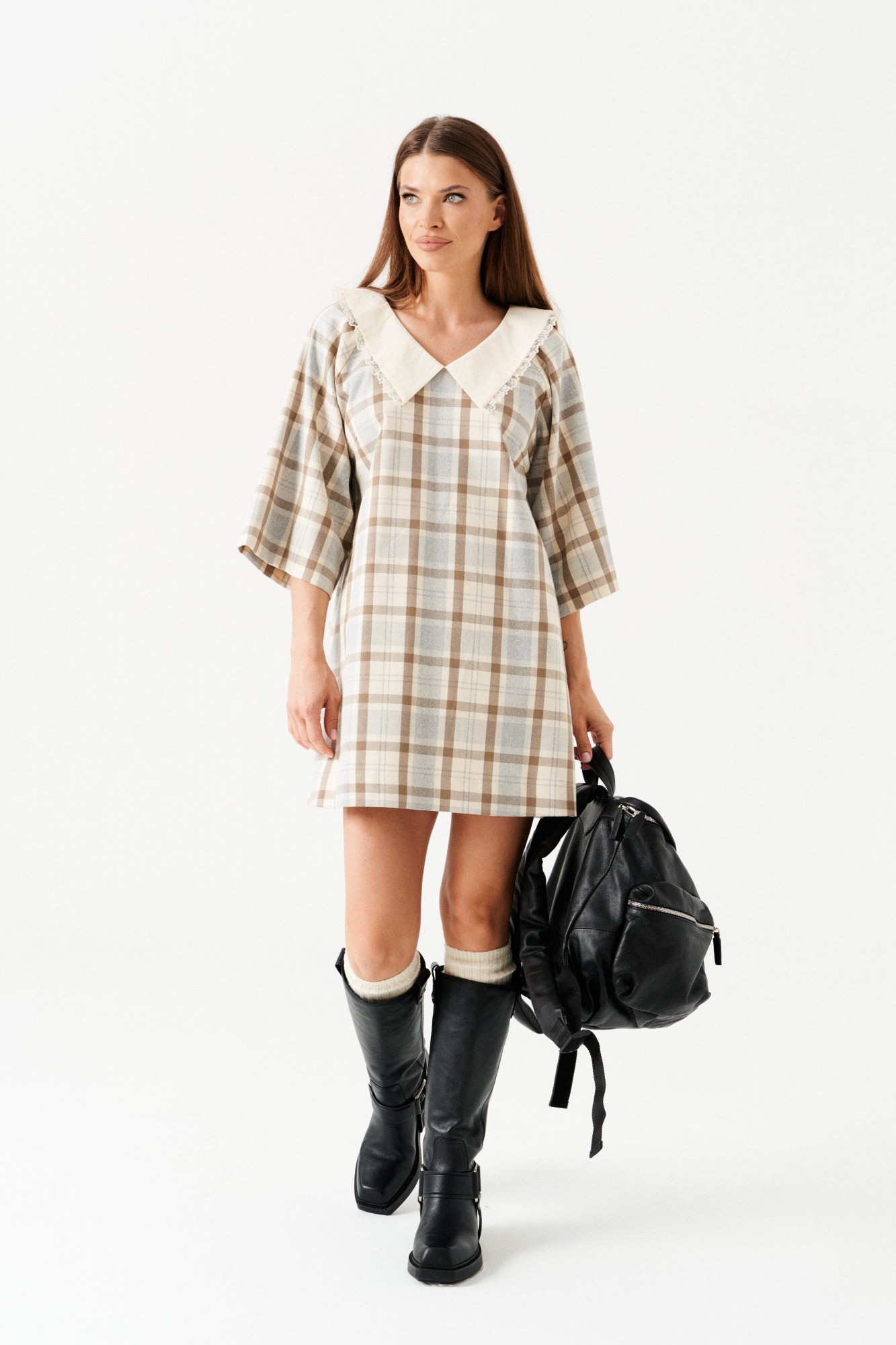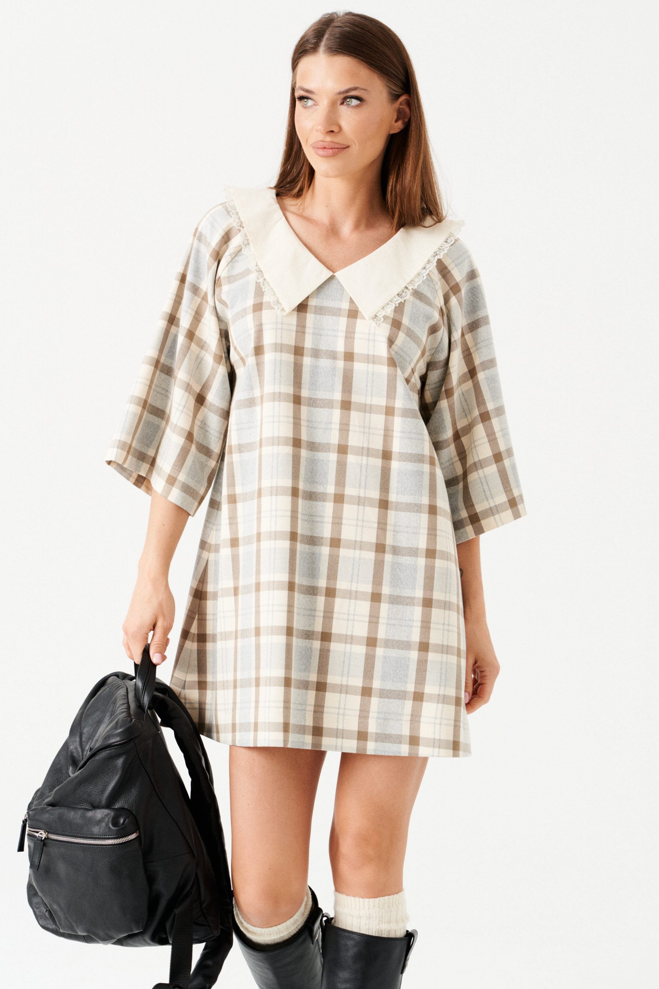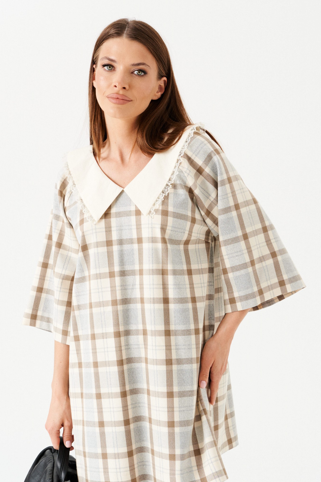Платье женское, свободное, расширенное книзу, с V-образным вырезом горловины. Перед с нагрудными вытачками. Спинка цельная. Воротник отложной из хлопковой ткани. Край воротника оформлен кружевом. Рукав — реглан, длиной 3/4, широкий, расширенный книзу. Длина до колен.