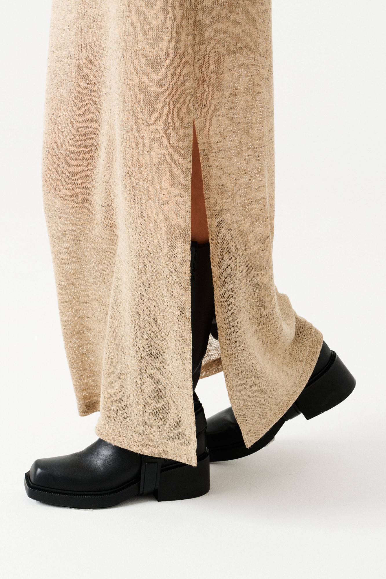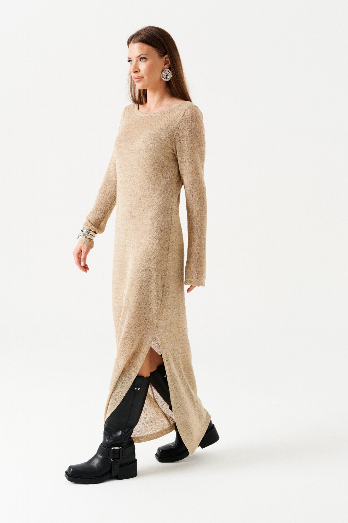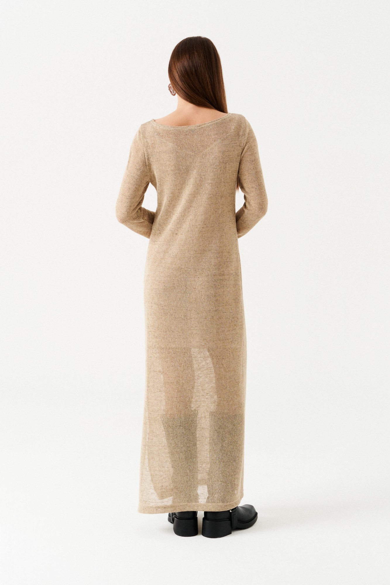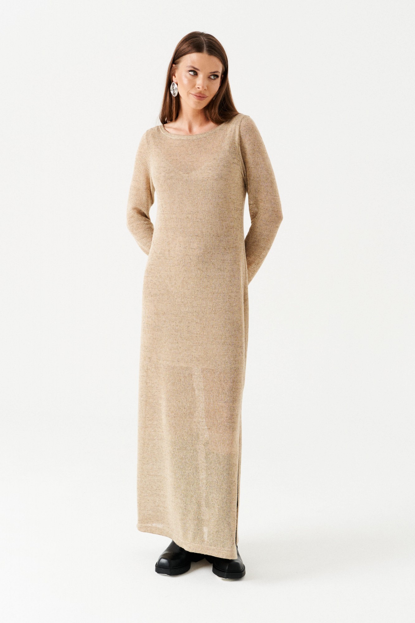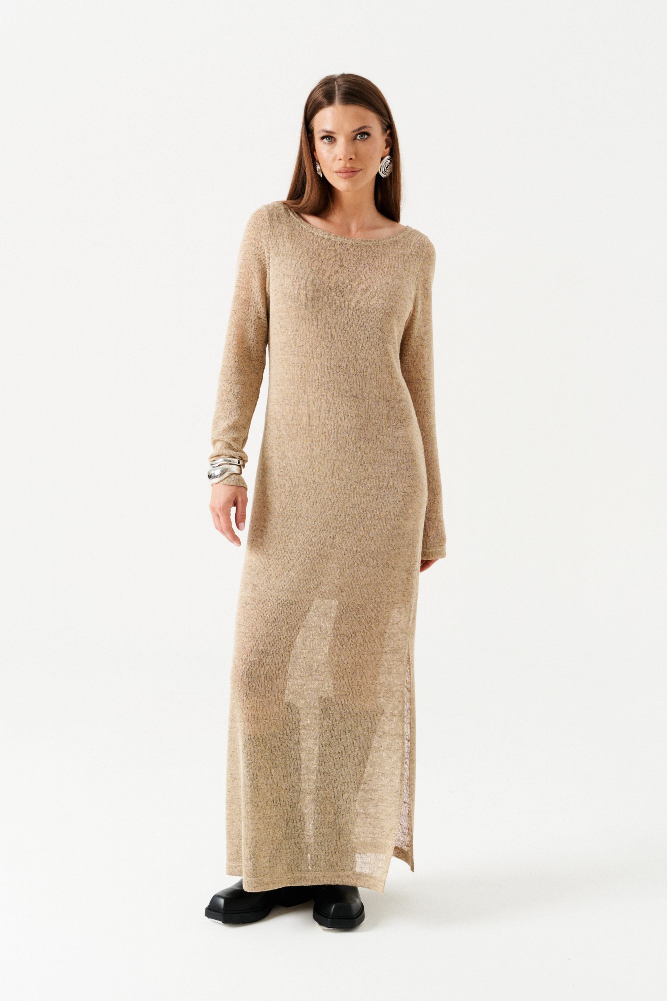 Двойное платье из трикотажного полотна. Верхнее платье прямого силуэта, с круглым вырезом горловины. Длина – макси. Нижнее платье полуприлегающего силуэта на бретелях из основной ткани. Длина нижнего платья – до колен.