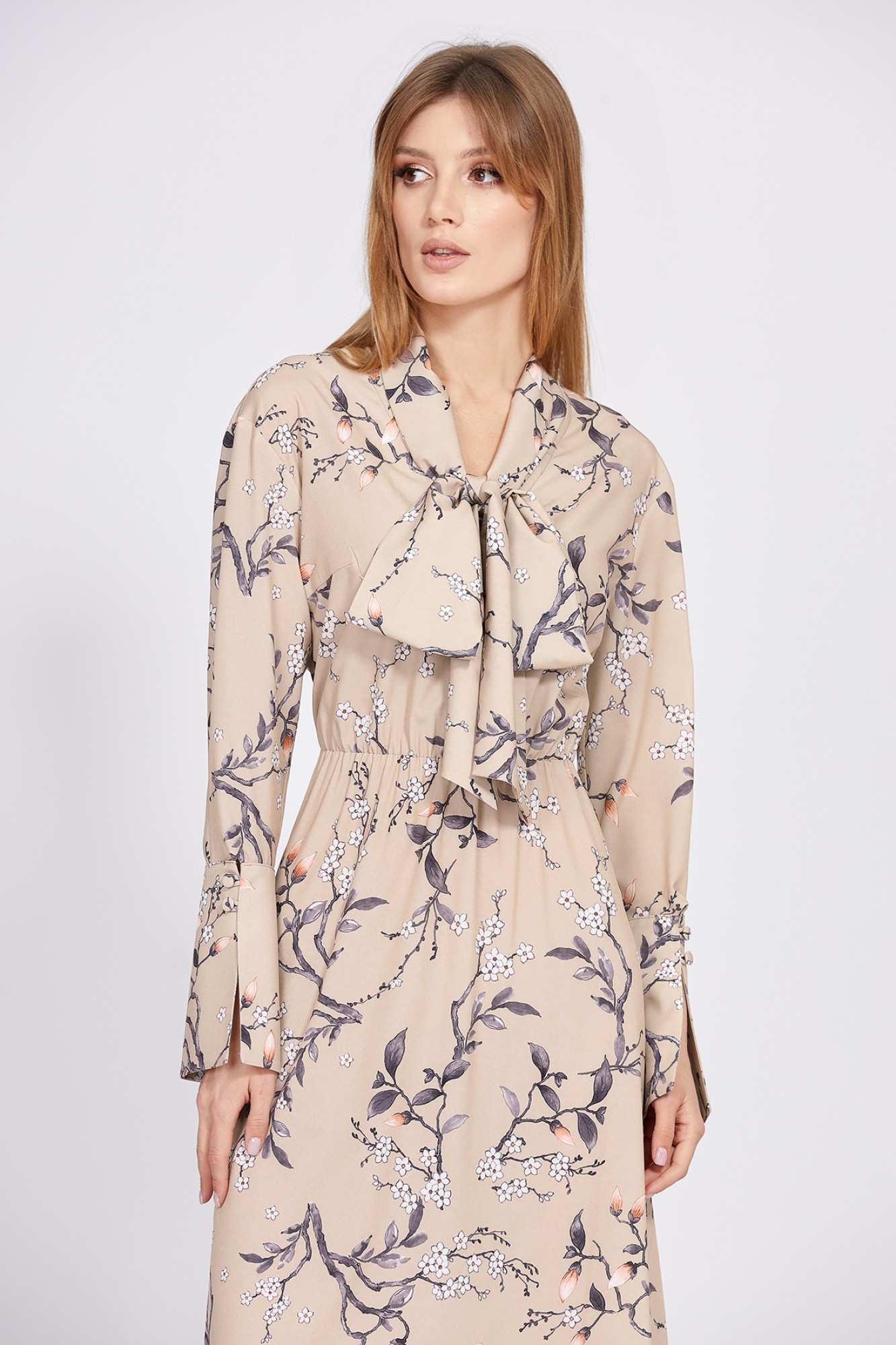 Платье выполнено из плательной ткани с принтом. Платье Х-образного силуэта, отрезное по линии талии, длиной миди. Горловина V-образной формы. Воротник на стойке, переходящий в завязывающийся бант спереди. Рукав втачной одношовный, низ рукава на манжете с застежкой на две пуговицы. Юбка расширена к низу. По линии талии настрочена эластичная тесьма.