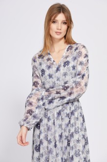 Платье выполнено из шифона с принтом. Платье Х-образного силуэта, отрезное по линии талии, длиной миди. Вырез V-образной формы. Рукав цельнокроенный, покроя ""летучая мышь"". Низ рукава присборен, на эластичной тесьме. Юбка расширена к низу. По линии талии вставлена эластичная тесьма. Платье на трикотажной подкладке, лиф которой выполнен в виде топа. В комплект входит съёмный пояс с обтяжной пряжкой.