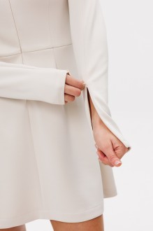 Платье выполнено из трикотажного полотна. Платье приталенного силуэта, отрезное по линии талии, длиной выше линии колена. Спереди вытачки для прилегания цельнокроеной стойки и средний шов с застежкой на потайную молнию. Рукав втачной, двухшовный с локтевой вытачкой. В переднем шве рукав с потайной молнией.