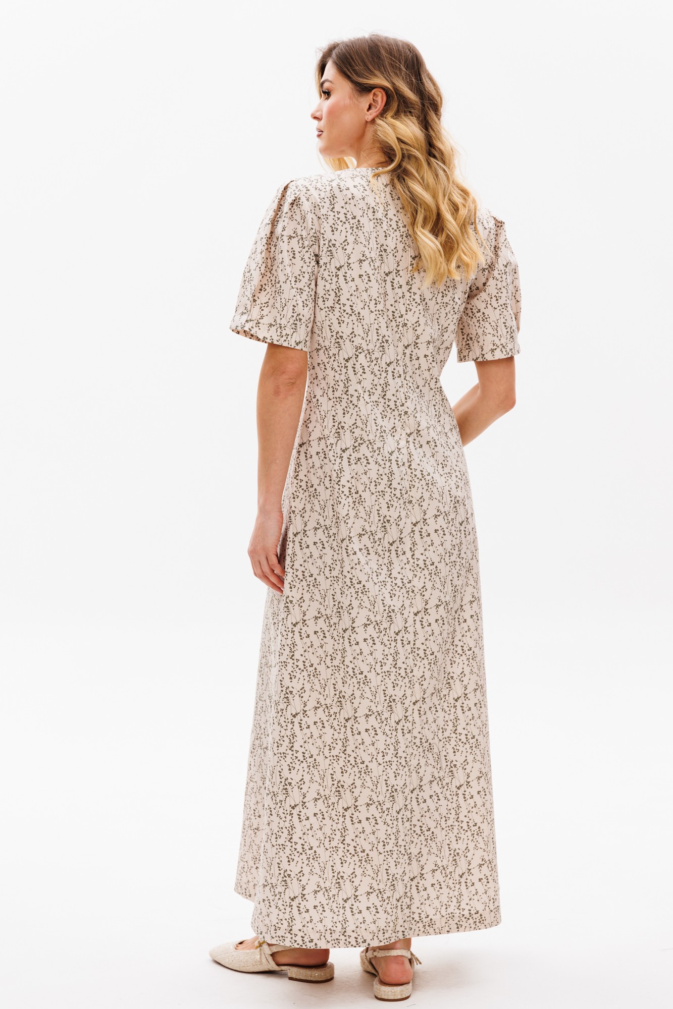 Платье выполнено из плательно-блузочной ткани с принтом. Платье А-образного силуэта, длиной миди. Перед отрезной под грудью. Спереди застежка на пуговицы. По плечевому шву по переду обработаны складки. Горловина V-образной формы. Плечевой шов удлинен с плечевой накладкой. Рукав втачной, одношовный, длиной чуть выше линии локтя. По окату и низу рукава обработаны складки. На спинке средний шов с застежкой на потайную молнию.