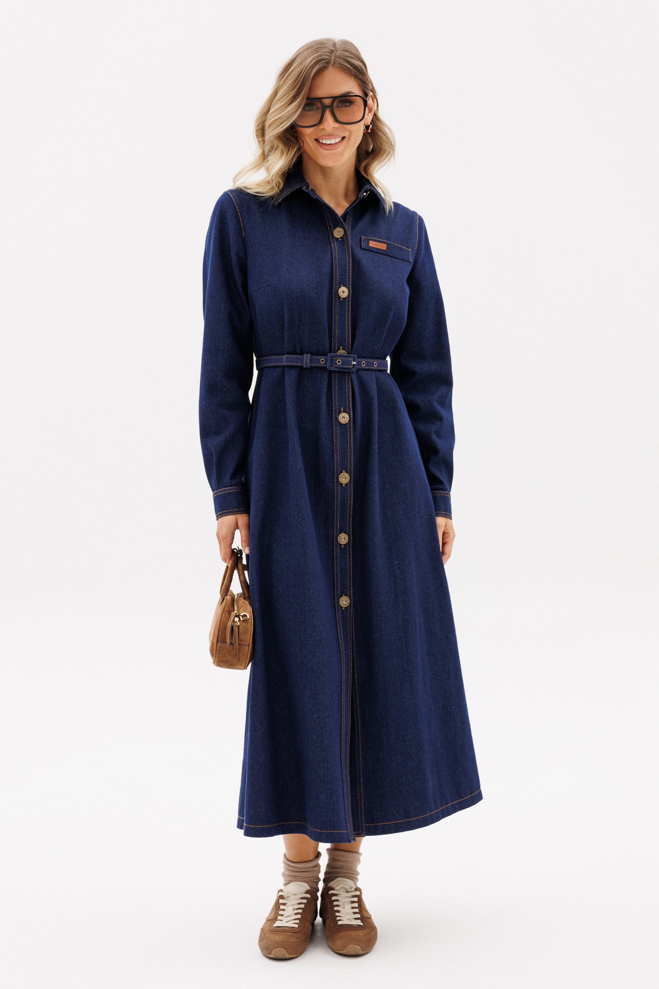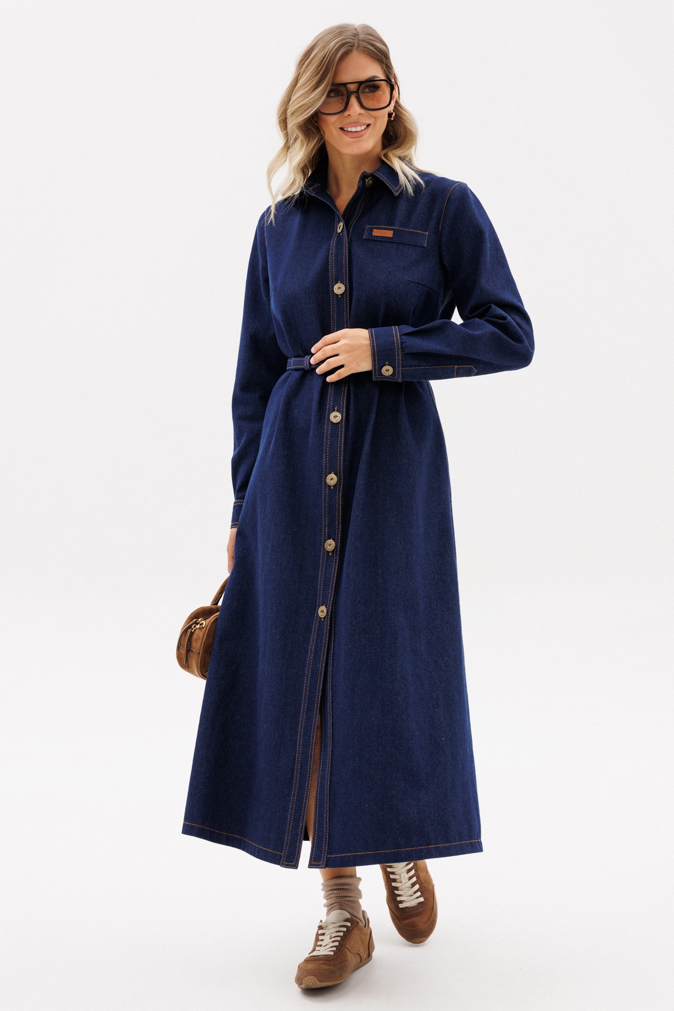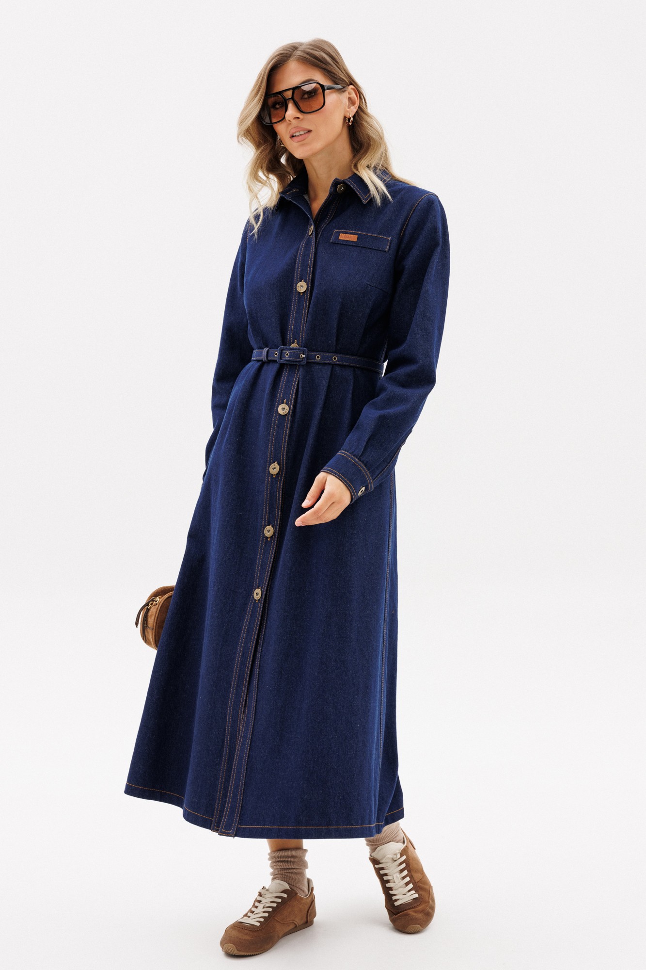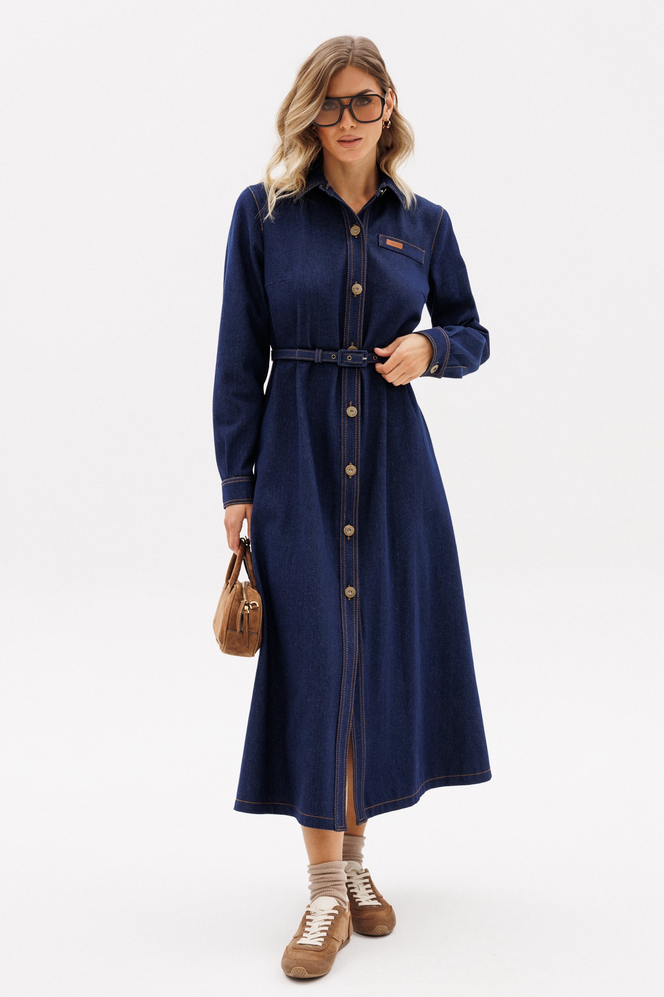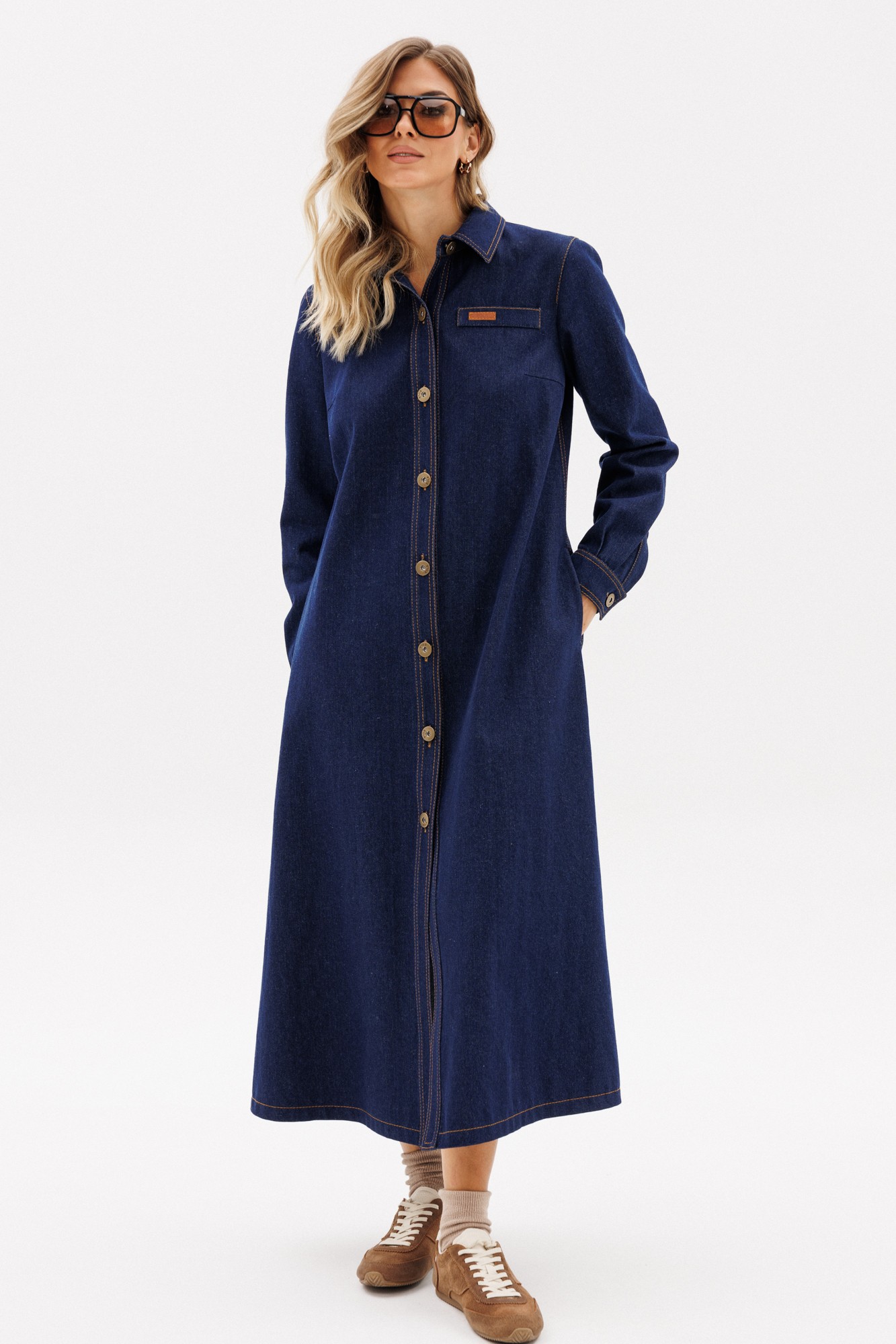 Платье выполнено из джинса. Платье рубашечного силуэта, длиной миди. Застежка спереди на металлические пробивные пуговицы. На спинке кокетка и встречная складка от нее. Воротник стояче-отложной с отрезной стойкой. Рукав втачной, одношовный, с прорезью и складкой по низу. Низ рукава на манжете, застегивающейся на пуговицу. В боковых швах карманы. Платье декорировано нашивками по переду и спинке.