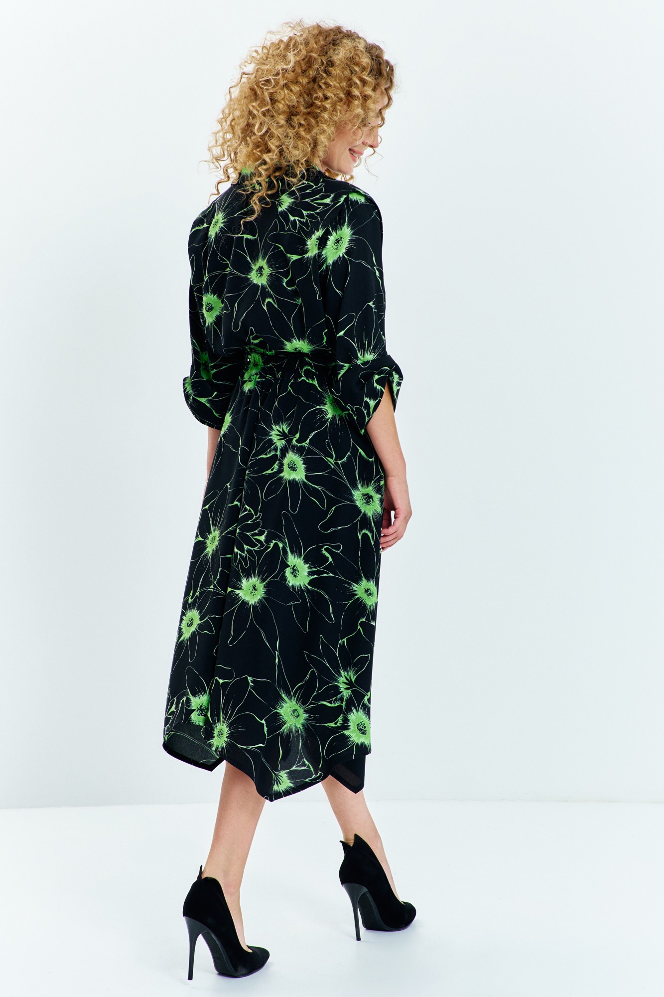Платье женское выполнено в романтичном стиле, полуприлегающего кроя. Изделие отрезное по линии талии с регулирующей эластичной лентой в талии. Лиф платья свободного кроя с декоративными защипами и заложенными складками по талии и плечам. Рукав втачной приспущенный широкий с манжетой по низу. Юбка полусолнце с ассиметричным низом, в боковых швах юбки расположены фигурные карманы. Лицевая сторона ткани имеет сатиновый блеск и гладкость.
