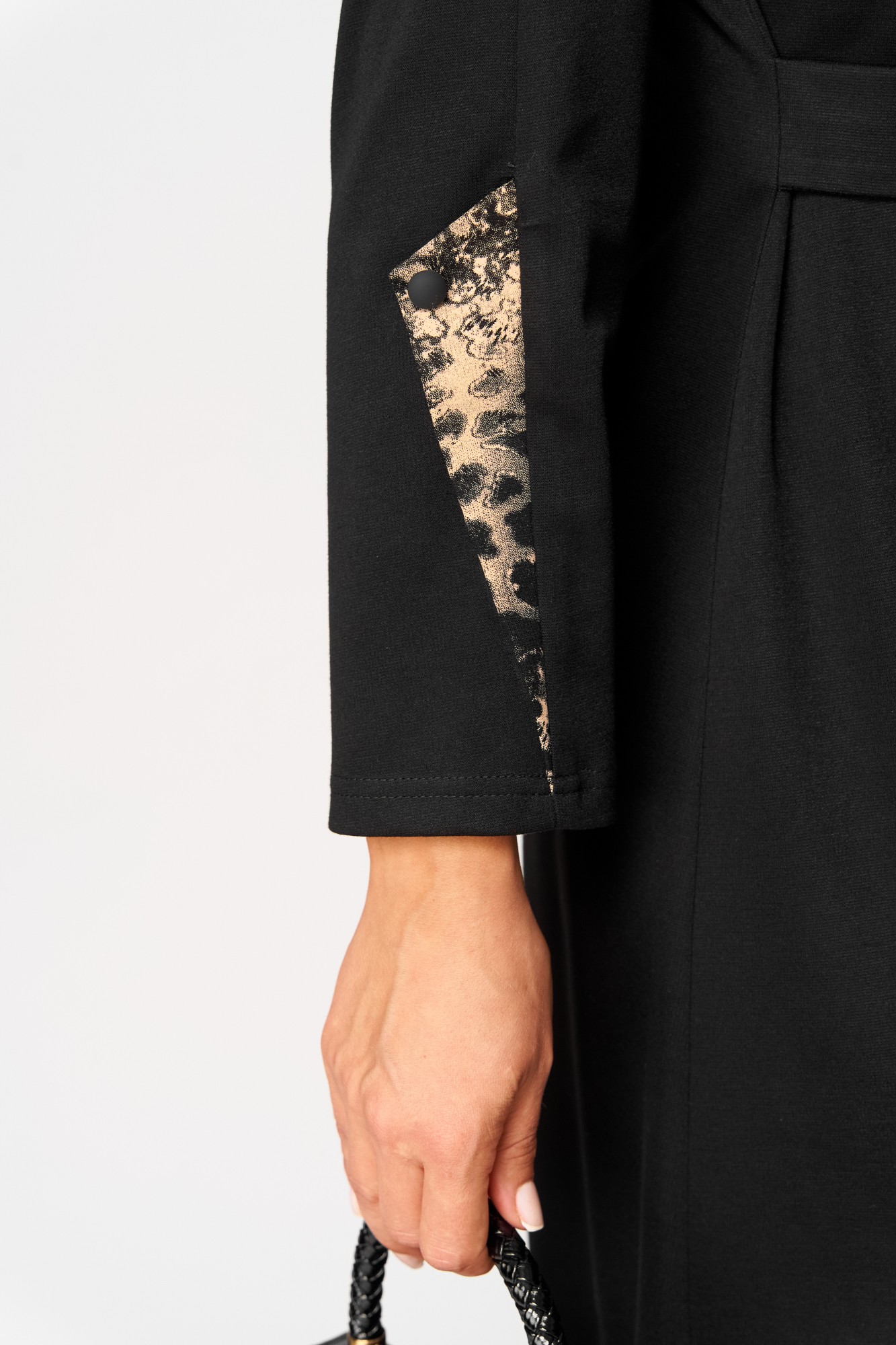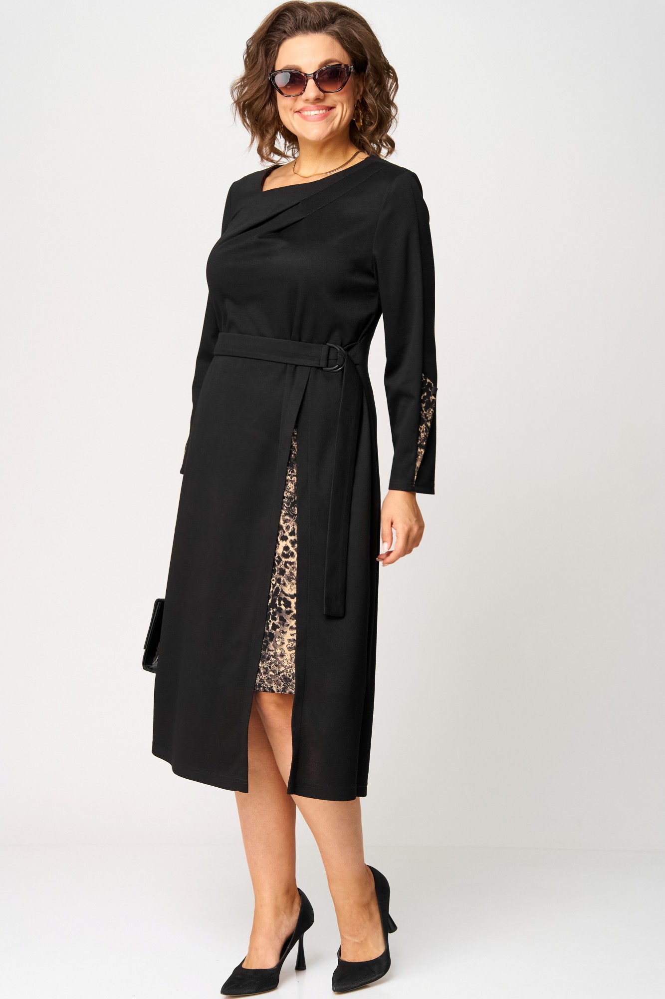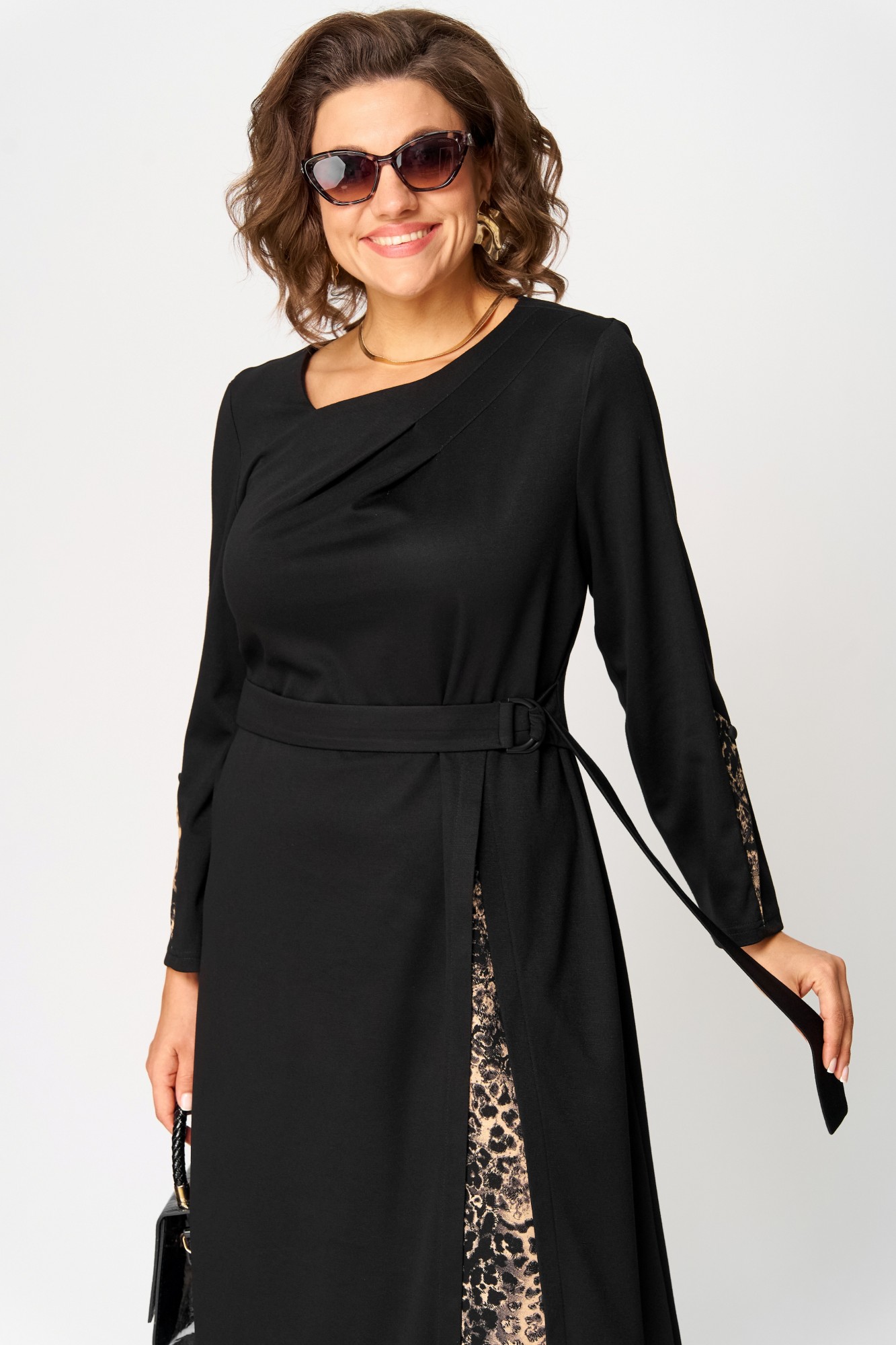 Платье женское повседневное полуприлегающего силуэта, выполнено из трикотажного полотна в сочетании с отделкой. Вырез горловины V-образный на обтачке. Рукав втачной 7/8 по низу нв притачной манжете из отделочной ткани. По переду платье с выточками и отрезными ассиметричными элементами из отделочной ткани. По центру платья обработан небольшой разрез. Декором служит сьемный пояс из основной ткани.