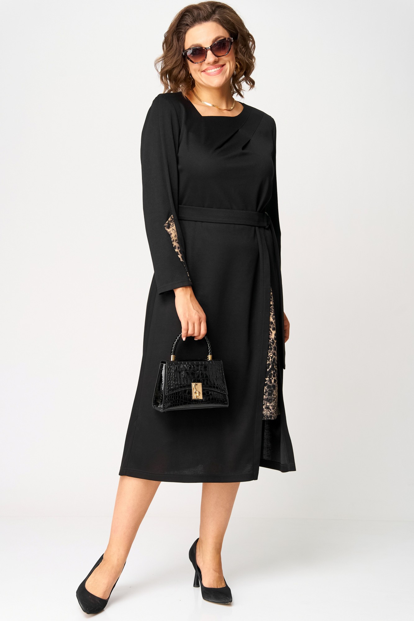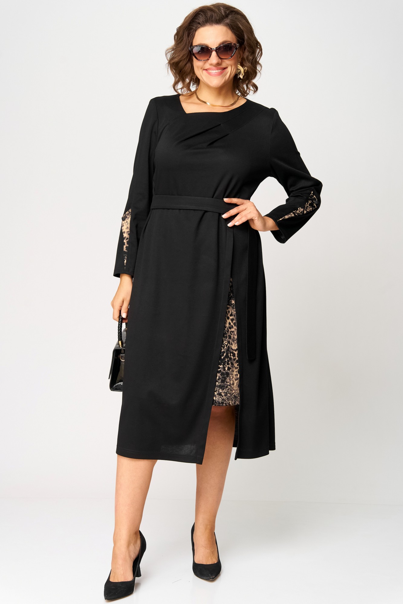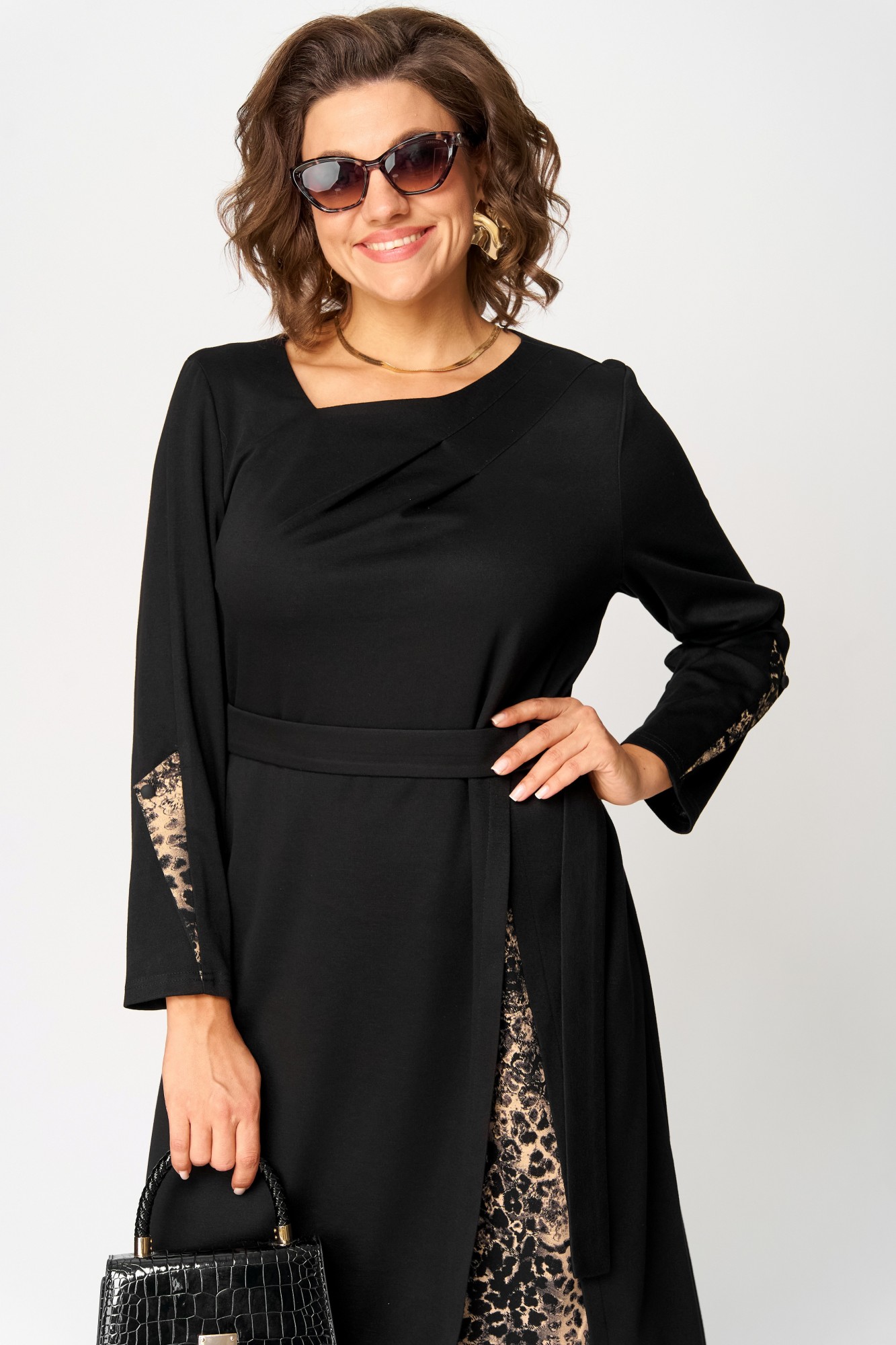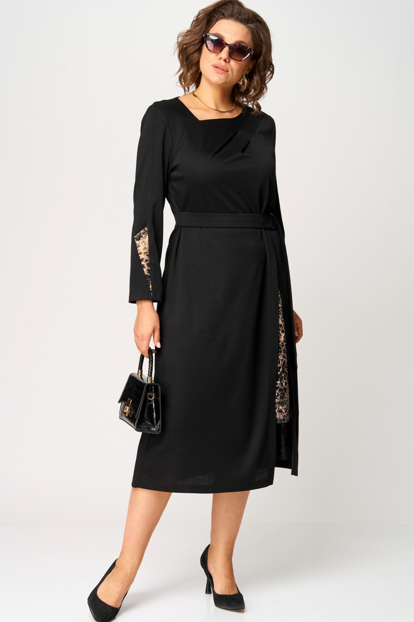 Платье женское повседневное полуприлегающего силуэта, выполнено из трикотажного полотна в сочетании с отделкой. Вырез горловины V-образный на обтачке. Рукав втачной 7/8 по низу нв притачной манжете из отделочной ткани. По переду платье с выточками и отрезными ассиметричными элементами из отделочной ткани. По центру платья обработан небольшой разрез. Декором служит сьемный пояс из основной ткани.