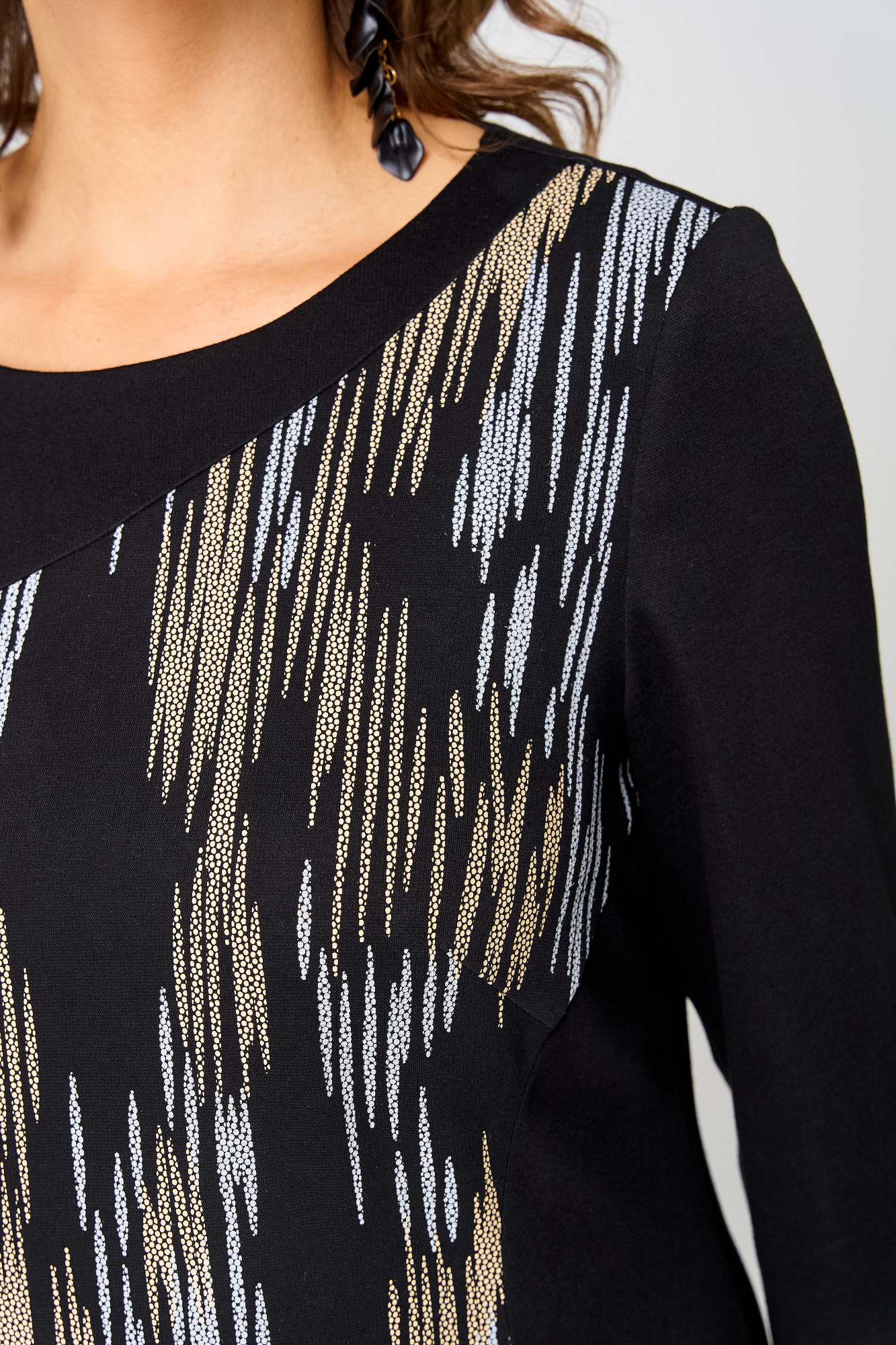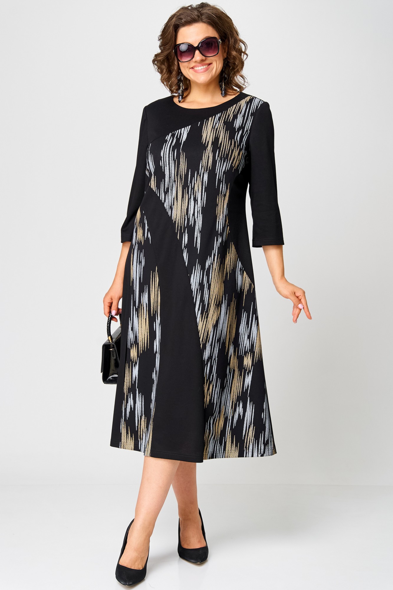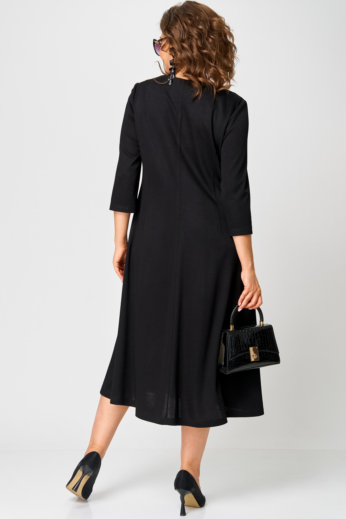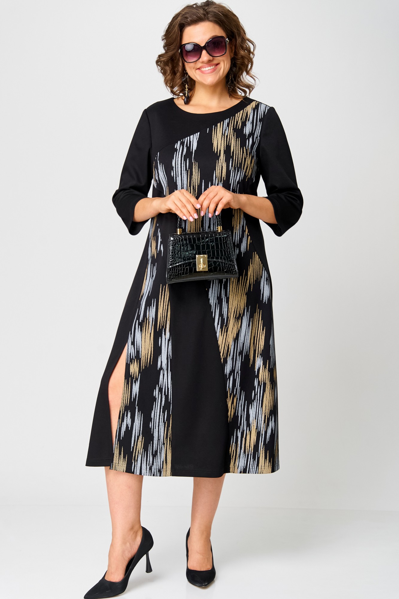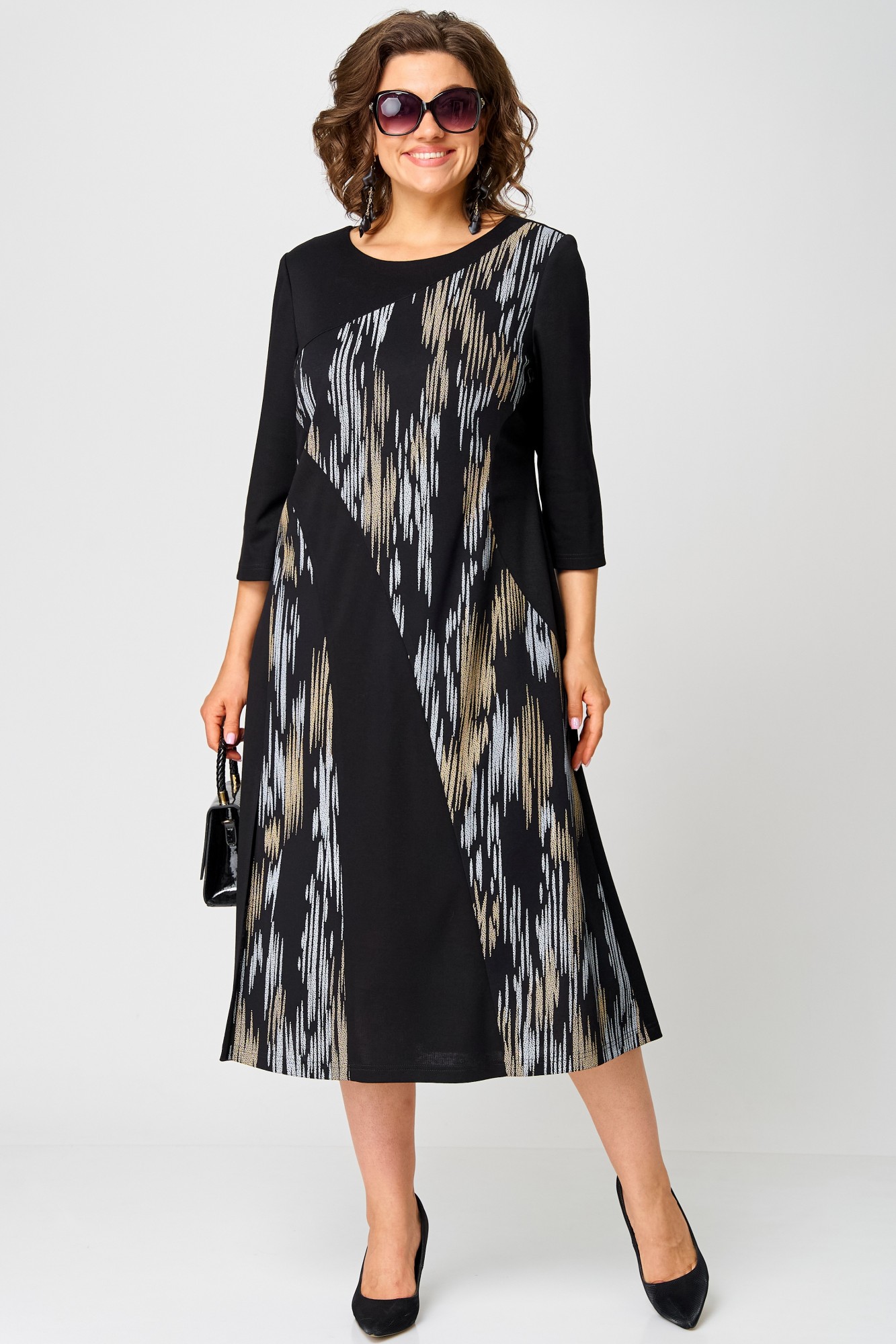 Платье женское повседневное полуприлегающего силуэта расширенное к низу, выполнено из трикотажного полотна двух дизайнов. Вырез горловины круглый на обтачке. Рукав втачной 3/4. Спинка платья выполнена из однотона, полочка с отделочными вставками из цветного трикотажа. В одном боковом шве обработан разрез. Декором платья служат вставки из отделочного трикотажа.