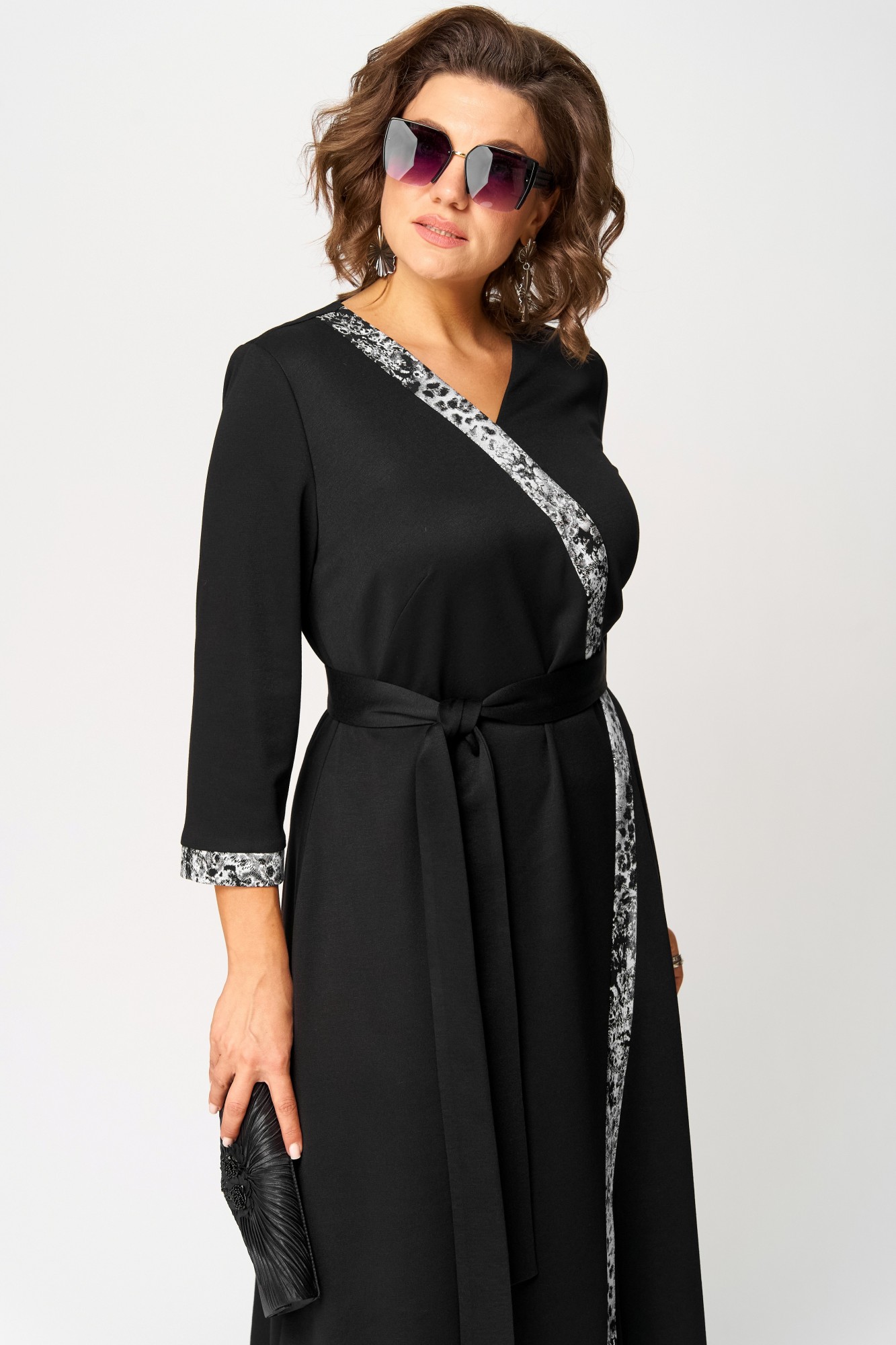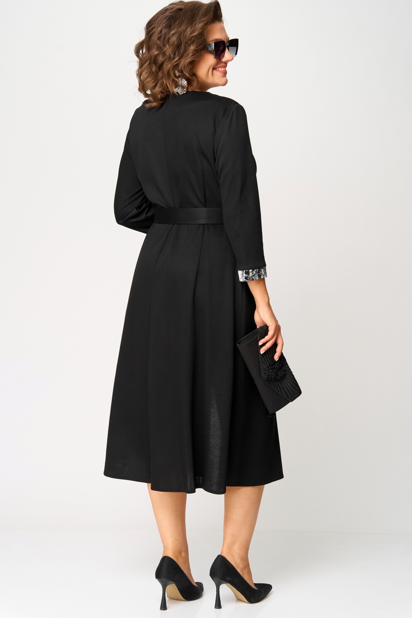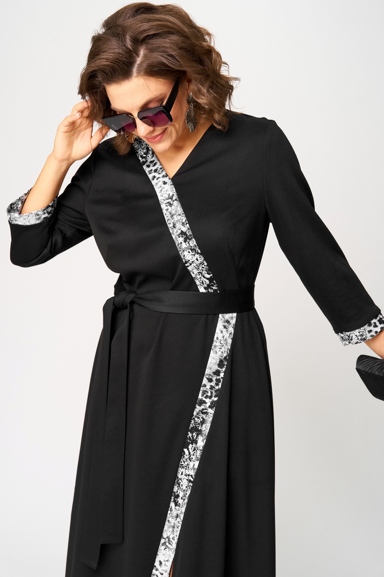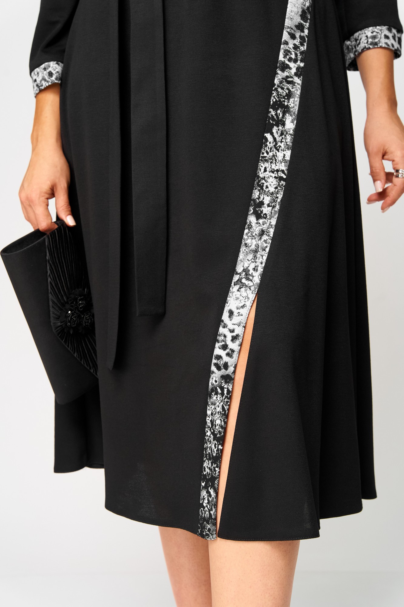 Плате женское повседневное полуприлегающего силуэта выполнено из трикотажного полотна в сочетании с отделкой. Вырез горловины V-образный на обтачке. Рукав втачной 7/8 по низу на притачной манжете из отделочной ткани. По переду платье с выточками и отрезными ассиметричными элементами из отделочной ткани. По центру платья обработан небольшой разрез. Декором платья служит съемный пояс из основной ткани.