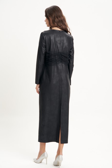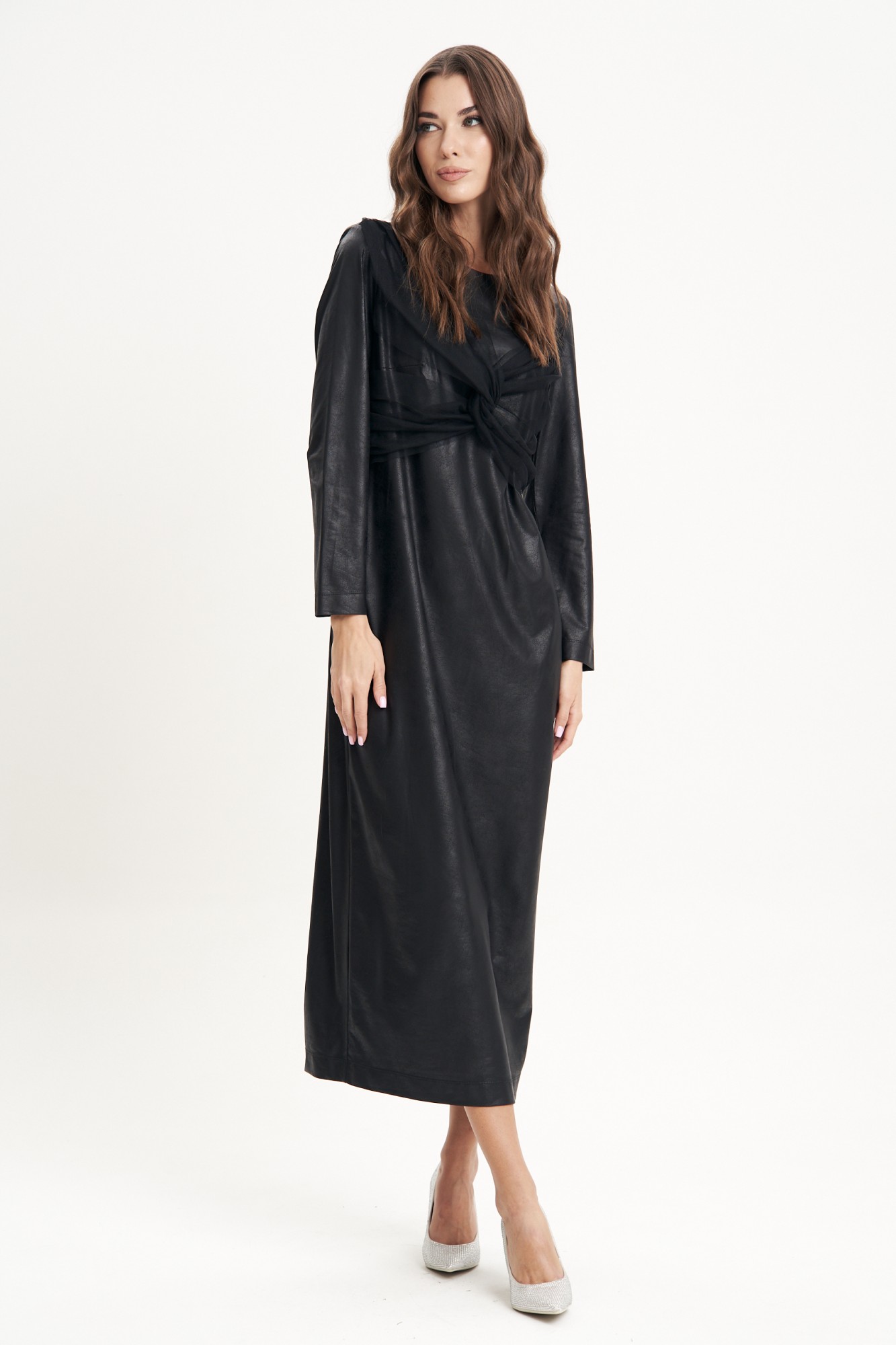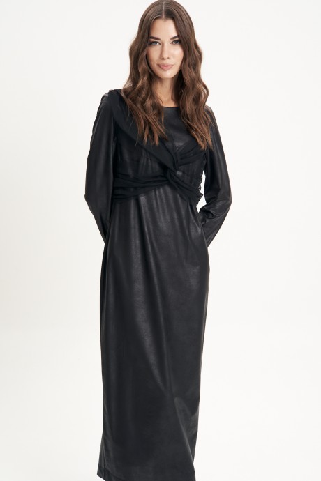 Вечно актуальное и самое эффектное! Это, конечно же, о длинном чёрном платье! Казалось бы, придумать что-то новое уже невозможно, но мы опять удивляем вас необычным сочетанием модных фактур и покроя при, казалось бы, минималистичном платье. Полуприлегающий силуэт, втачной покрой, эффектное трикотажное полотно с покрытием под кожу и потрясающе изысканный элемент из сборенной сетки по полочке и спинке. Полочка с нагрудной вытачкой, спинка с центральным швом, застёжкой на потайную молнию и разрезом.