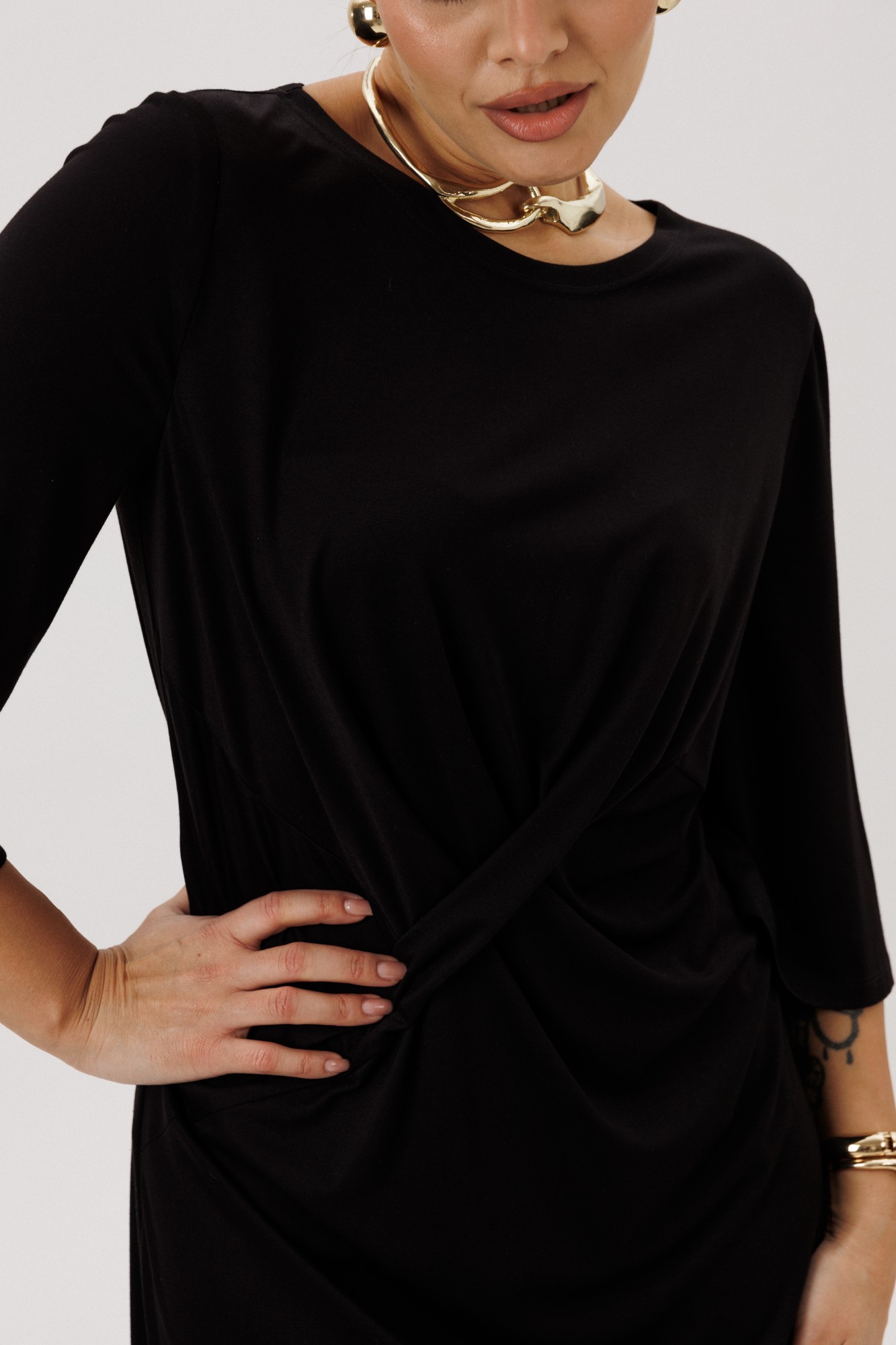 Модное платье в текущем сезоне заметно отличаются своей сдержанностью, элегантностью и женственностью! Это, пожалуй, и есть главный тренд сегодняшнего дня - проявляться и быть настоящей. Оно смотрится уместно всегда: мягкие линии и художественная драпировка придаёт ему изысканность и особый шарм, смелая конструкция со сложным подрезом - динамичность и современность. Полуприлегающий силуэт, втачной покрой, эффектный вырез лодочкой, рукав, расширенный внизу, длиной 3/4. Полочка со сложным ассиметричным подрезом и драпировкой. Спинка со средним швом и застёжкой-каплей.