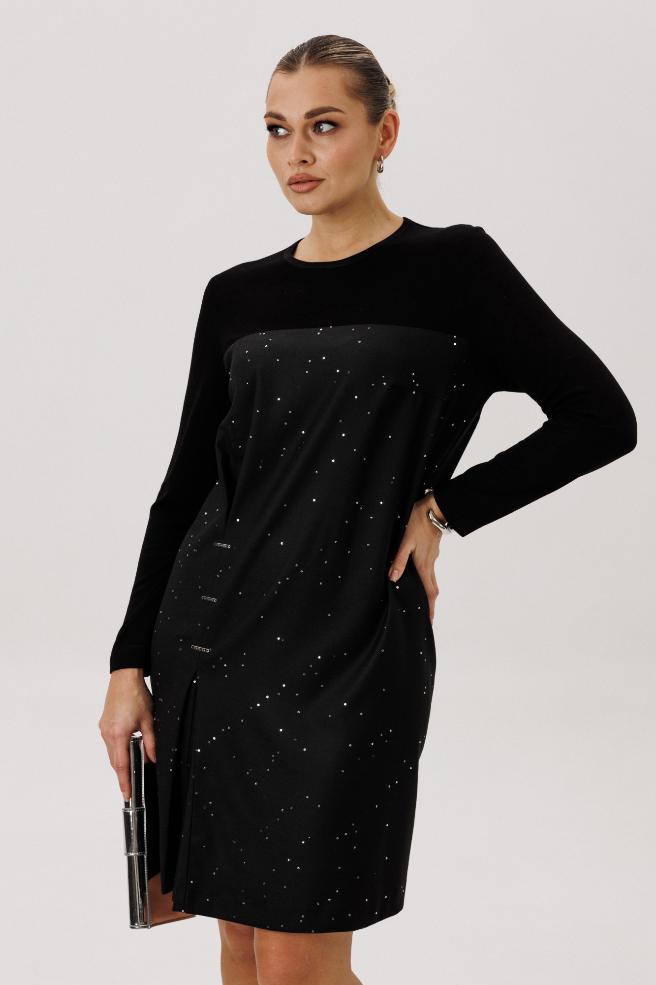 Платье остаётся неизменным символом женственности и элегантности, являясь ключевым элементом гардероба. Акцент - на многофункциональность! Это и самостоятельный наряд, и в дополнении с другими элементами одежды (жакеты) - гармоничный образ от вечернего выхода до повседневного. Свободный упрямлённый силуэт, втачной рукав, круглая горловина. Полочка с отрезной кокеткой, ассиметричным рельефом со встречной складкой и разрезом, нагрудной вытачкой. Спинка с центральным швом и отрезной фигурной кокеткой. Рукав зауженный, длинный. Кокетка полочки, спинка и рукава - из мягкого вискозного фактурного трикотажа. Полочка и спинка - из эффектного поливискозного полотна с лёгким вкраплением пайетки.