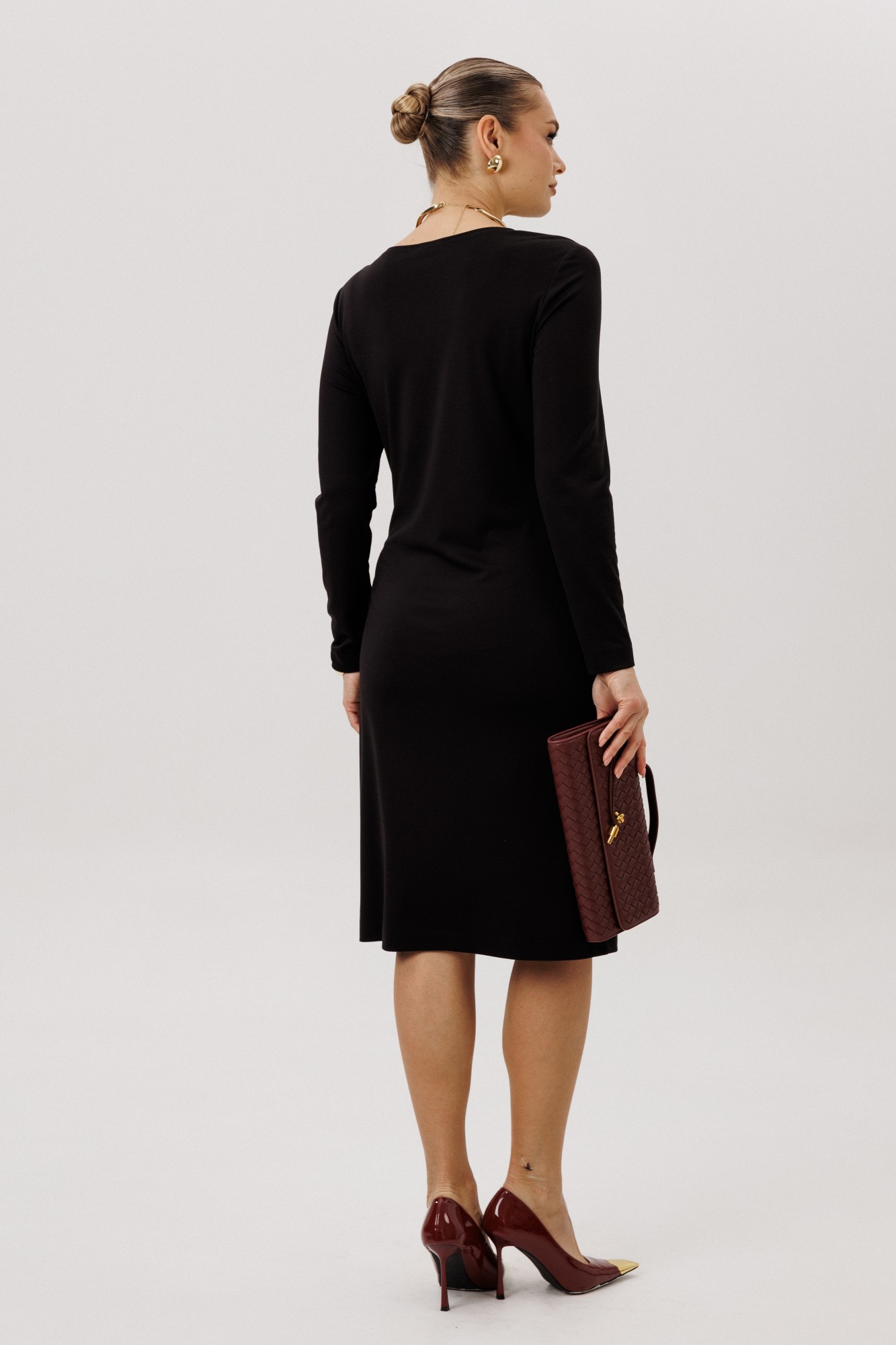 Драпировка - это ключевой элемент платья сезона 2025 г. Этот приём позволяет создать мягкий, женственный силуэт, при этом придаёт образу динамику. Расположенная в области талии она эффектно подчёркивает фигуру. Платье полуприлегающего силуэта, втачного покроя с круглым вырезом горловины и длинным рукавом. Комфортное вискозное полотно, средняя длина. Полочка с центральным швом и ассиметричным поясом-завязкой, образующим драпировку на правой половине. Рукав одношовный.