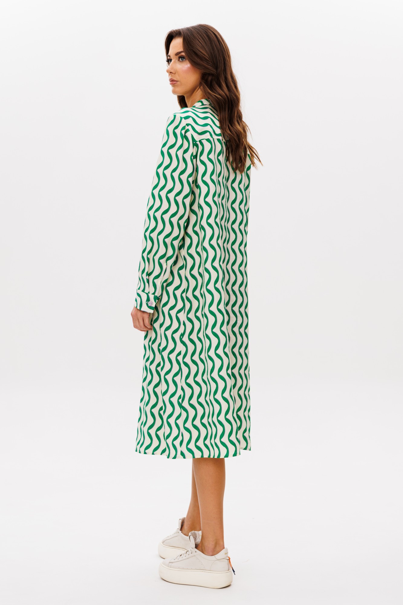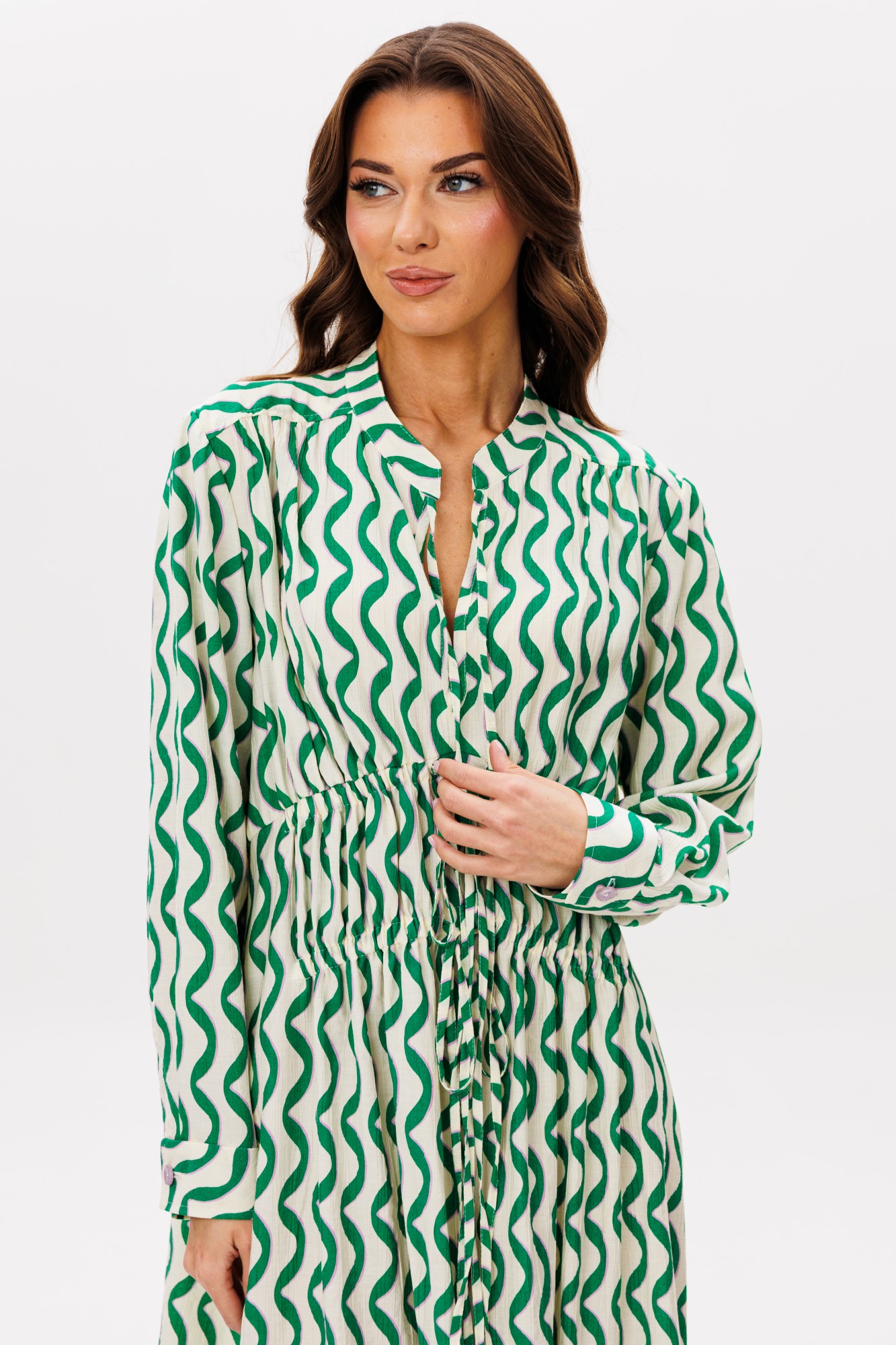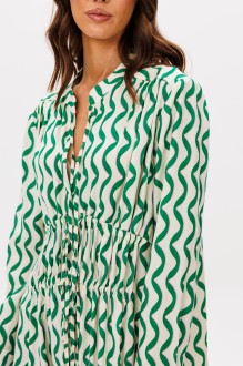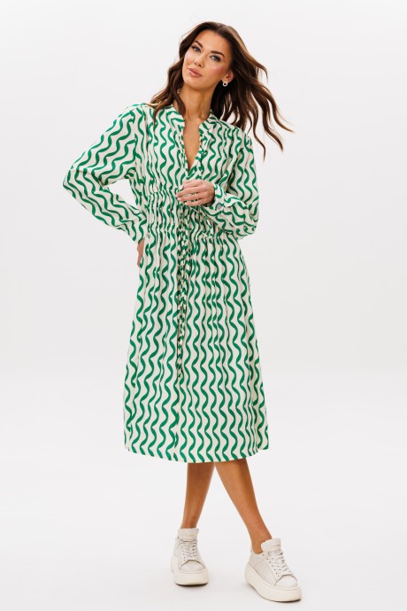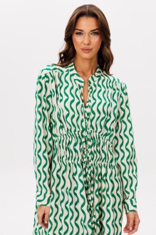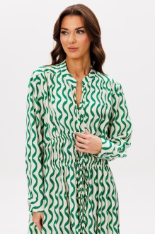 Мода - это всегда история. Летом 2025 года она расскажет нам о свободе, дерзости и немного о романтике. Платье становится ключевым элементом гардероба, предлагая нам баланс между удобством, женственностью и яркими акцентами. Комфортное вискозное полотно, необычный фасон и дерзкий принт. Свободный а-силуэт, втачной покрой, воротник-стойка, комфортный длинный рукав на манжете по низу. Полочка с отрезной кокеткой и диагональными кулисами, по линии ниже груди, с отделочными завязывающимися шнурами. Спинка с отрезной кокеткой. Рукав с разрезом и складкой по линии притачивания манжеты.