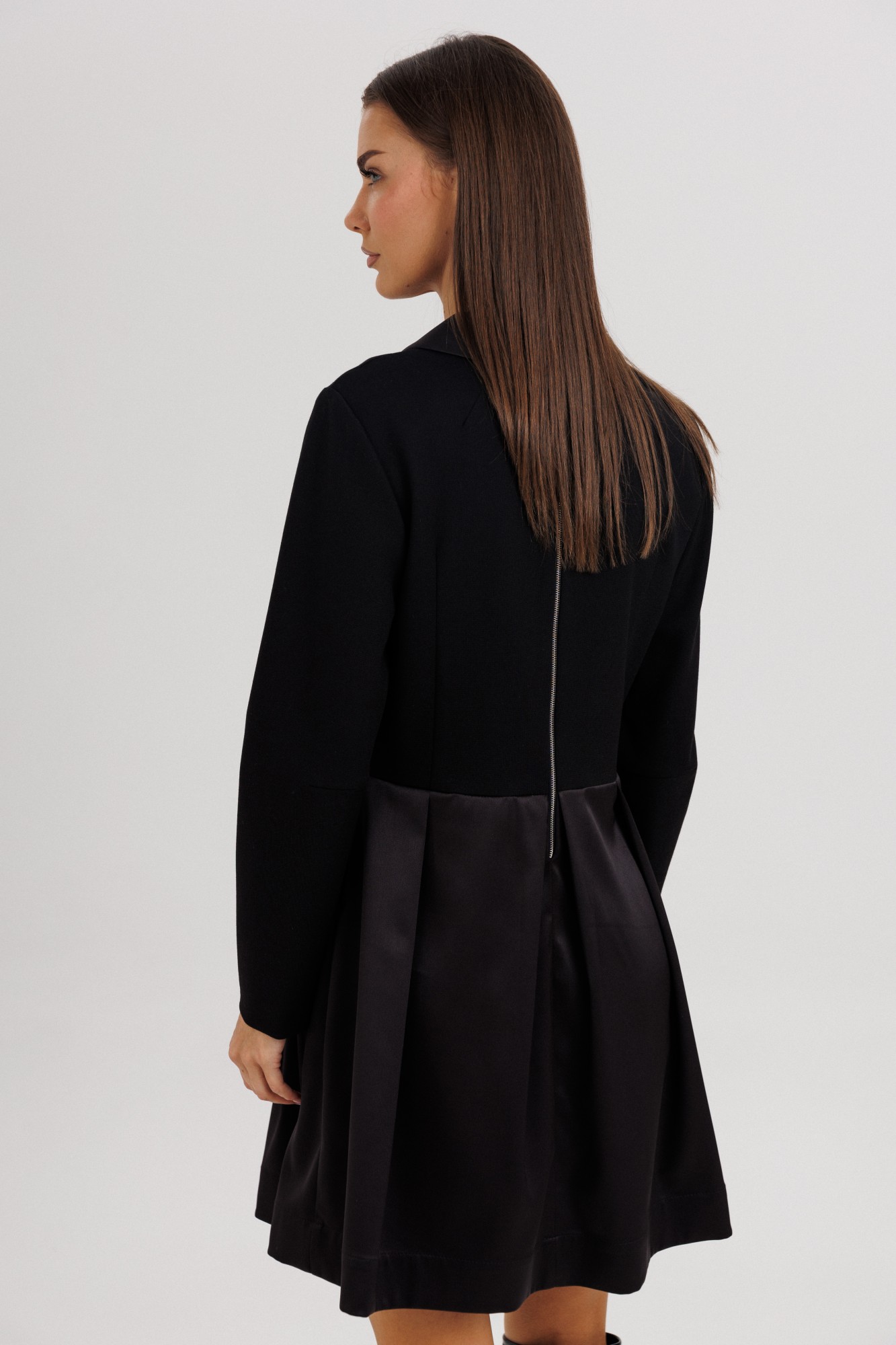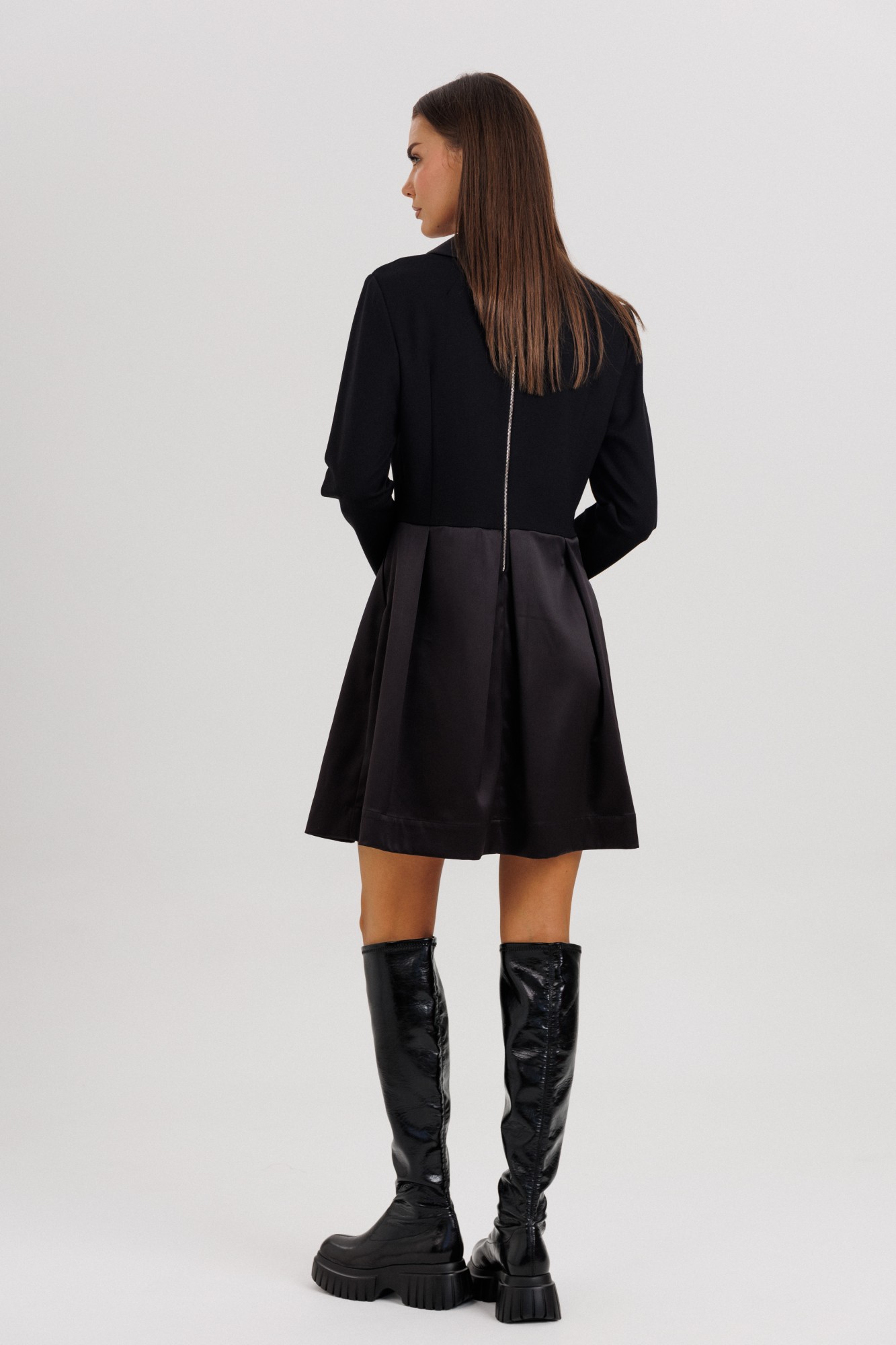 Элегантное платье прилегающего силуэта, созданное для тех, кто ценит стиль, утончённость и безупречное исполнение. Втачной крой гармонично подчеркивает фигуру, а акцентная отделка из атласного полотна придаёт образу изысканный блеск. Лиф платья выполнен с таллиевыми и нагрудной вытачкой, обеспечивая идеальную посадку, а юбка из гладкого атласа с мягкими складками создаёт лёгкий объём и женственный силуэт. На спинке — застёжка на отделочную молнию, добавляющая современный штрих. Идеальный вариант для вечернего выхода, торжественного ужина или стильного городского мероприятия.