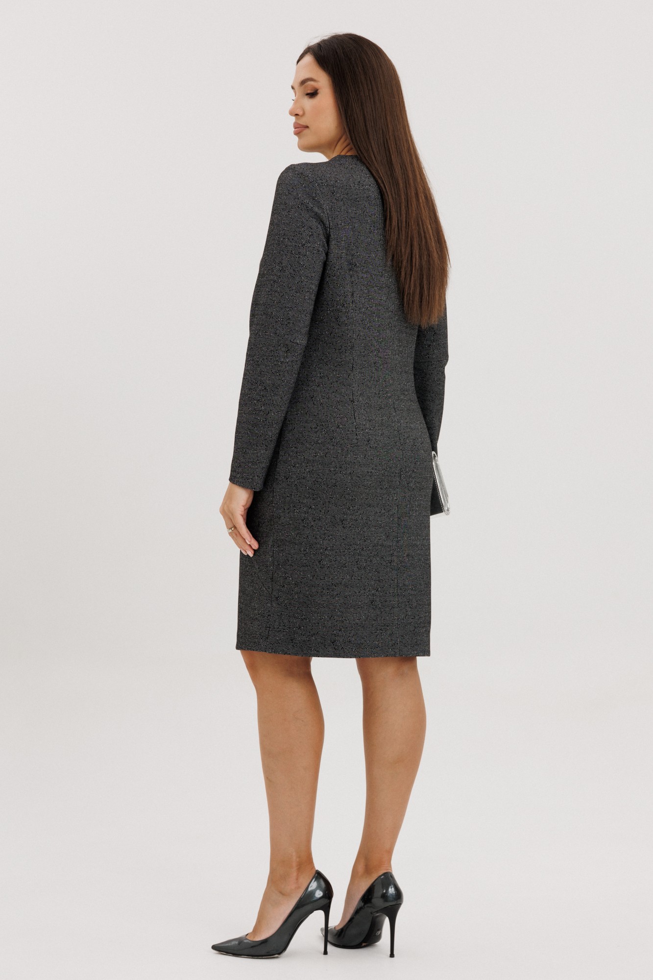 Стильное платье полуприлегающего силуэта втачного покроя создано для женщин, которые ценят комфорт и элегантность. Модель выполнена из мягкого трикотажного полотна с едва заметным вкраплением люрекса, что придаёт образу утончённое сияние и делает платье уместным как днём, так и вечером. Фигурные рельефы и втачные детали подчёркивают женственный силуэт, обеспечивая идеальную посадку по фигуре. Асимметричная декоративная молния добавляет современный акцент и визуально вытягивает линию тела. Длина чуть выше колена и длинные рукава делают платье универсальным — оно подойдёт для офиса, вечерних мероприятий и повседневных выходов. Особенности модели: Полуприлегающий силуэт, втачной покрой. Трикотажное полотно с лёгким блеском люрекса. Асимметричная декоративная молния. Комфортная длина выше колена. Универсальный стиль: офис, вечер, город.