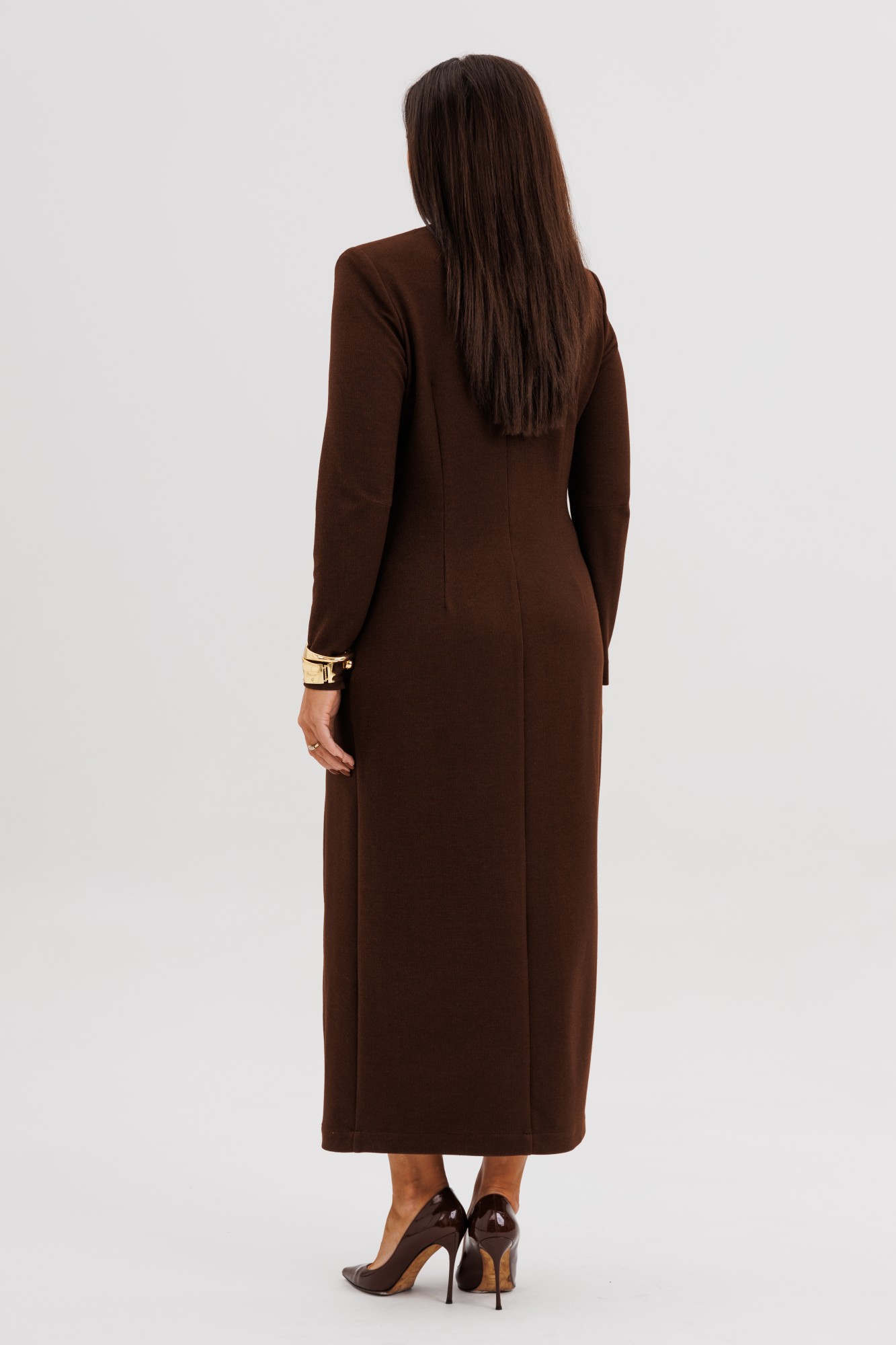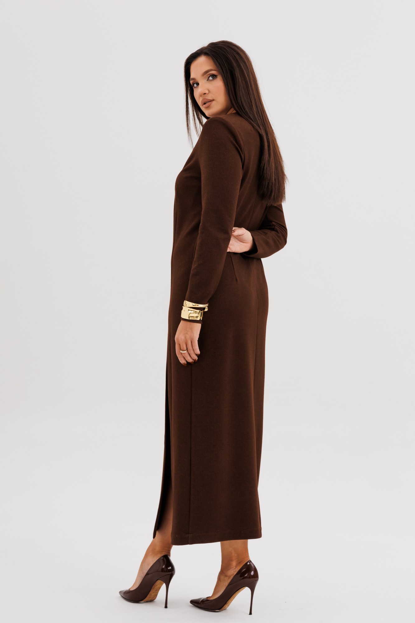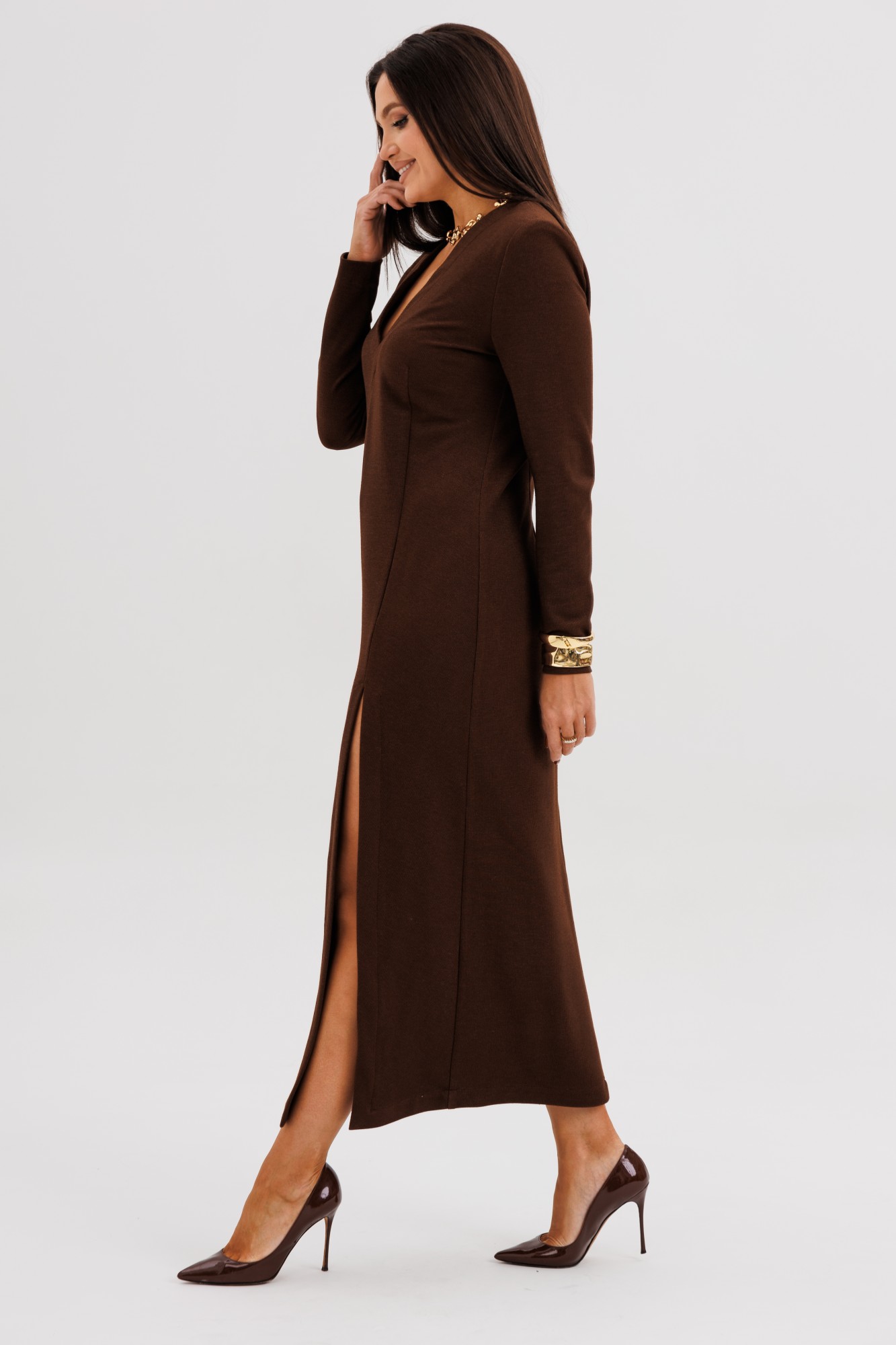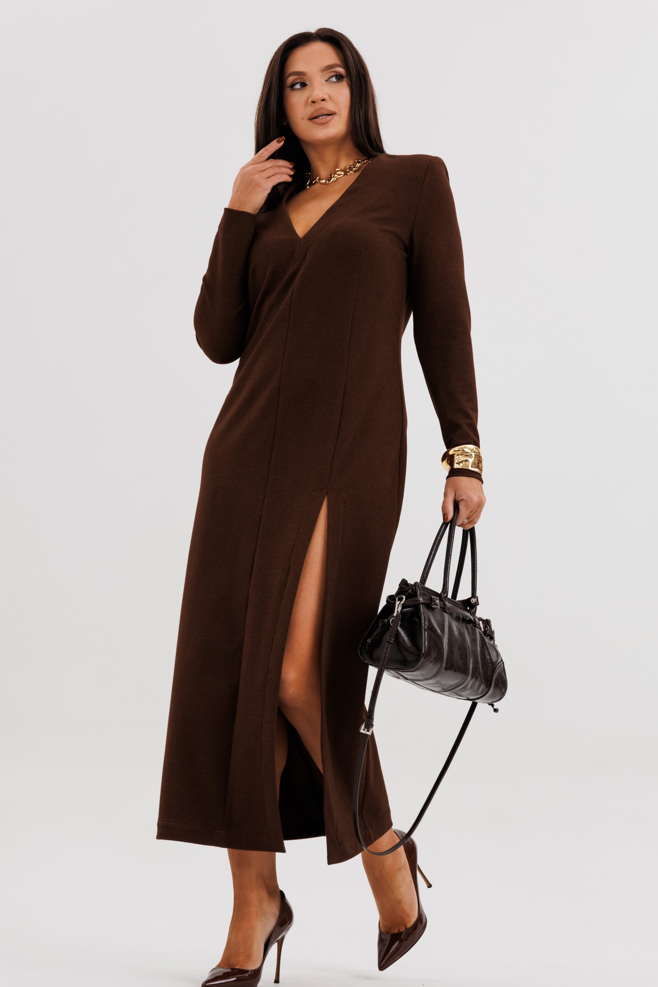 Шикарное платье из мягкого трикотажного полотна с едва заметным вкраплением люрекса — идеальное сочетание комфорта и элегантности. Втачной крой с лёгким прилеганием подчёркивает силуэт, а асимметричный рельеф визуально вытягивает фигуру, добавляя образу динамики. Глубокий V-вырез создаёт женственный акцент, а эффектный разрез спереди придаёт образу уверенность и утончённую привлекательность. Это платье станет безупречным выбором как для особого случая, так и для стильного выхода в город — достаточно добавить любимые украшения и обувь на каблуке.