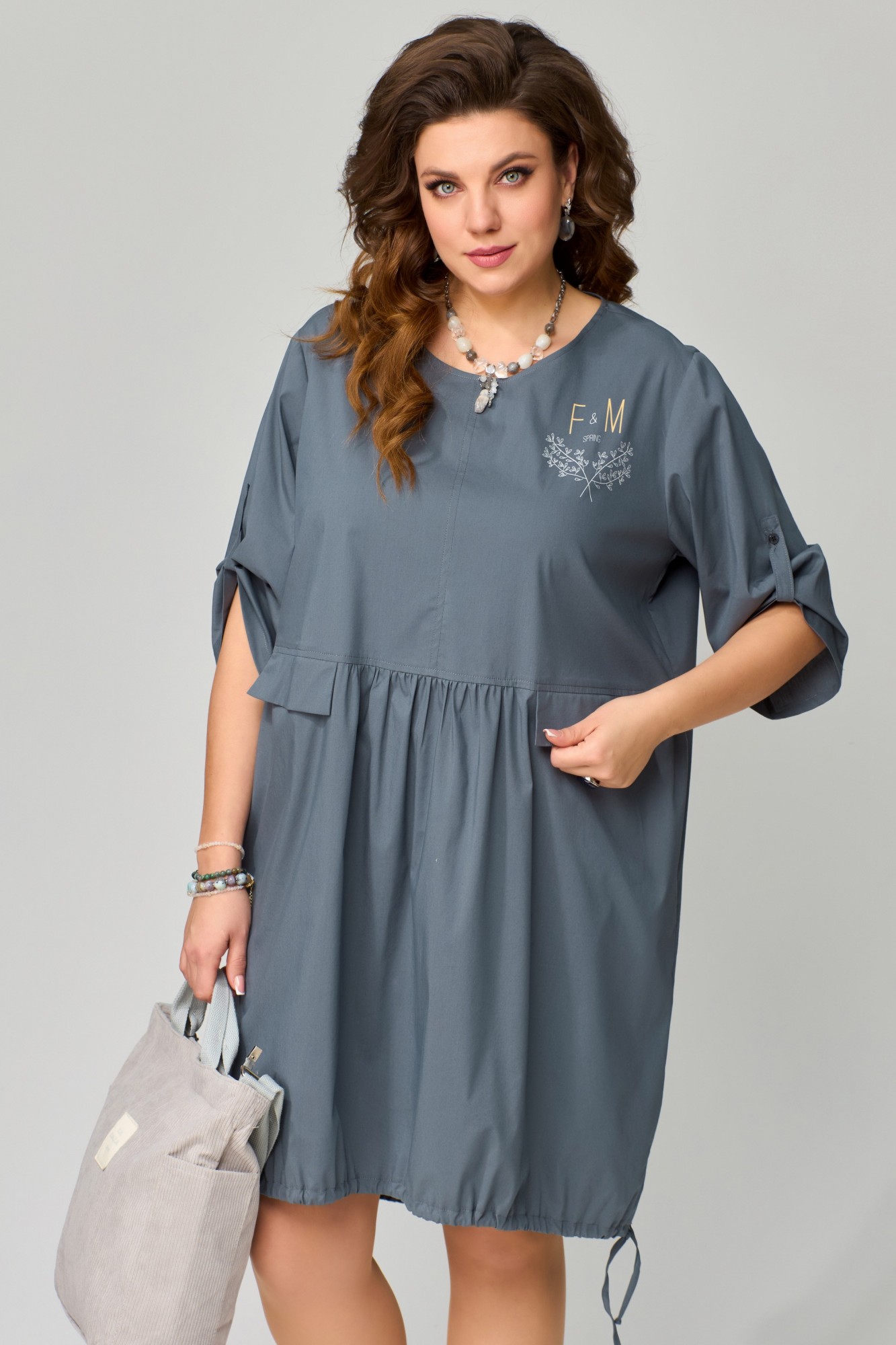 Платье женское "Саедана", оверсайз. Длина по переду выше колена, спинка удлиненная. Низ собран на кулису. По талии подрез со сборкой, в котором обработаны карманы с клапанами. Рукав втачной, длина 3/4. Длина рукава регулируется патой. Линия плеча спущена. Горловина круглая, обработана притачной бейлой. Украшение в комплект не входит.