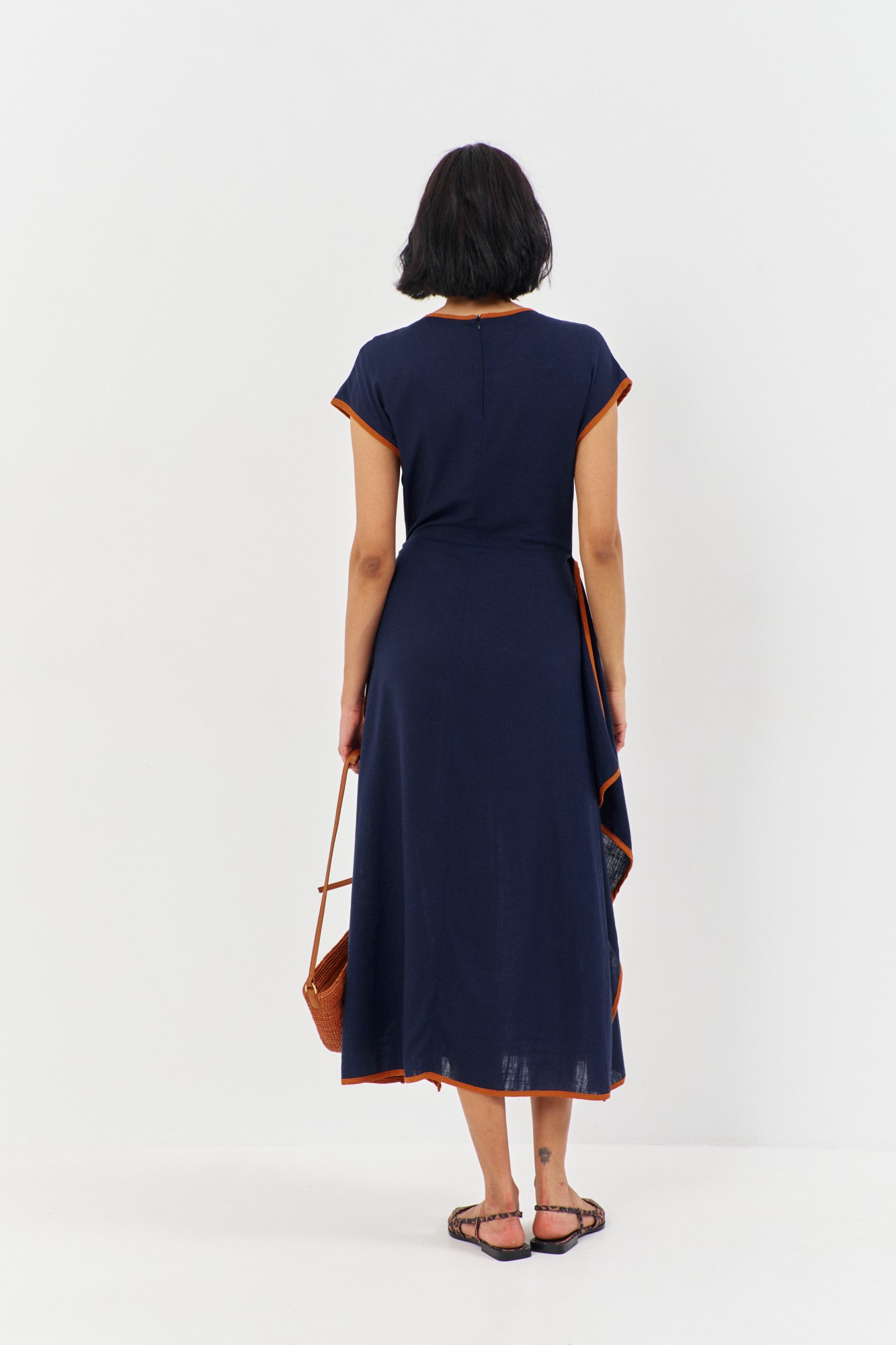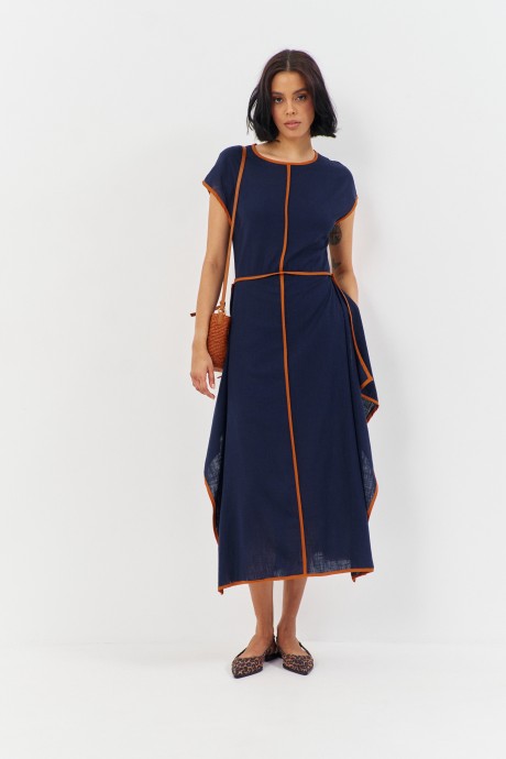 Платье прямого силуэта. Характеристики: выполнено из плательной ткани "под лен" в синем цвете с отделочными окантовками, в боковых швах карманы, спинка разрезная на потайную застежку-молнию.
