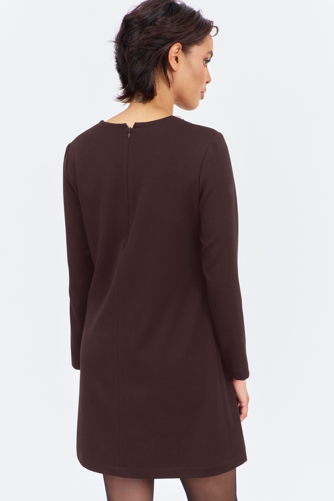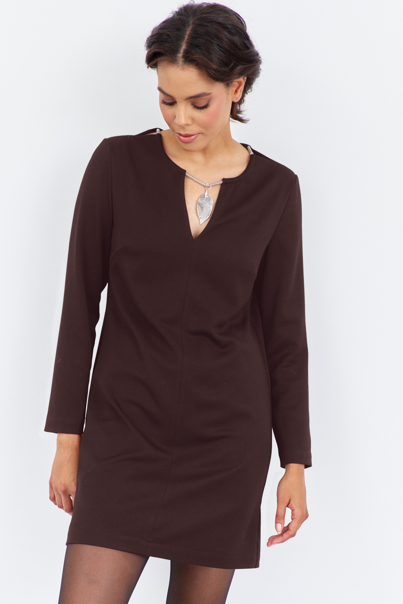 Платье прямого силуэта. Характеристики: выполнено из плательной ткани в черном цвете, по горловине переда и спинки декоративный элемент с цепочкой и подвеской, спинка разрезная на потайную застежку-молнию.