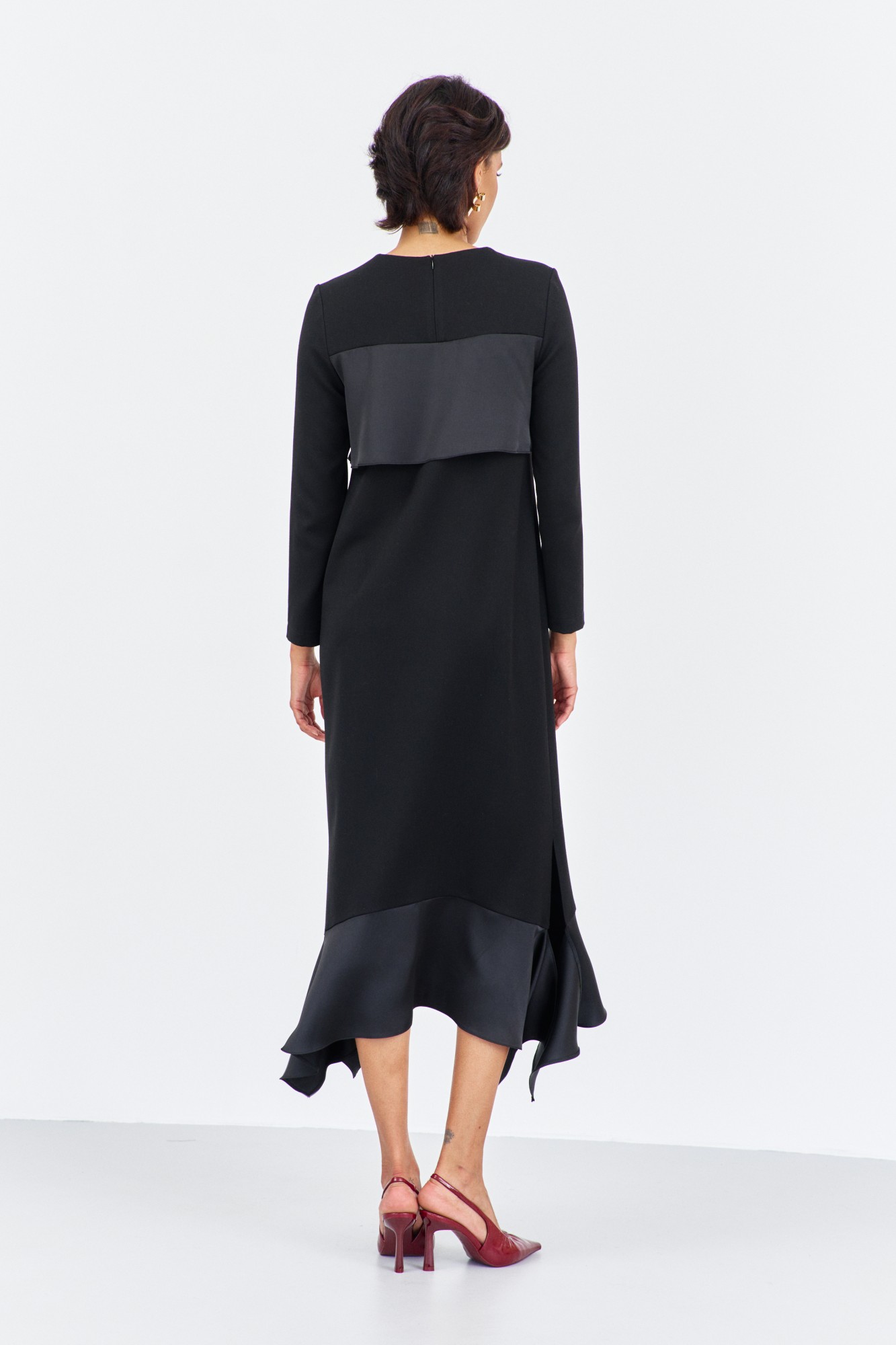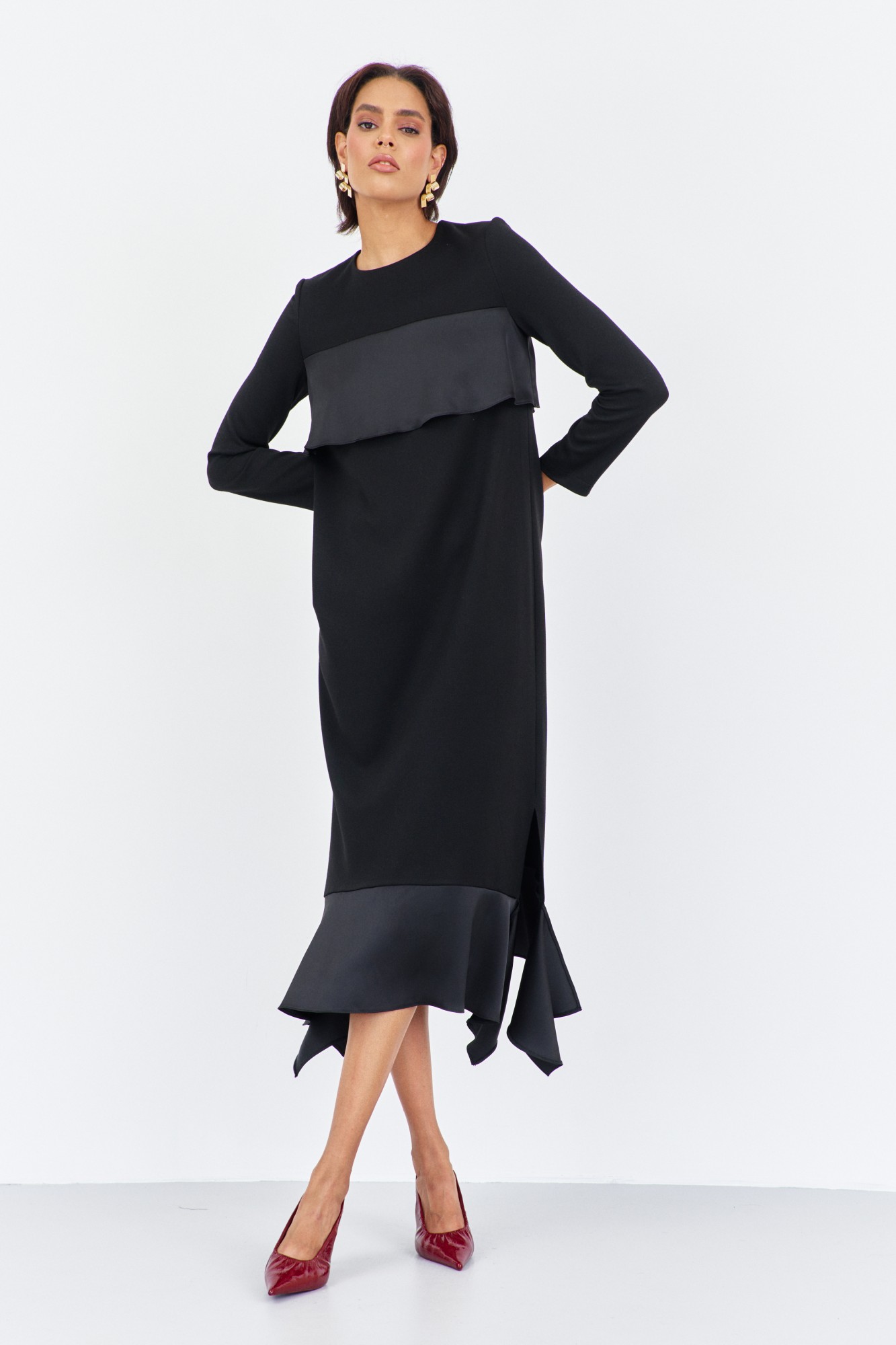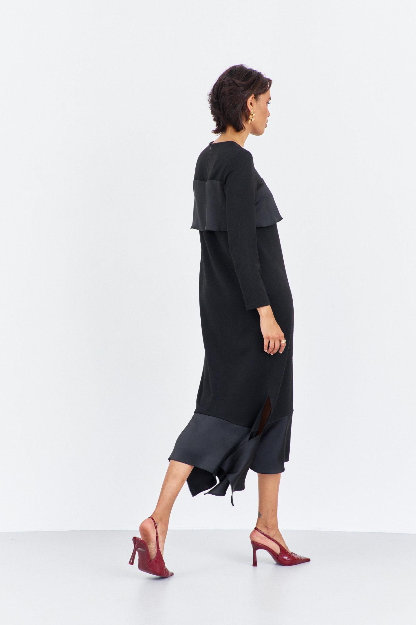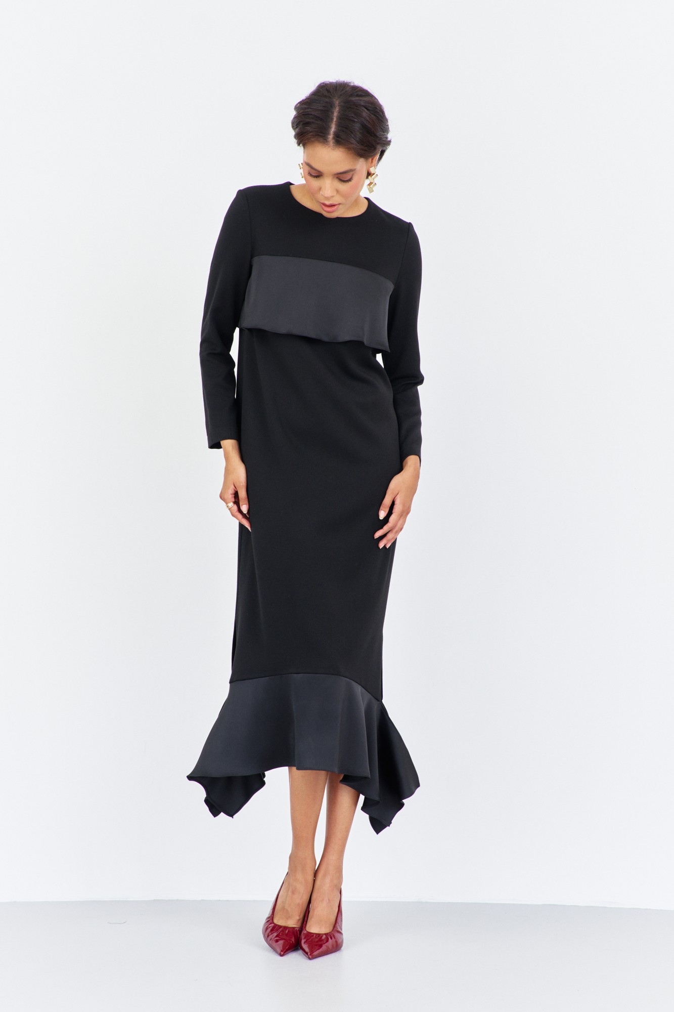 Платье прямого силуэта с воланами. Характеристики: выполнено из плательной ткани в черном цвете, по кокетке и низу платья декоративные воланы из атласной ткани, спинка разрезная на потайную застежку-молнию.