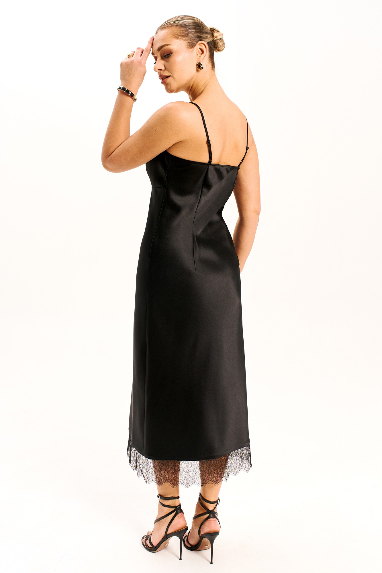 Платье - миди прилегающего силуэта выполнено из струящегося шелк - сатина на регулируемых бретелях и молнией в боковом шве. Подрезы по линии груди и низу платья дополнены мягким французским кружевом, которое держит форму. Платье полностью соответствует заявленному размеру. Пожалуйста, пользуйтесь таблицей замеров готового изделия, чтобы подобрать идеальный размер.