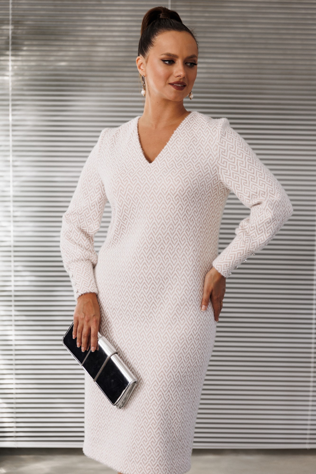 Платье женское, трикотажное полуприлегающего силуэта. v-образным вырезом по переду. Со средним швом заканчивающиеся разрезом. Рукава прямые собирающиеся с низу на манжет. Платье длиной ниже линии колена. На манжетах нашиты 4 декоративные пуговицы.